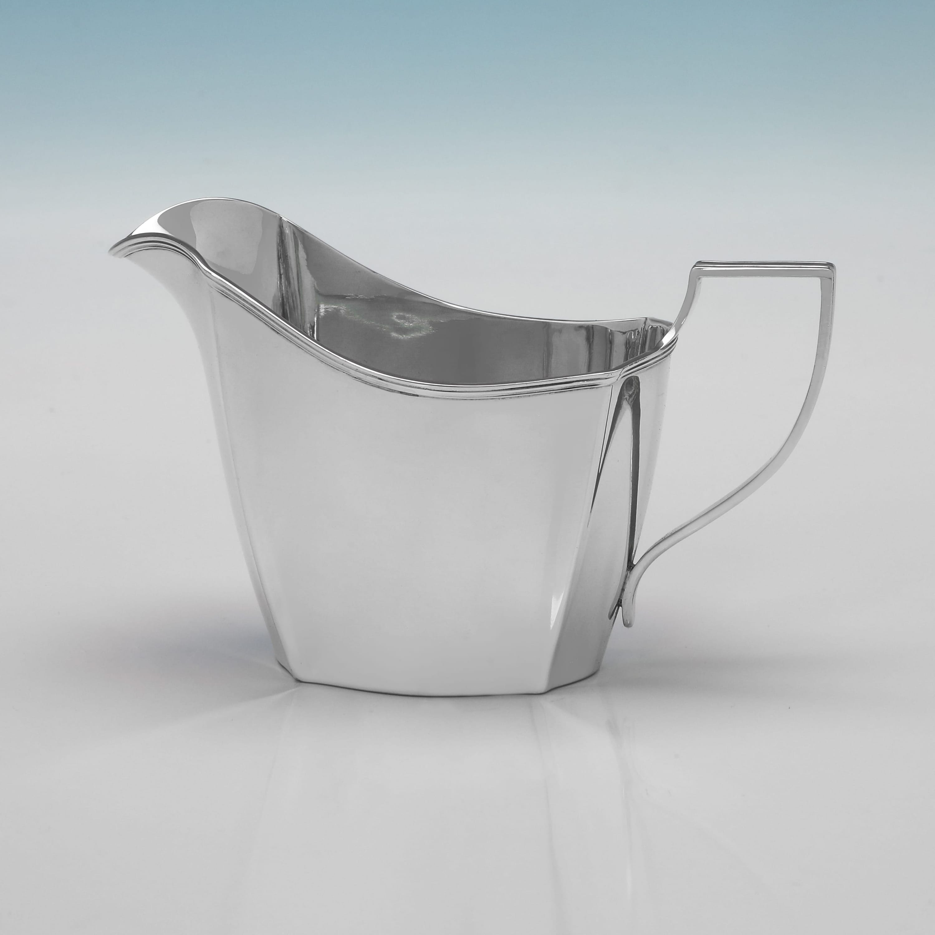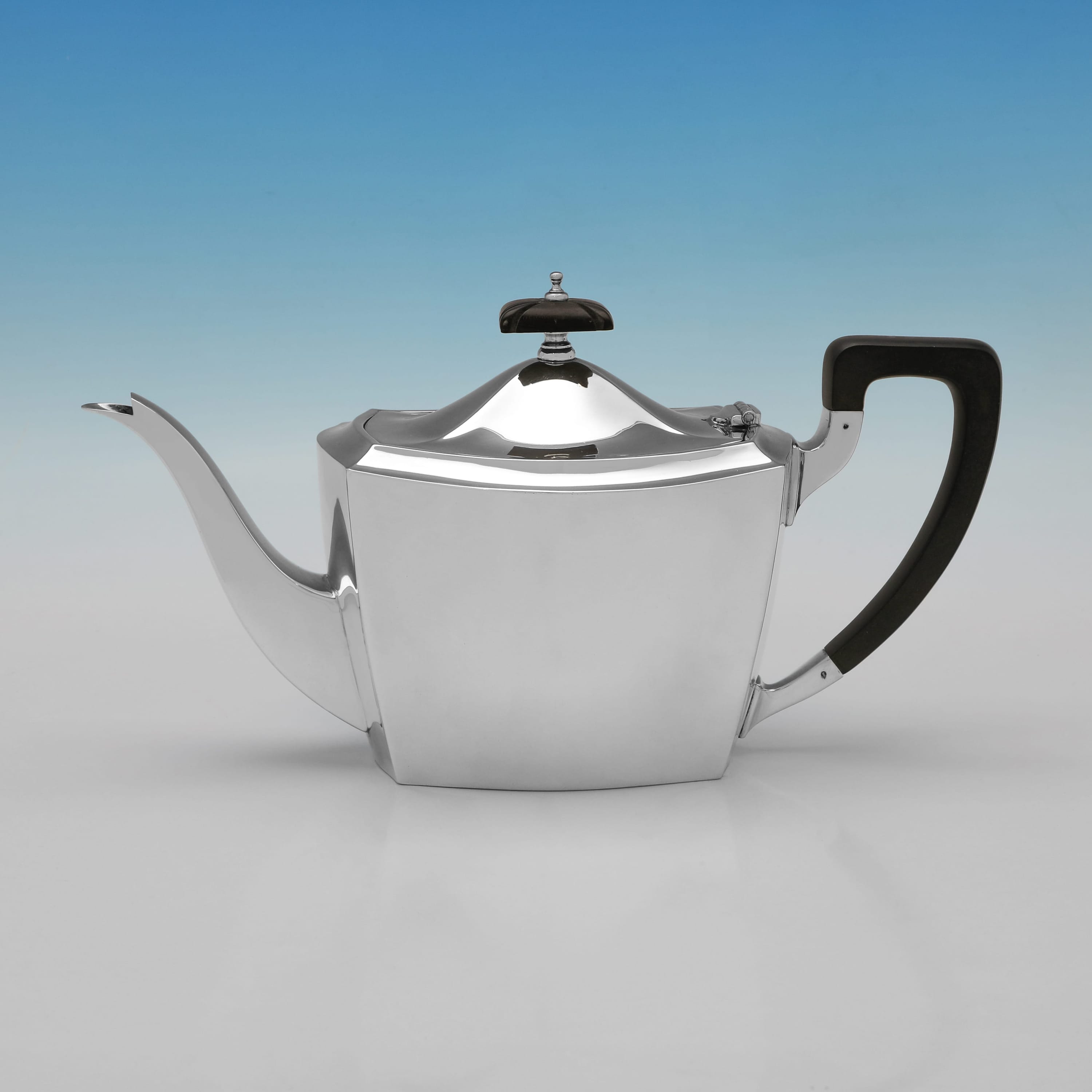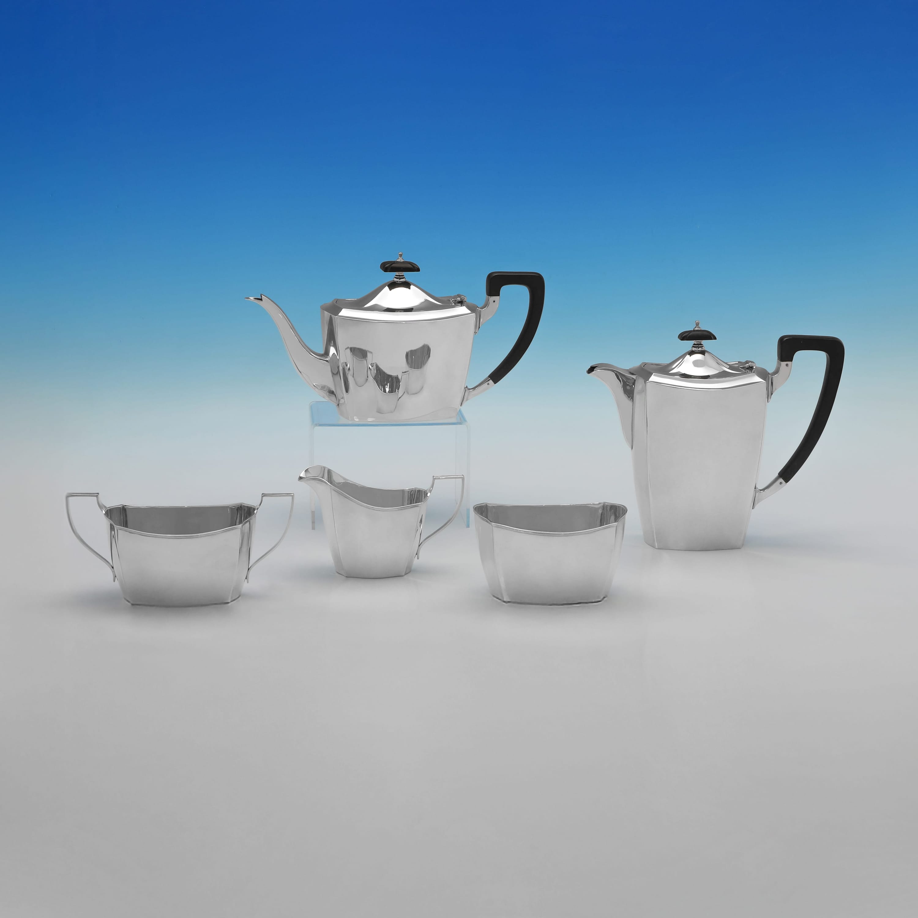 b3234: Hallmarked in Birmingham between 1939 and 1946 by Barker Brothers Ltd. this architectural George VI sterling silver five-piece tea set is of a fine Art Deco design. The pieces have a polished surface and a geometric, tapering form. The teapot and coffee pot are fitted with ebonised wooden handles and finials, while the sugar bowl and cream jug have plain angular handles. The set is complete with a waste bowl. The set has a combined weight of 67 Troy Ounces.