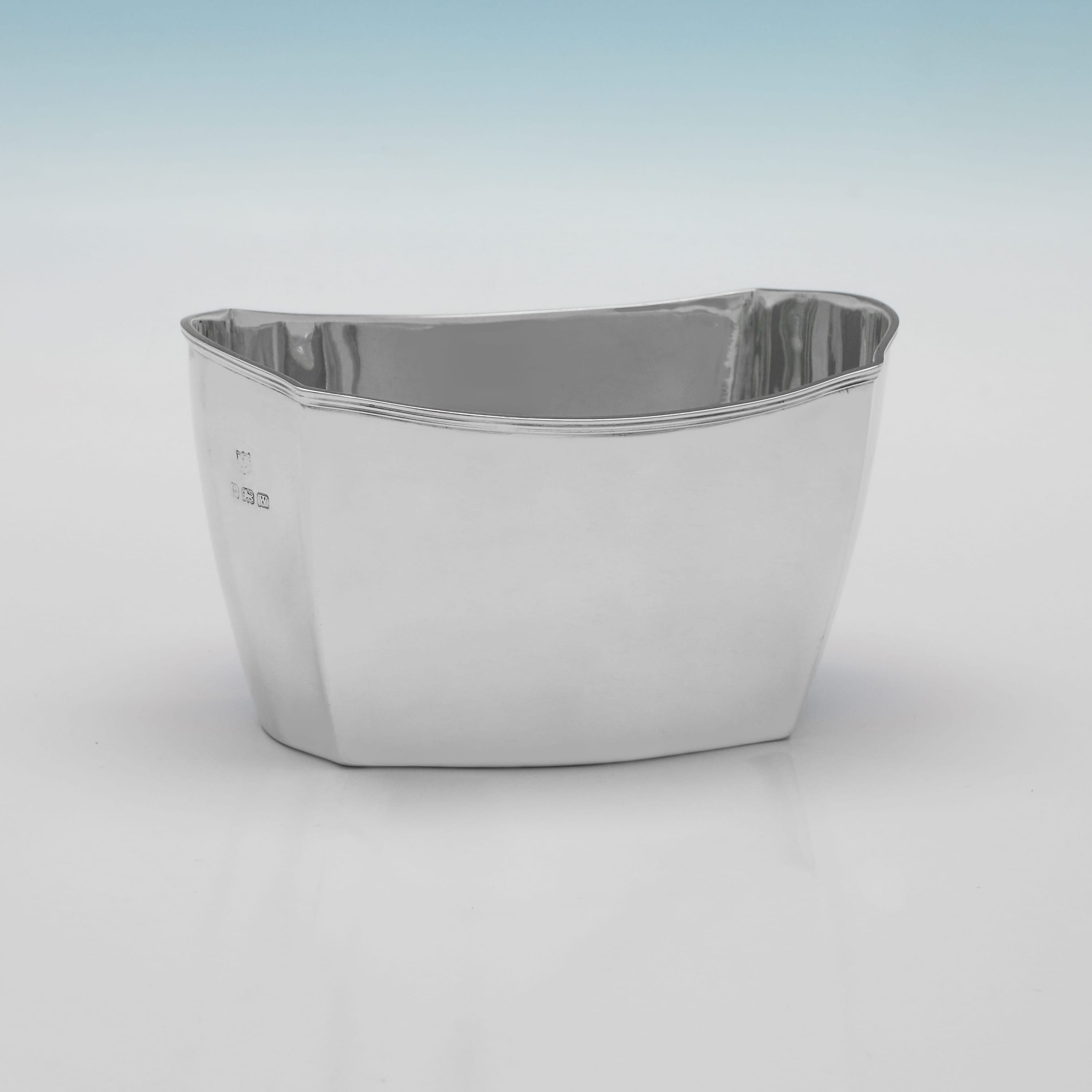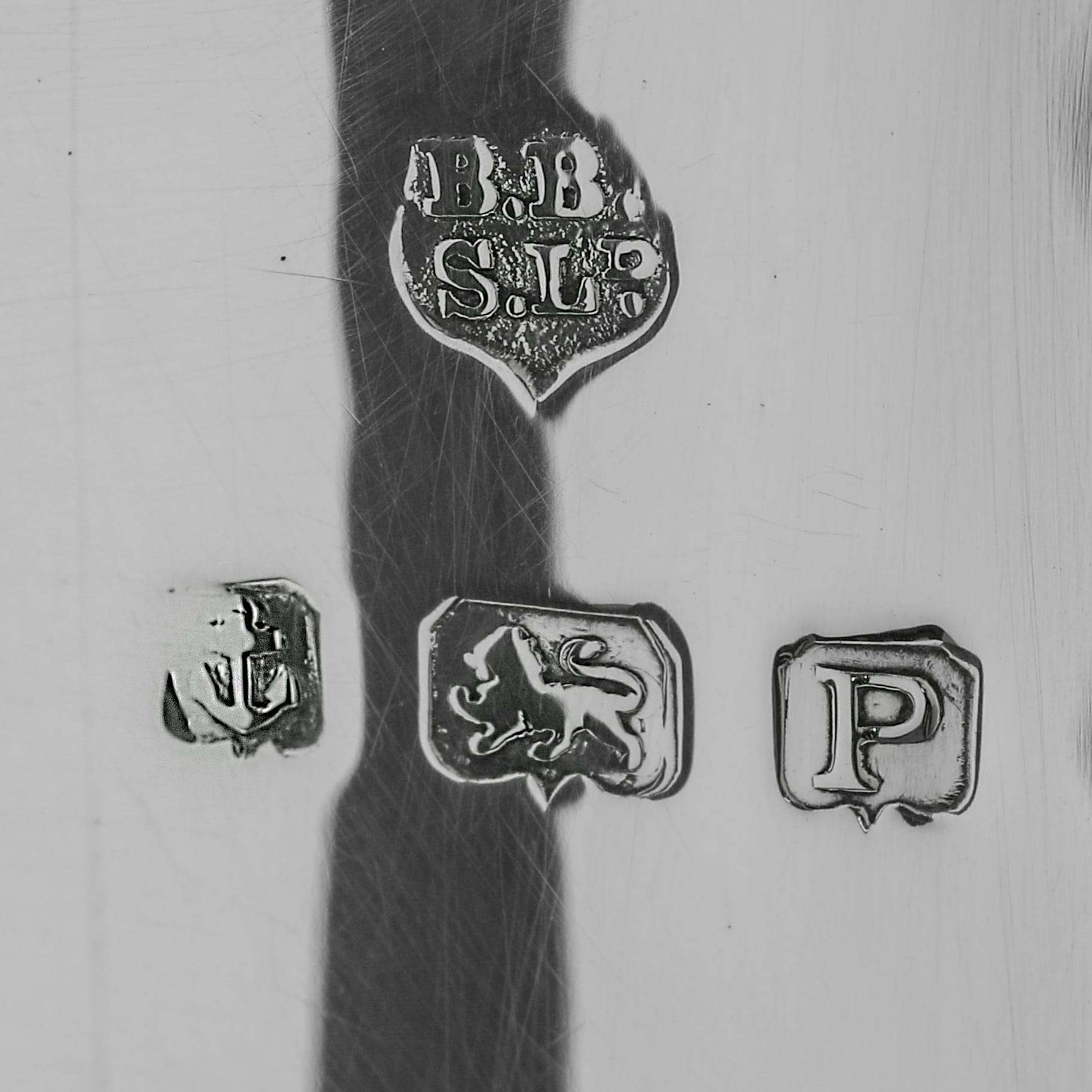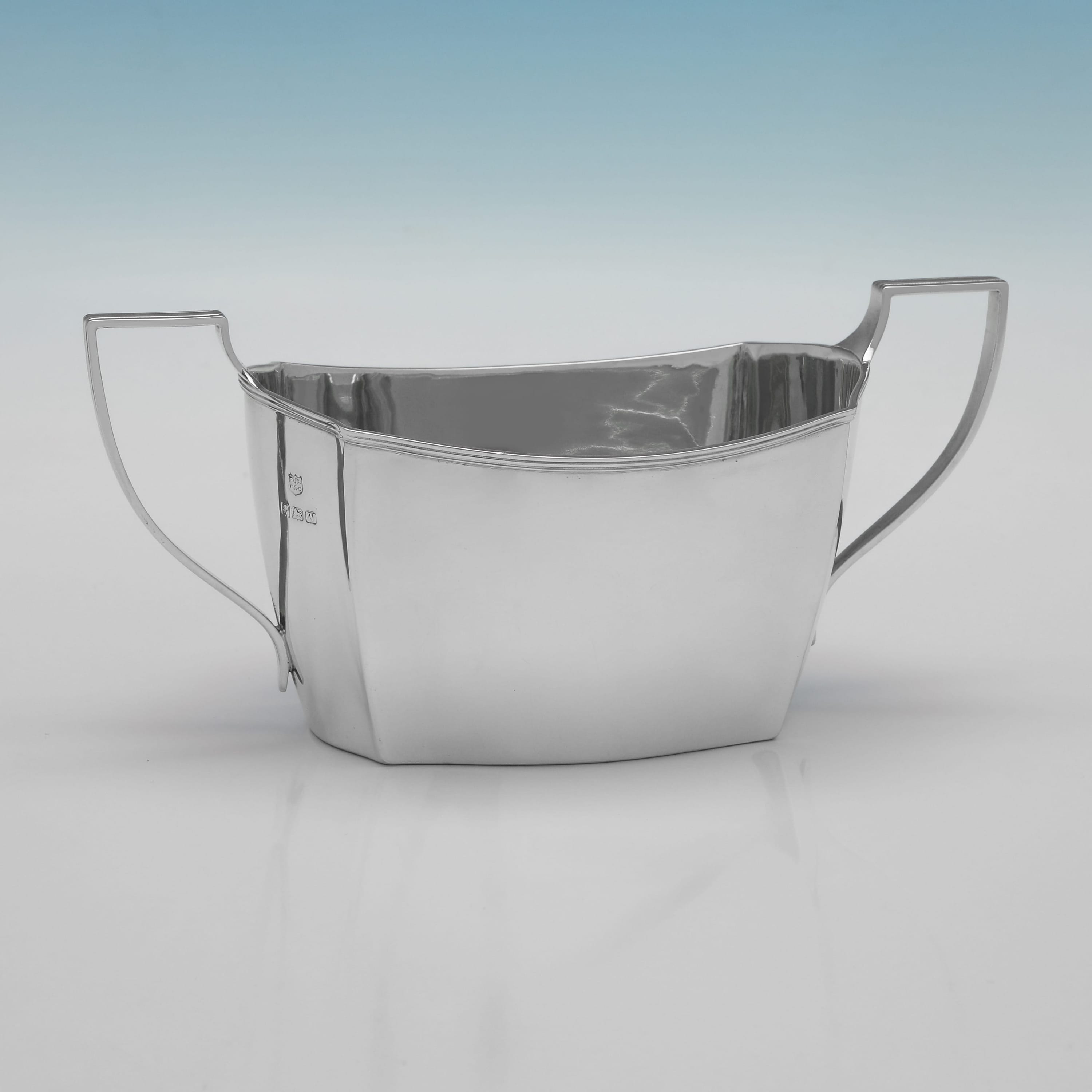 b3234: Hallmarked in Birmingham between 1939 and 1946 by Barker Brothers Ltd. this architectural George VI sterling silver five-piece tea set is of a fine Art Deco design. The pieces have a polished surface and a geometric, tapering form. The teapot and coffee pot are fitted with ebonised wooden handles and finials, while the sugar bowl and cream jug have plain angular handles. The set is complete with a waste bowl. The set has a combined weight of 67 Troy Ounces.