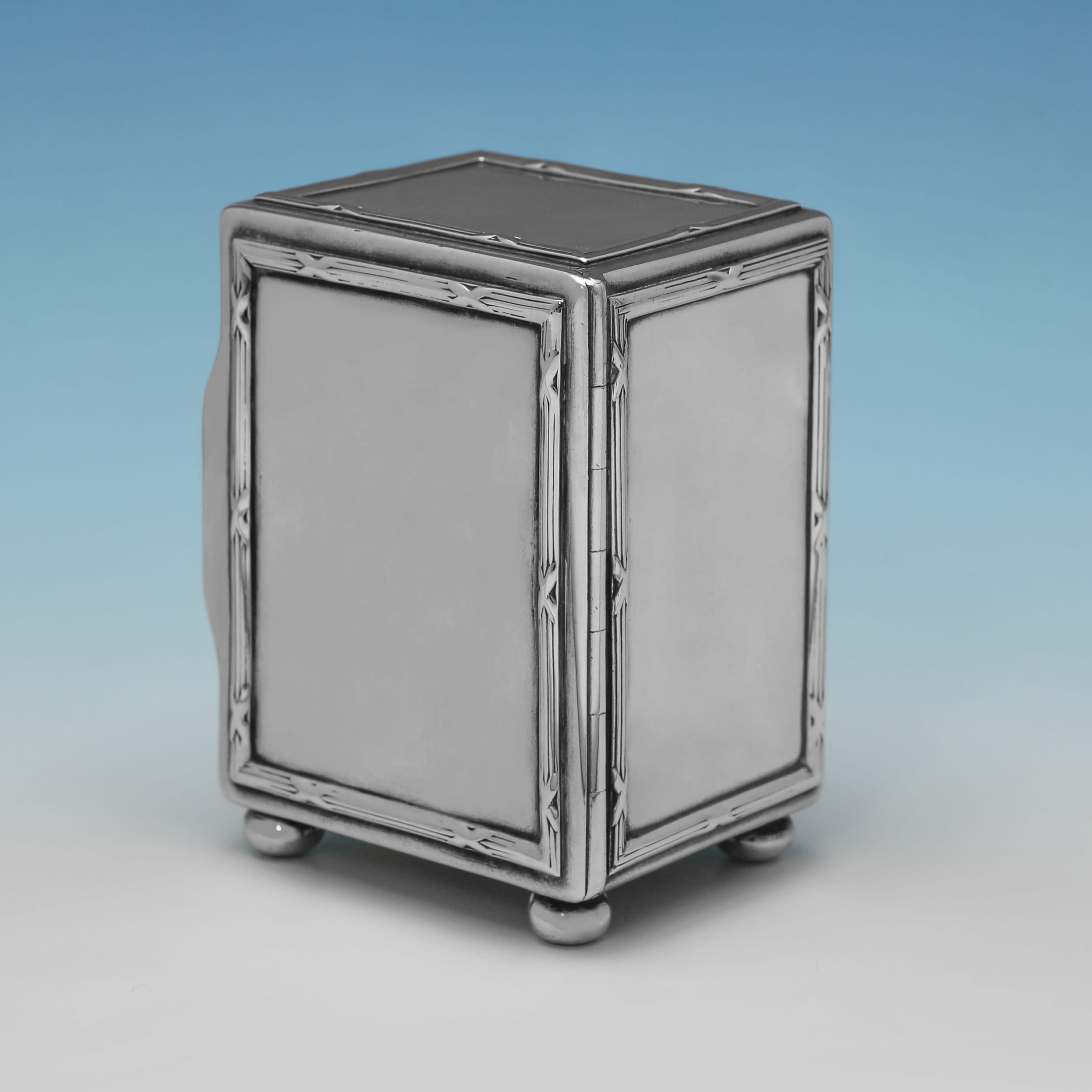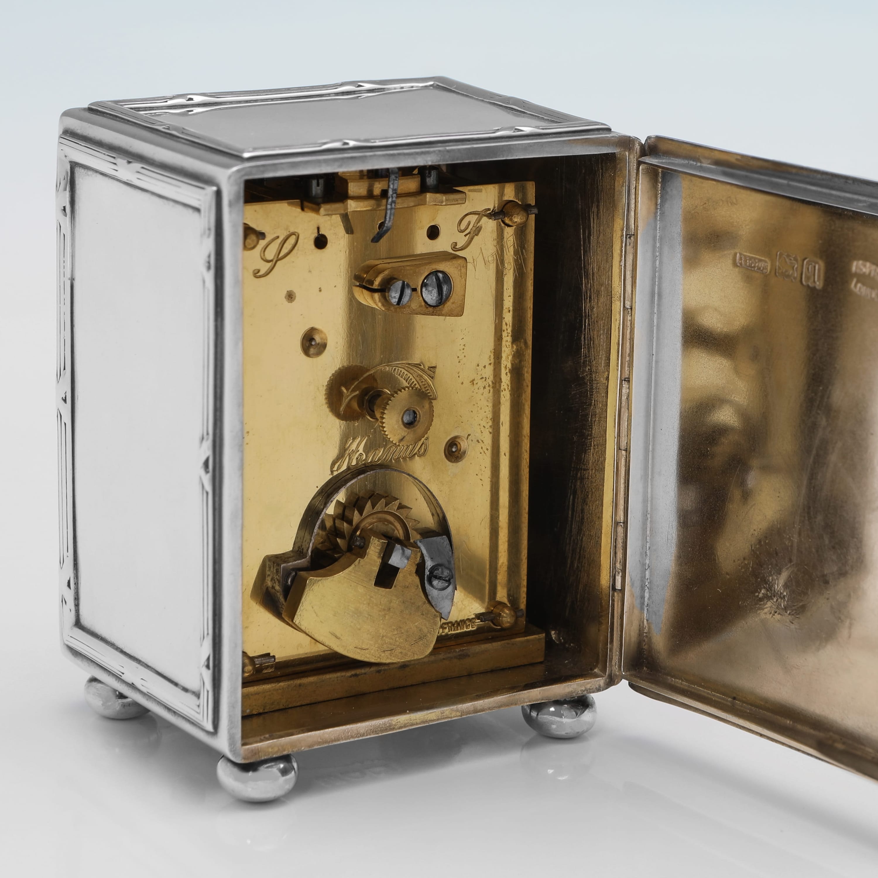b5711: Hallmarked in London in 1911 by Asprey & Co. Ltd. this elegant George V antique sterling silver carriage clock is of a rectangular case form with a ribbon & reed border to the panels and stands on four ball feet. The clock has a white enamel dial with Roman numerals, a gold-plated bezel, and a movement of French origin. It measures 3"(7.5cm) tall, by 2.25"(5.5cm) wide and 1.75"(4.5cm) deep.