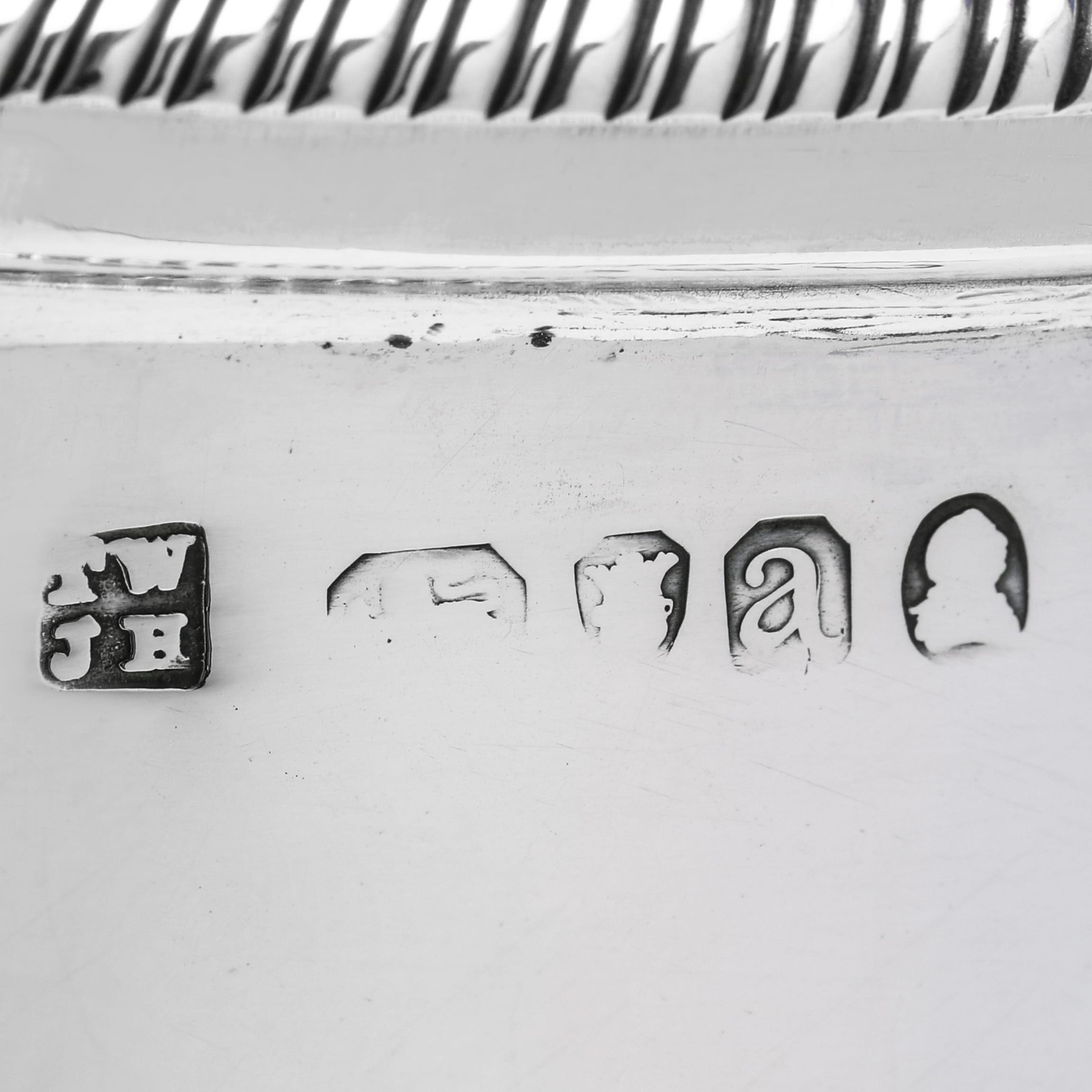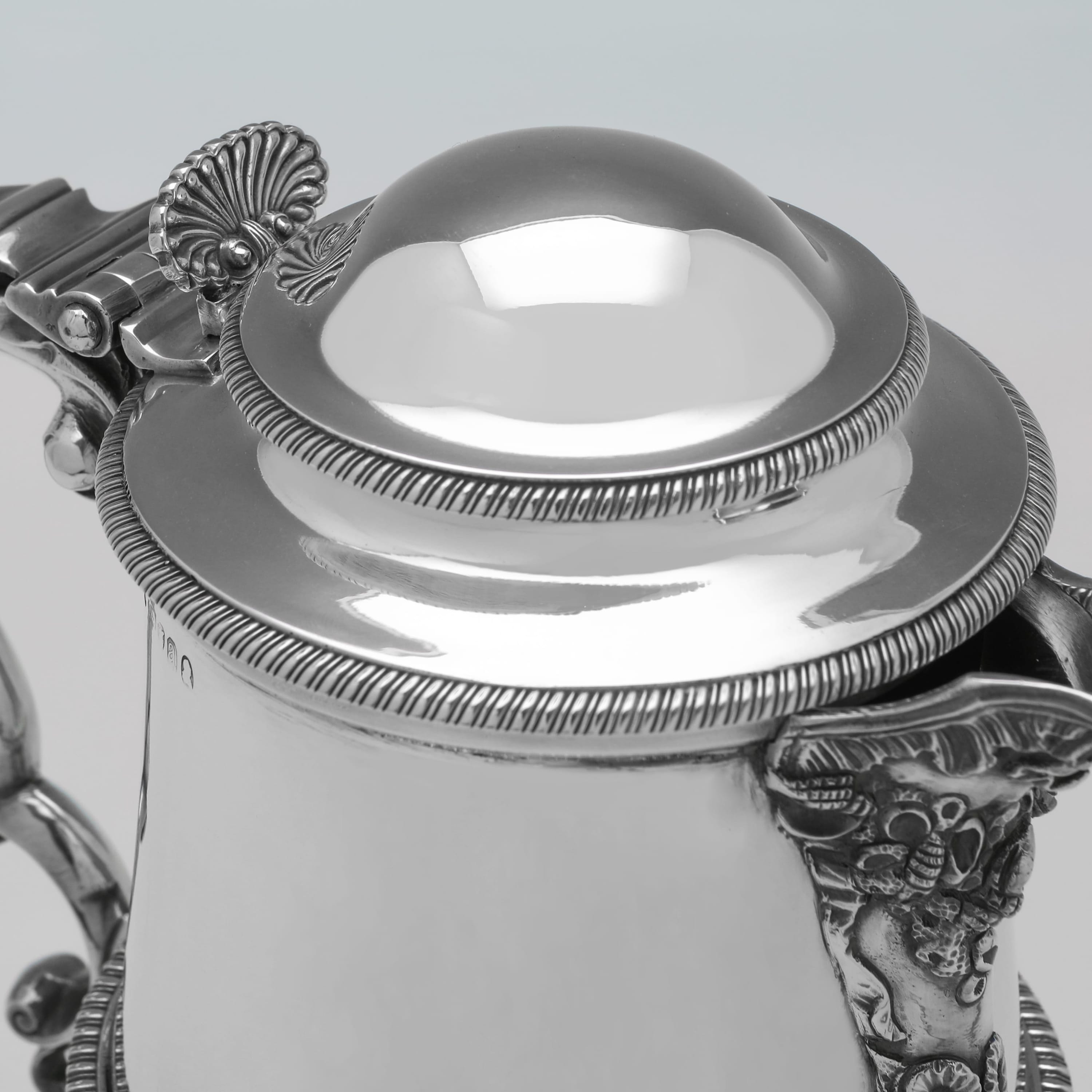 b7893: Hallmarked in London in in 1816 by Thomas Wallis II & Jonathan Hayne, this Regency Period, Antique Sterling Silver Water Jug or Beer Jug, features gadroon borders, an engraved crest to one side, and an ornate spout. The water jug measures 8" (20.5cm) tall, by 8.5" (21.5cm) from handle to spout and weighs 34 troy ounces.