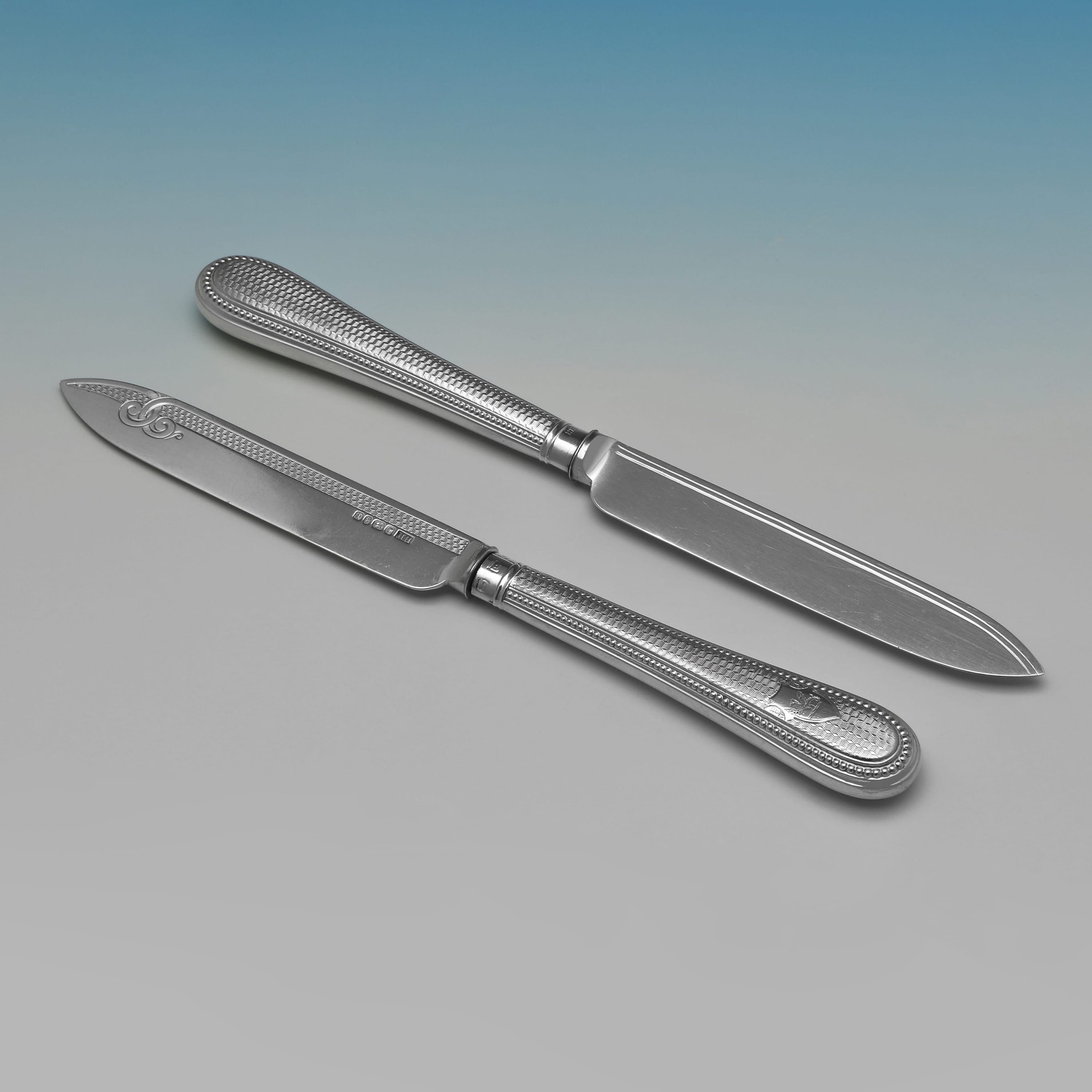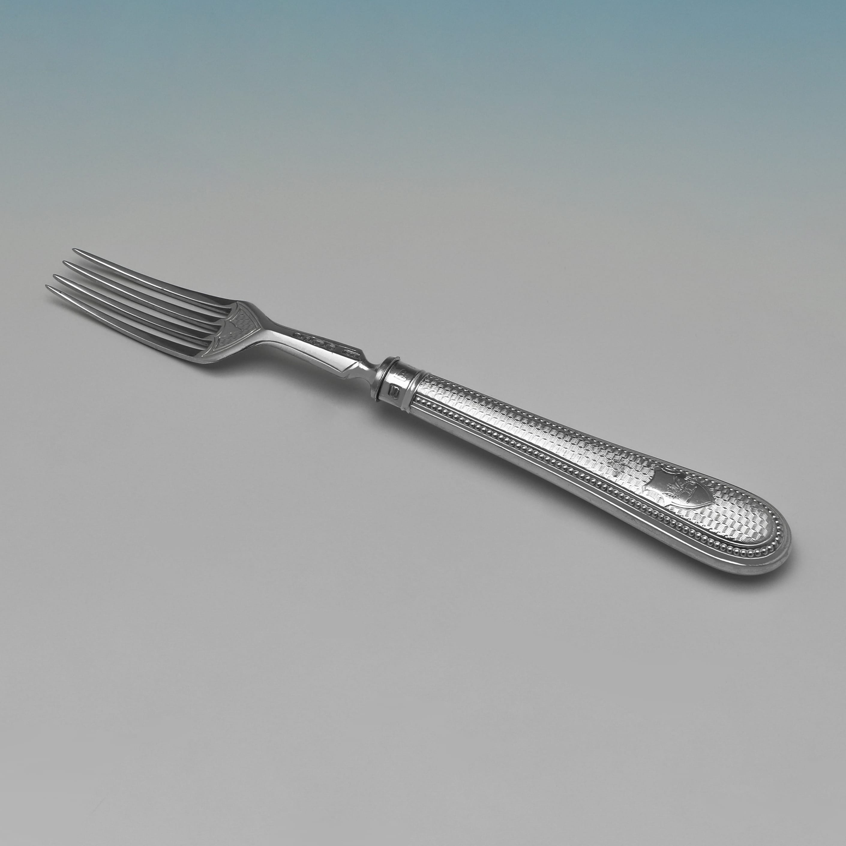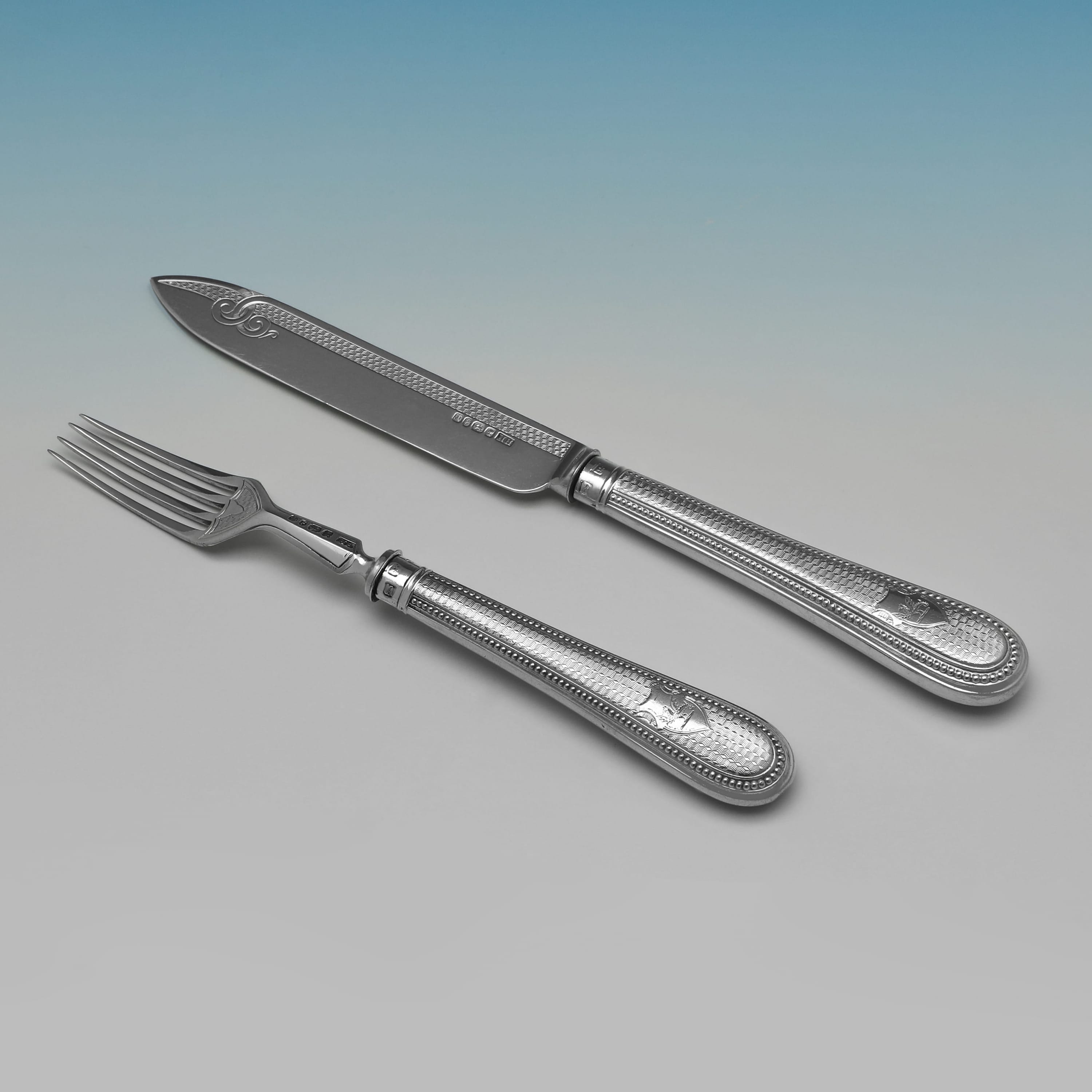 b9319: Hallmarked in Sheffield in 1873 by Henry Harrison, this striking, Victorian, Antique Sterling Silver Dessert Set, comprises 18 place settings, all with engine turned decoration and bead borders. Each piece is engraved with the crest of a griffin, and the set is presented in the original wooden box. Each knife measures 8.5"(21cm) in length, and each forks measures 7"(18cm) in length.