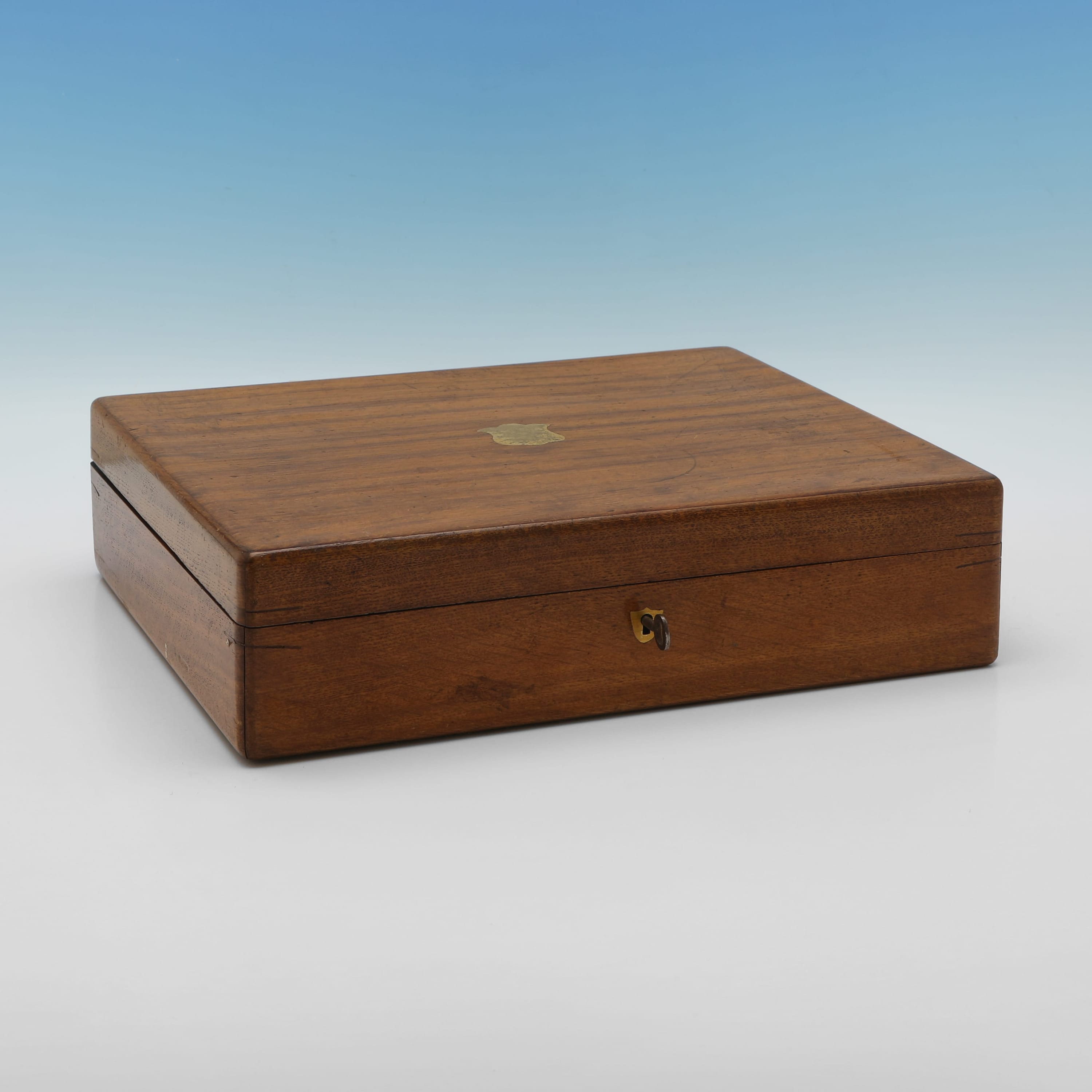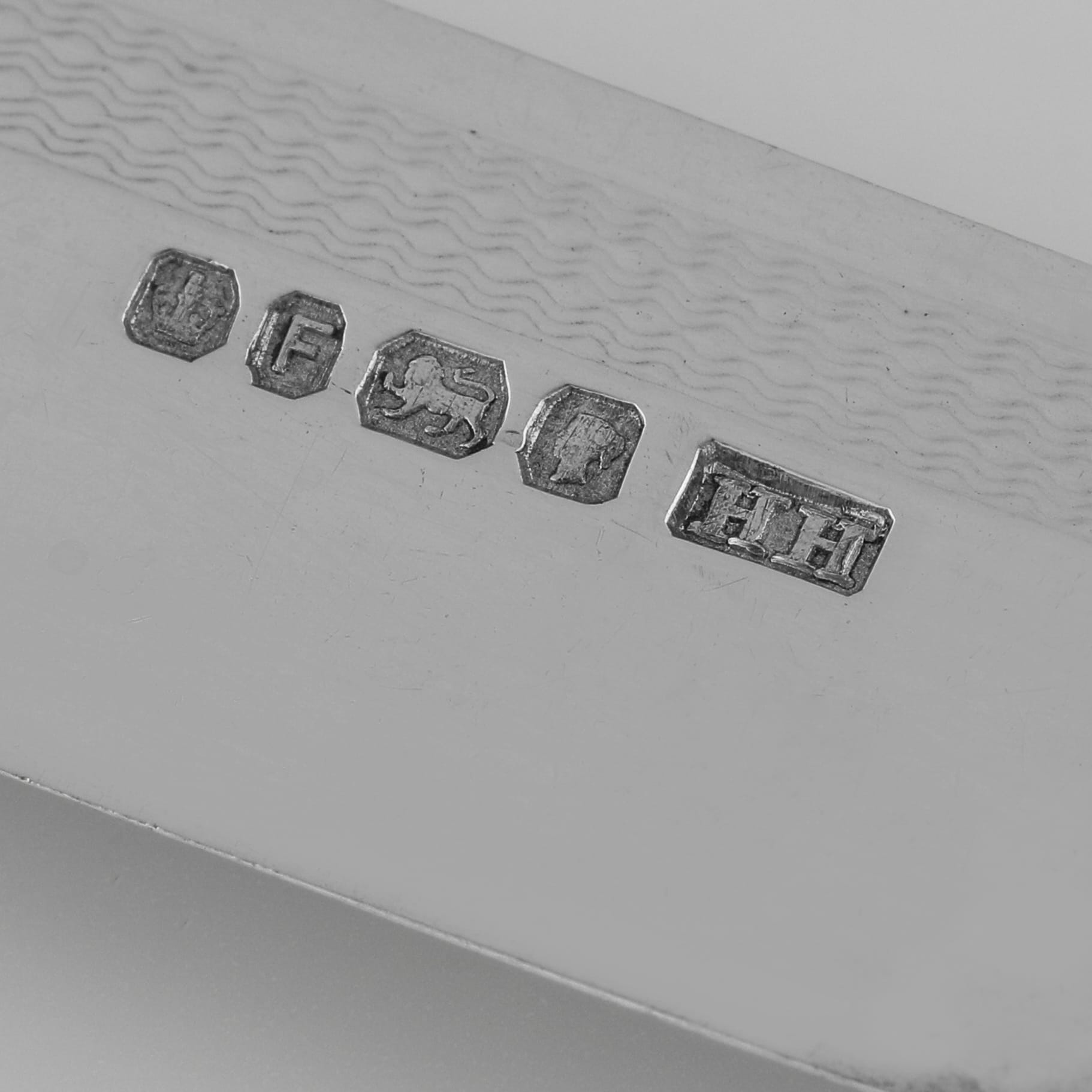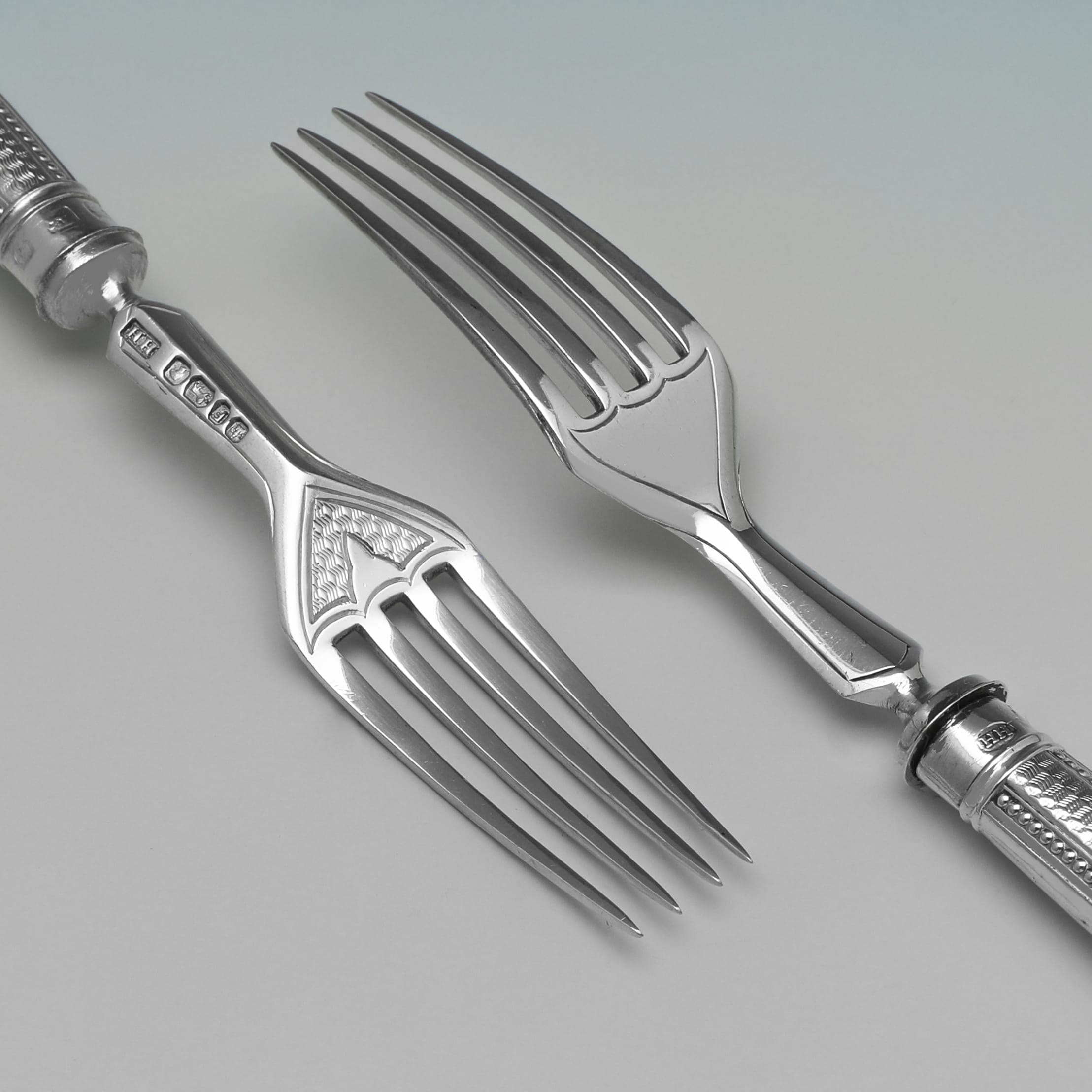 b9319: Hallmarked in Sheffield in 1873 by Henry Harrison, this striking, Victorian, Antique Sterling Silver Dessert Set, comprises 18 place settings, all with engine turned decoration and bead borders. Each piece is engraved with the crest of a griffin, and the set is presented in the original wooden box. Each knife measures 8.5"(21cm) in length, and each forks measures 7"(18cm) in length.