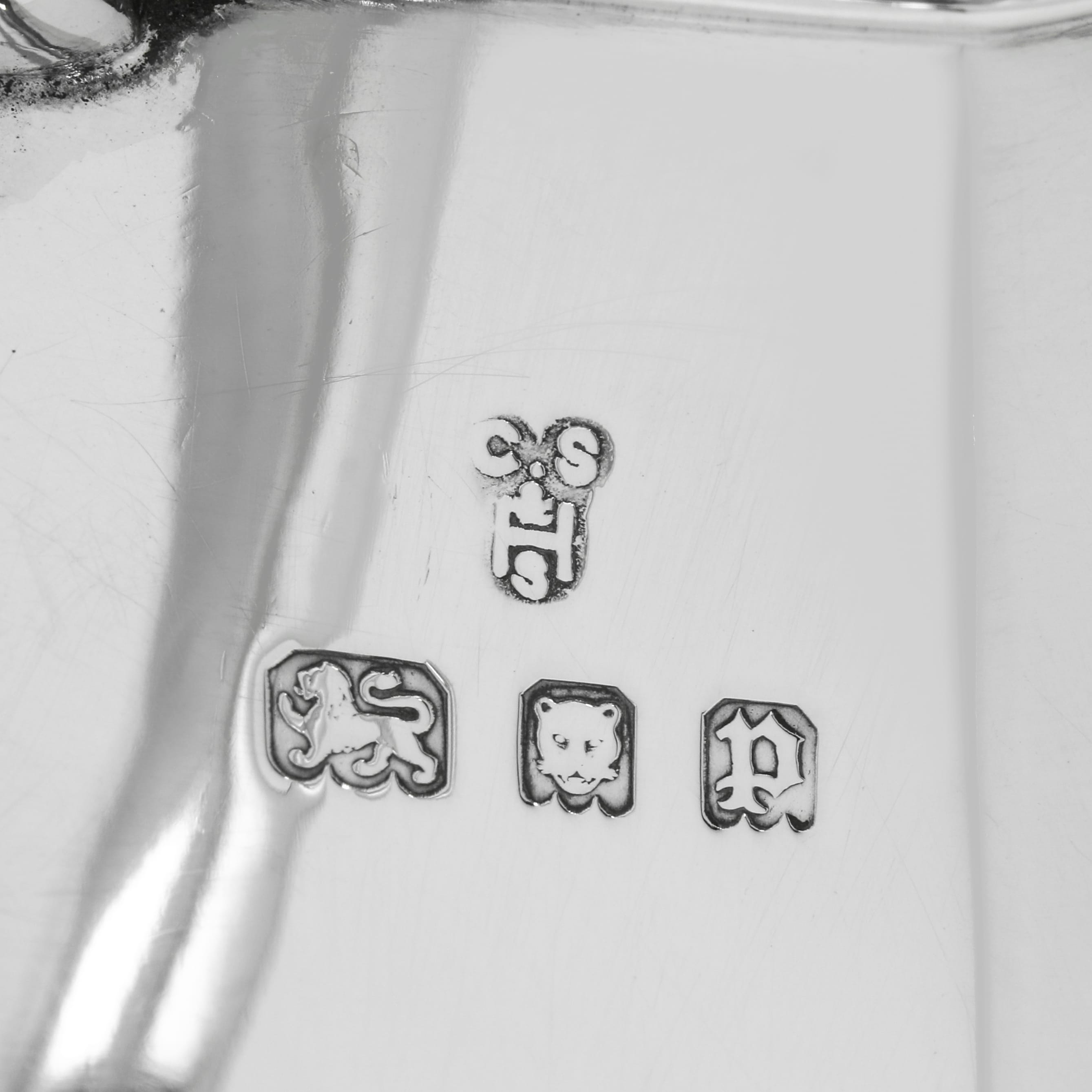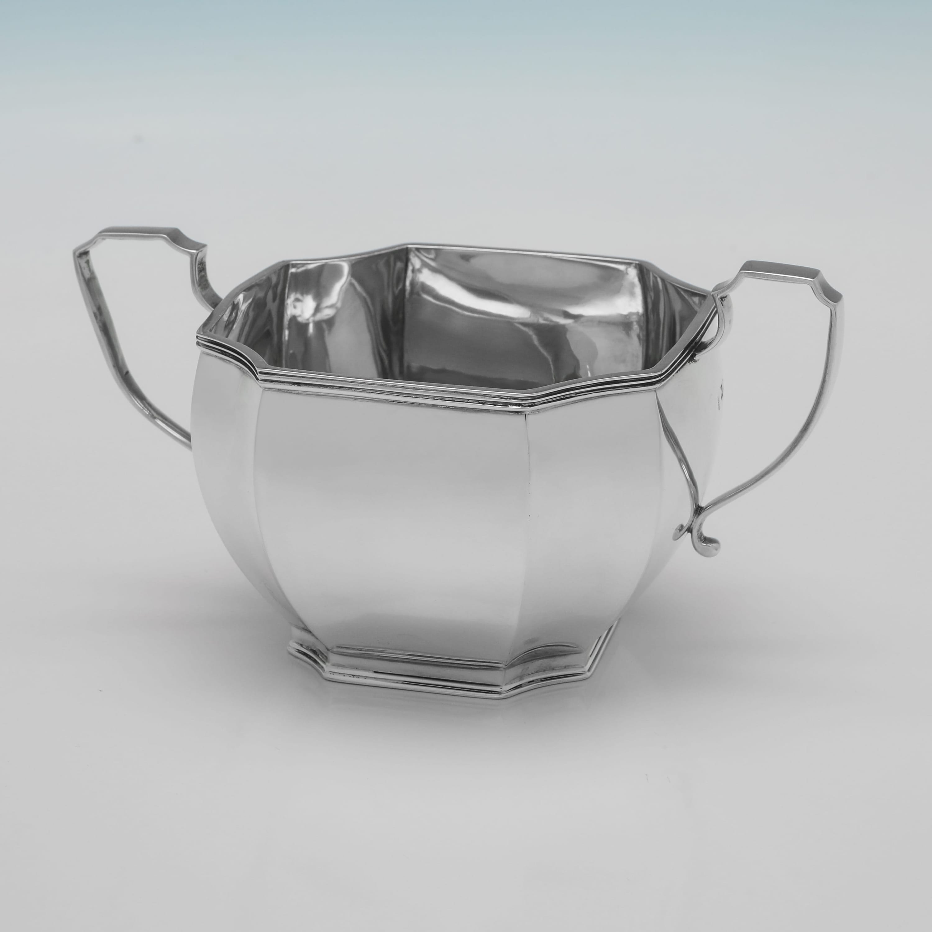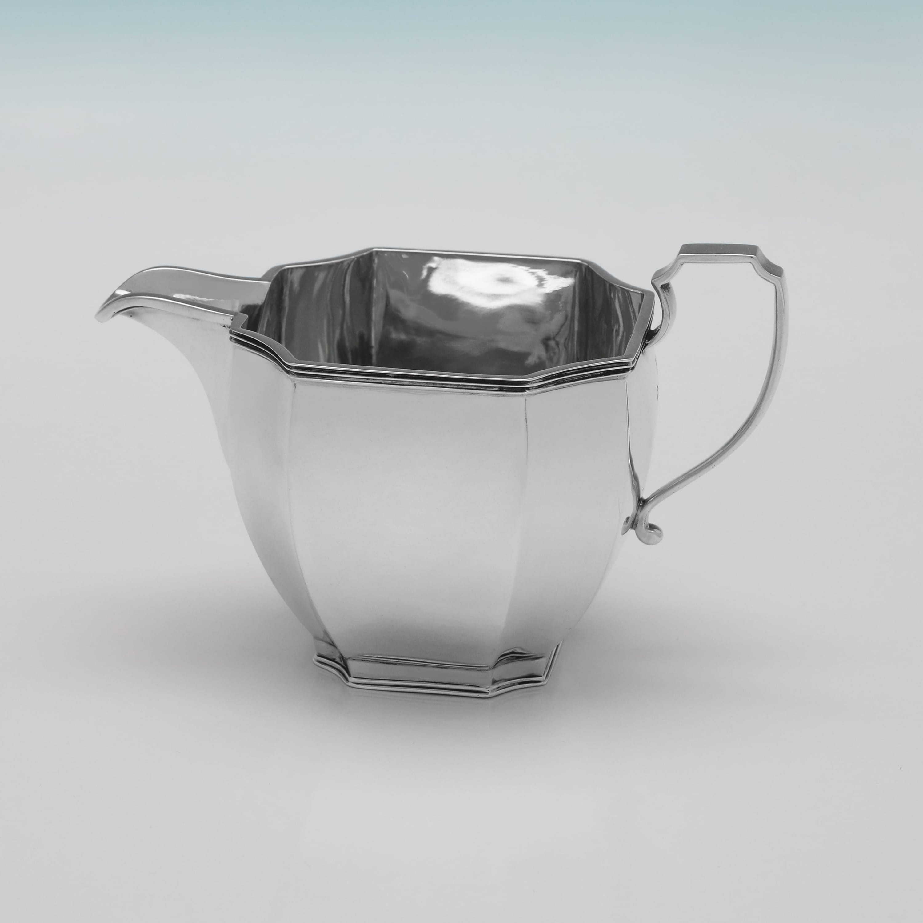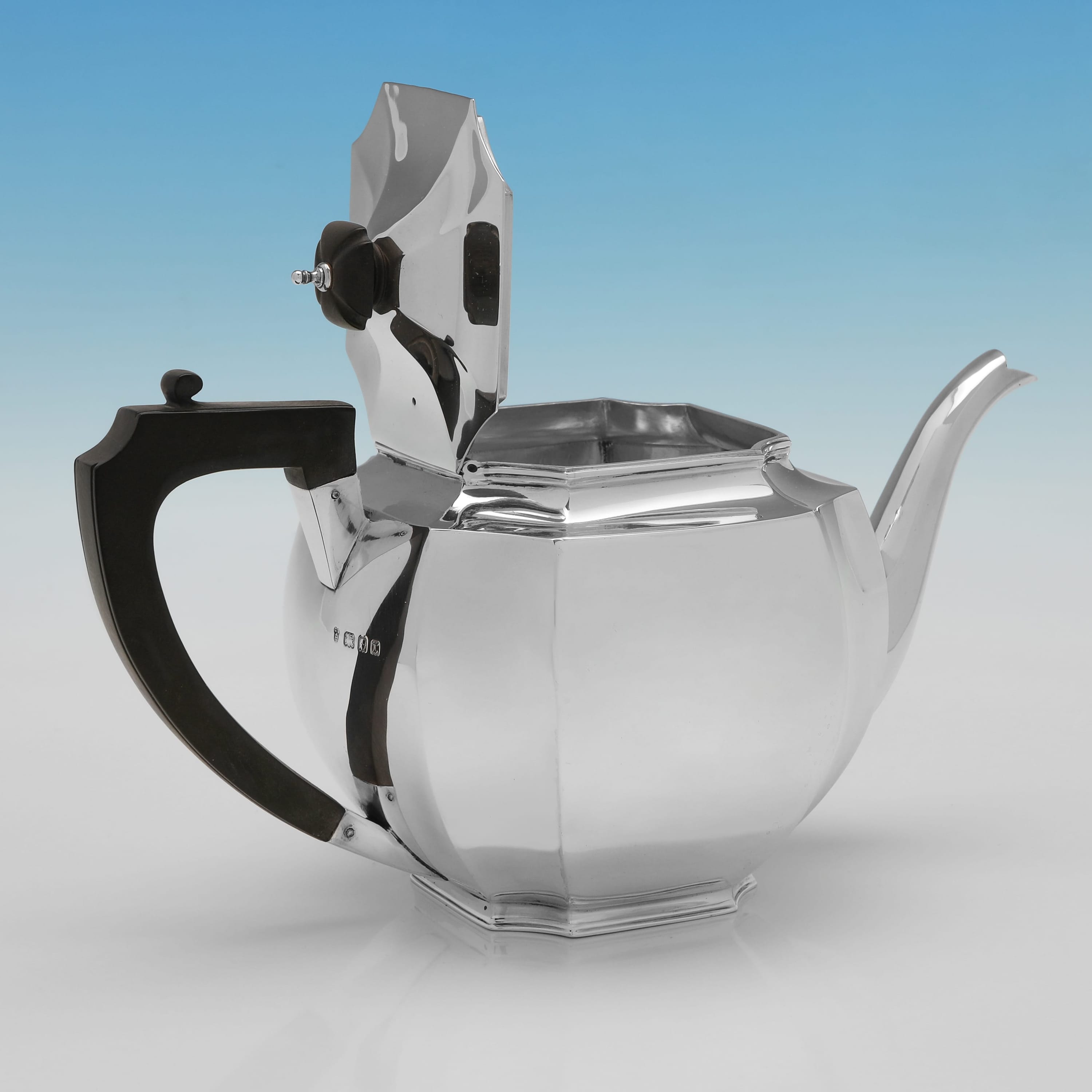 L1416: Hallmarked in London in 1930 by C. S. Harris & Sons Ltd. this sleek George V sterling silver four-piece tea set is of a fine Art Deco design. The pieces have a polished surface and an octagonal panelled form. The teapot and coffee pot are fitted with ebonised wooden handles and simple finials, while the sugar bowl and cream jug have plain angular handles. The set has a combined weight of 54 troy ounces.