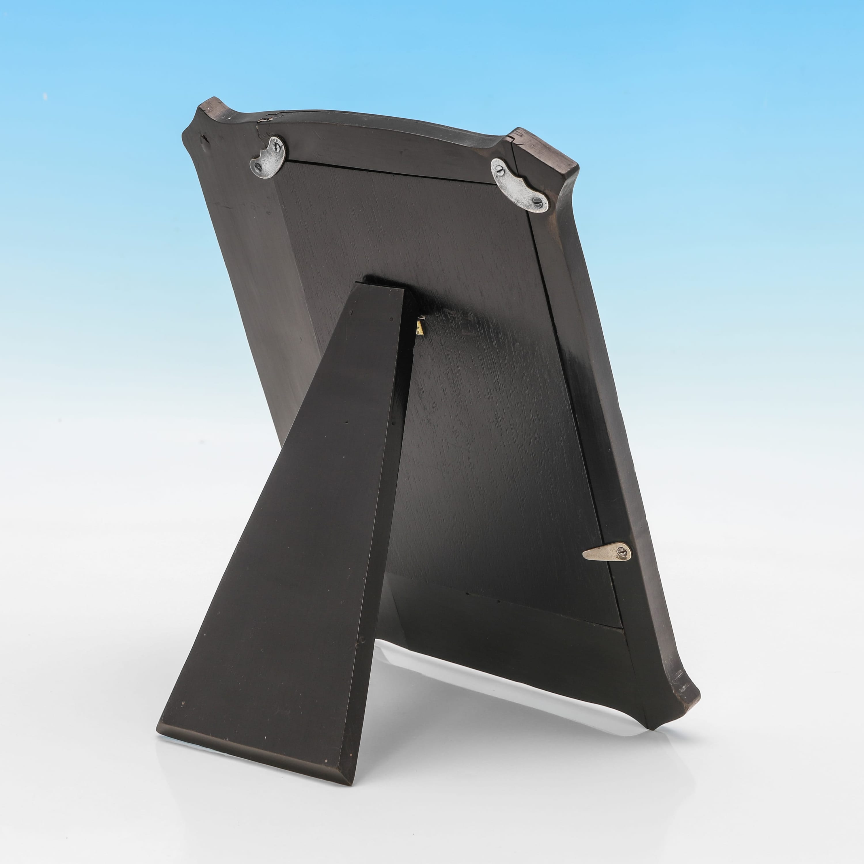 L5411: Hallmarked in Birmingham in 1906 by M. & C. Lister Ltd. this striking Edwardian antique sterling silver photograph frame is of an Art Nouveau style with a shaped rectangular form backed by wood, featuring a central oval aperture. The silver front is decorated with repoussé pastoral scenes of figures in a romantic outdoor setting with architecture and flowing foliage. It measures 8.75"(22cm) tall by 7"(18cm) wide, with the oval aperture measuring 6"(15cm) tall by 3.75"(9.5cm) wide.
