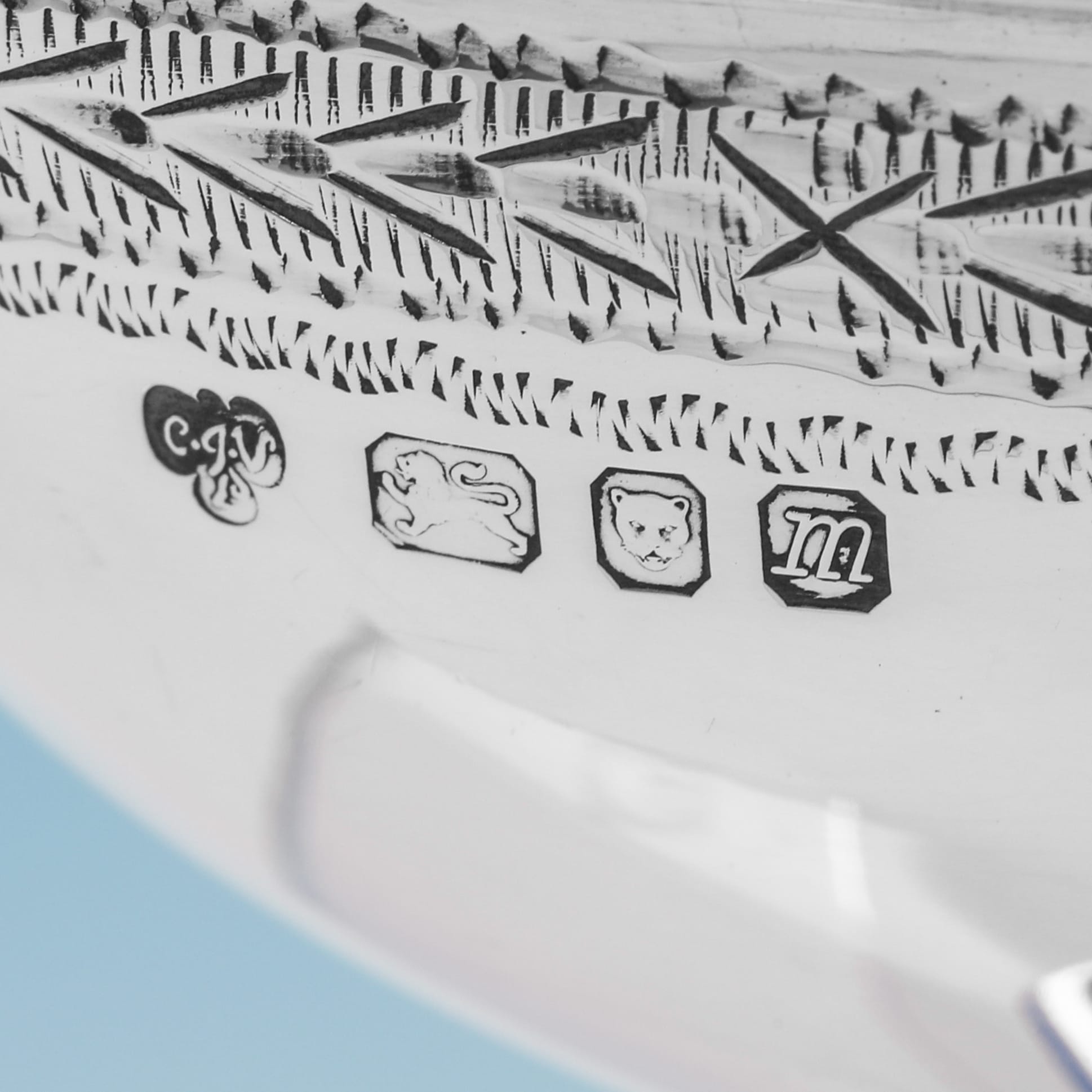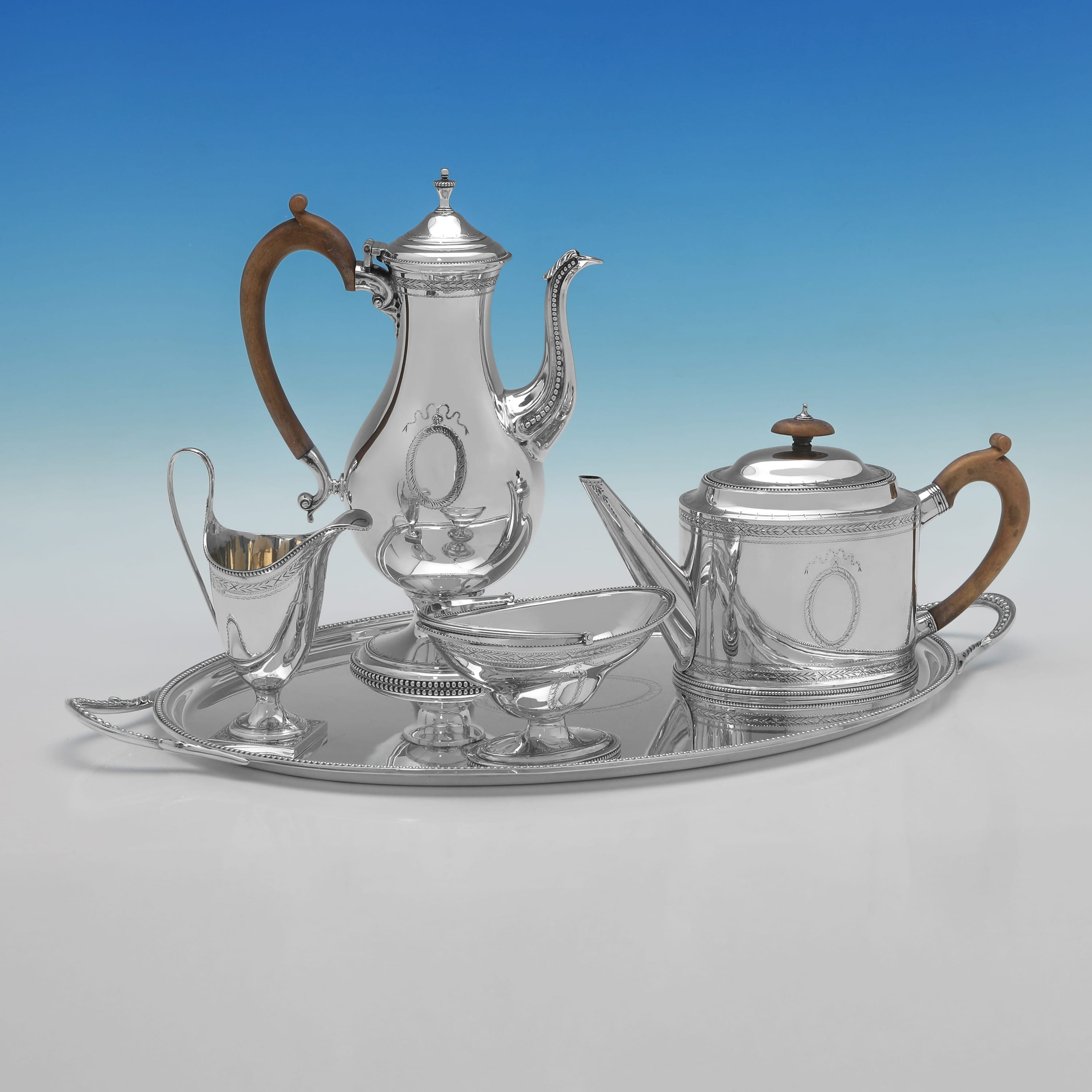 L6324: Hallmarked in London between 1967 and 1973 by C. J. Vander this elegant Elizabeth II sterling silver five-piece tea set is of a classic Neoclassical Revival style. The set, which is in the manner of Hester Bateman, comprises a teapot, coffee pot, sugar bowl, cream jug, and a matching oval tray. Each piece has a plain, polished surface with finely engraved borders and a vacant oval cartouche to the centre. The set has a combined weight of 112 troy ounces.