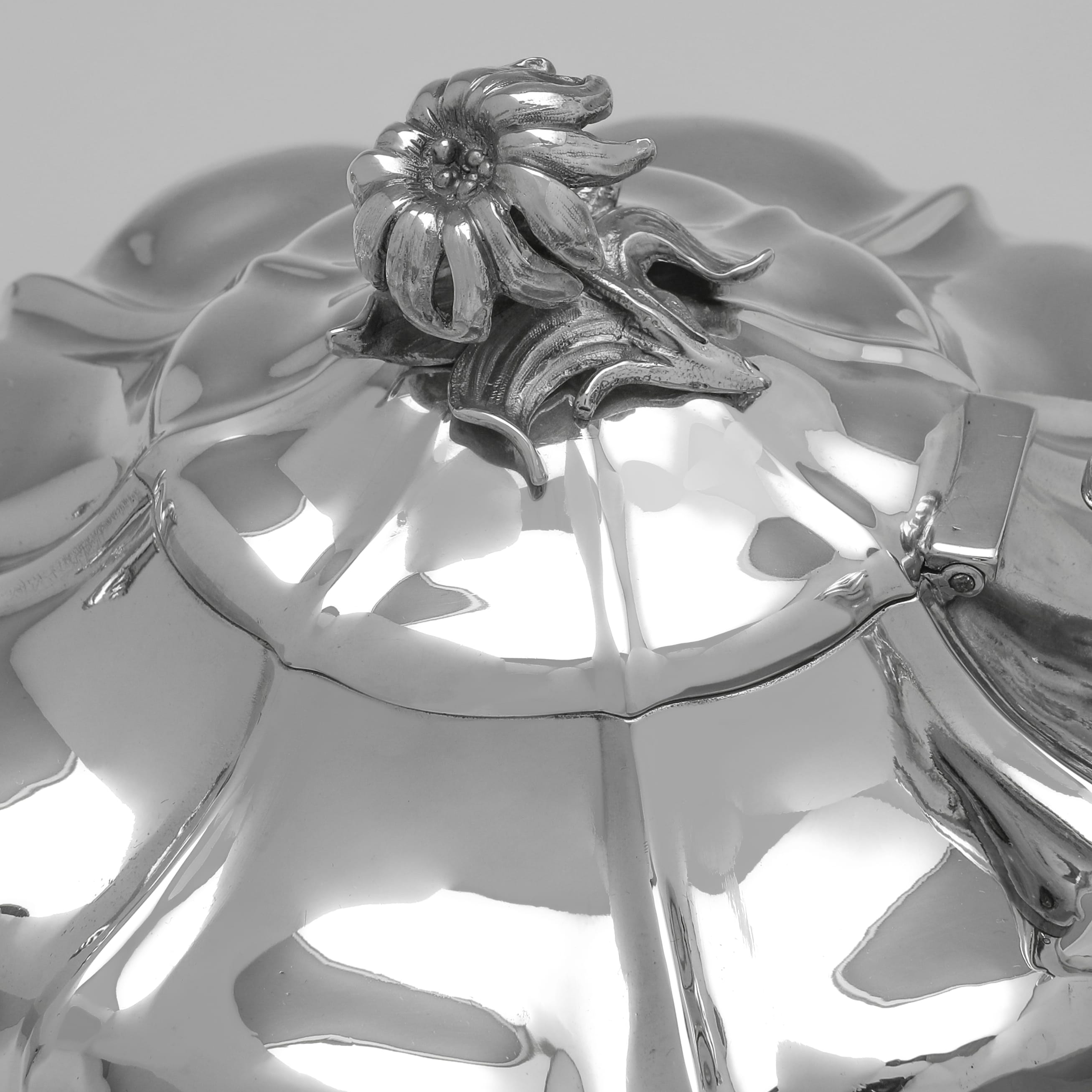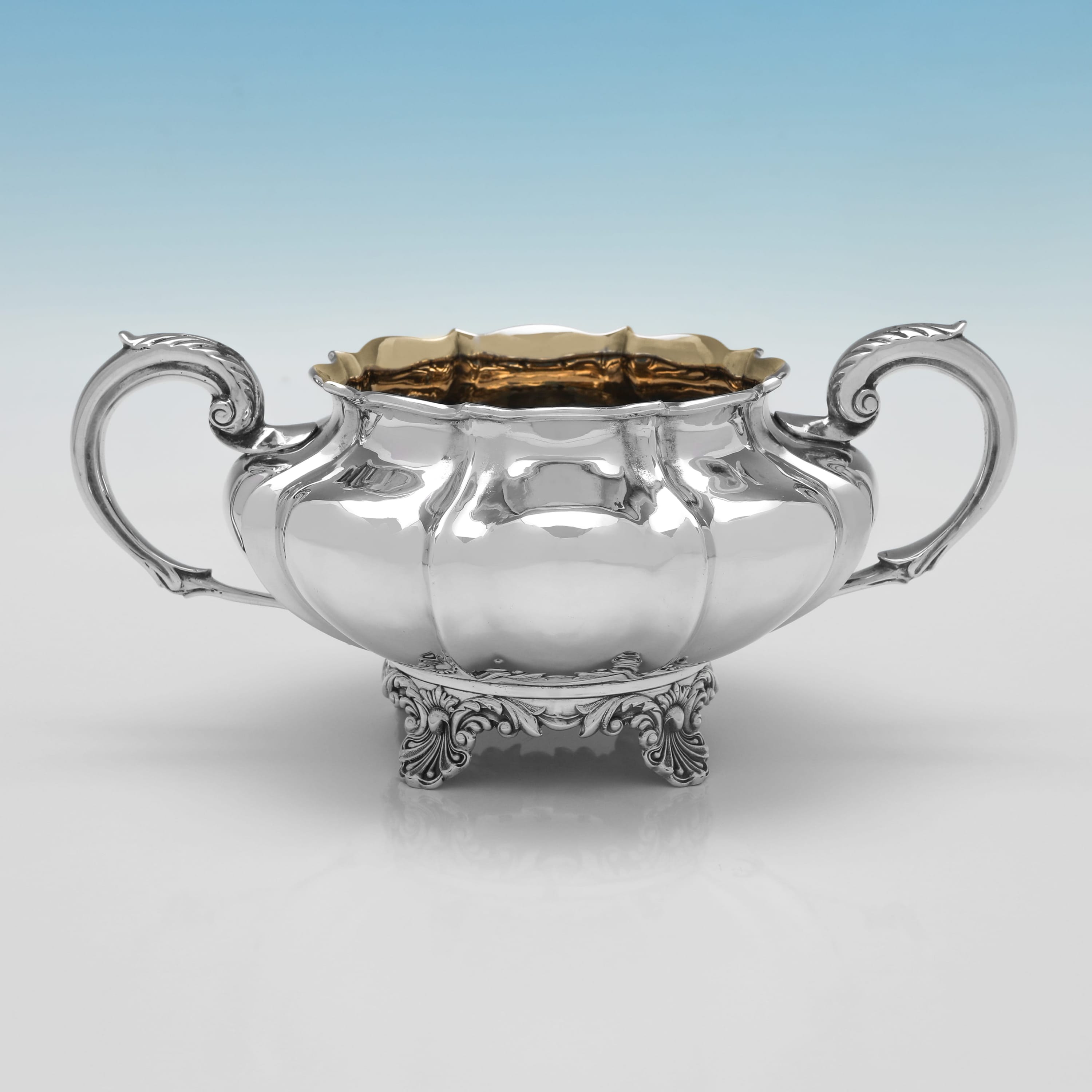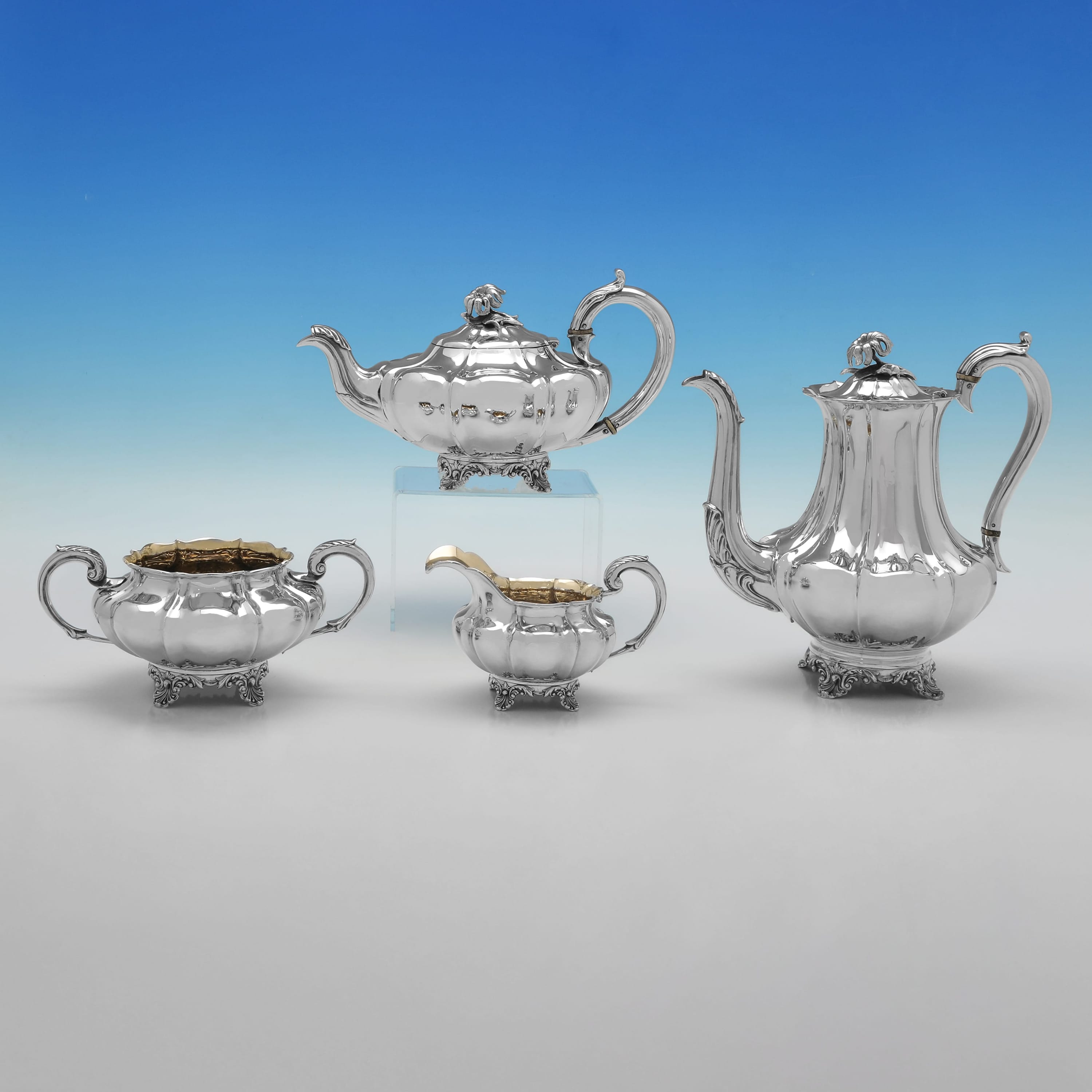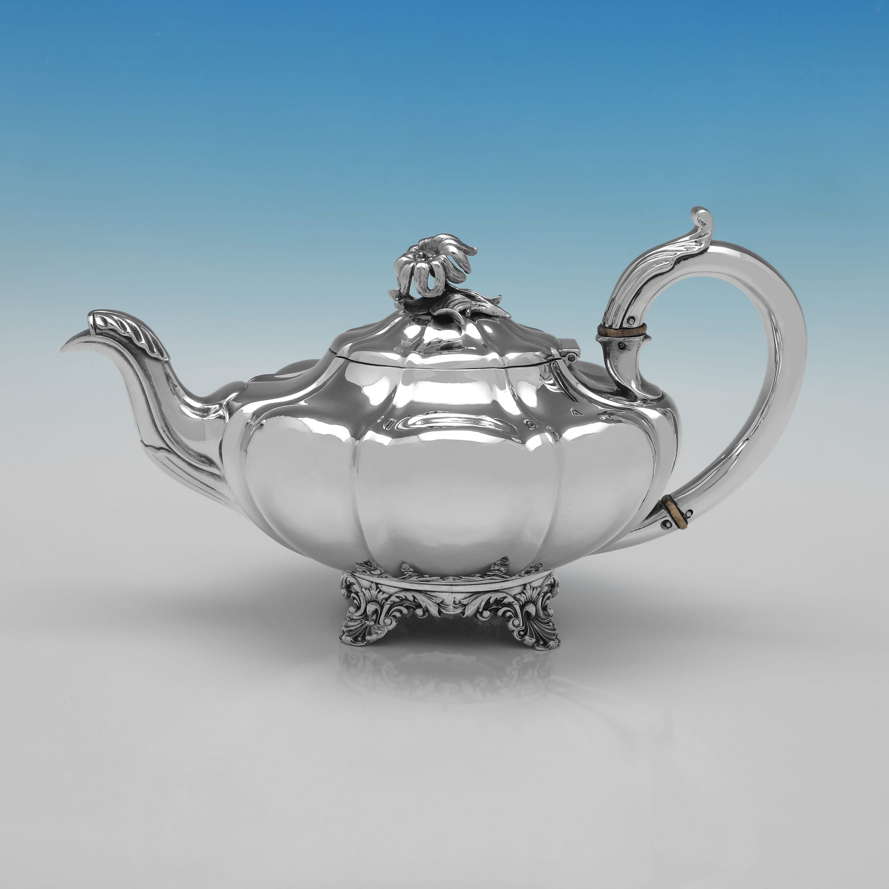 L7203: Hallmarked in London in 1831 & 1832 by Edward Barton this elegant William IV antique sterling silver four-piece tea set is of a classic lobed or 'melon' form. The pieces have applied cast scroll feet and cast scroll handles with detailed acanthus decoration. The teapot and hot water pot are completed with a high-relief floral finial to the lid, and the cream jug and sugar bowl have a gilded interior. The set has a combined weight of 73 troy ounces.