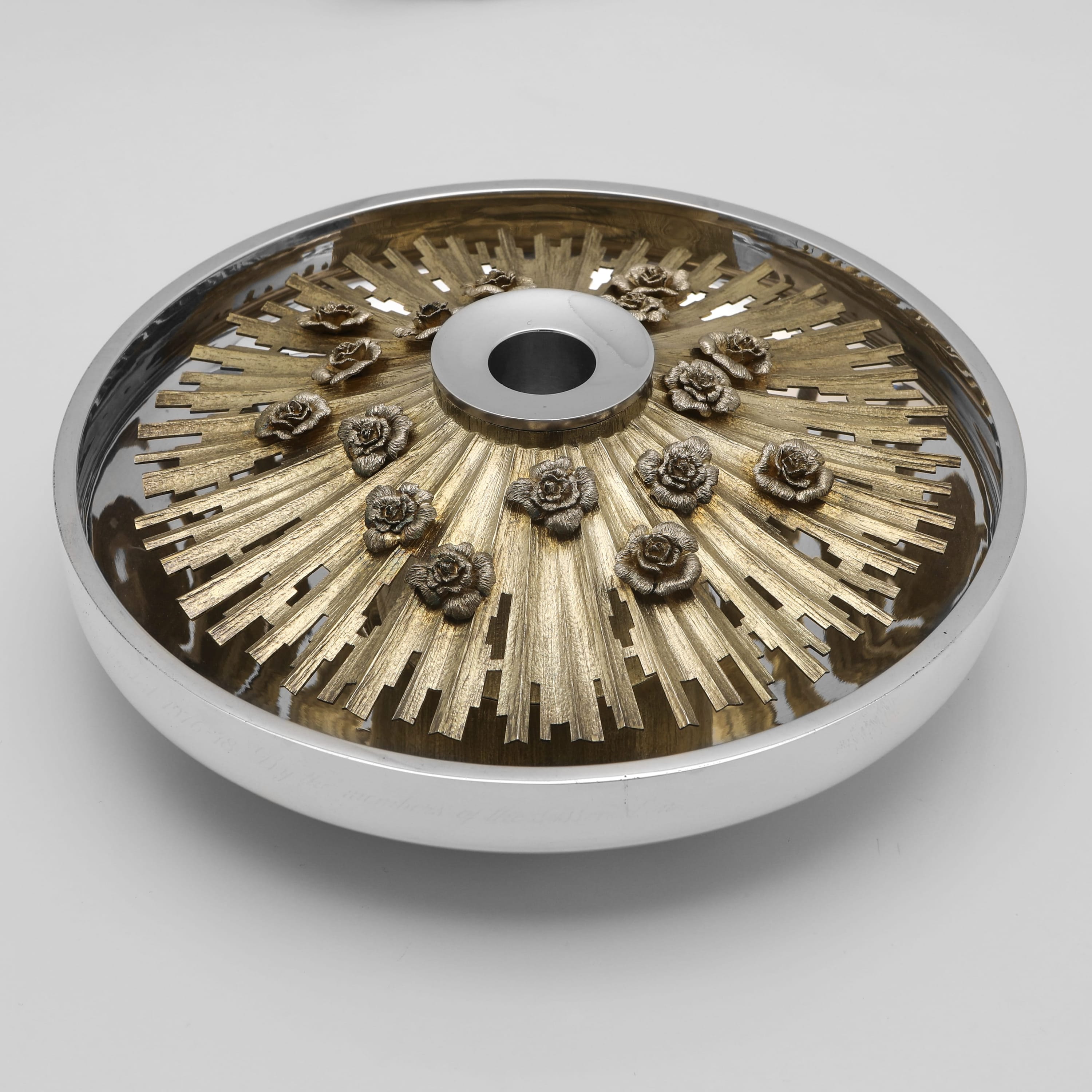 L7618: Hallmarked in London in 1978 by Christopher Lawrence this striking sterling silver centrepiece is of a low, circular form with a wide, polished rim. The piece features a removable gilt-metal insert decorated with a radiating 'sunburst' pattern and applied silver rose ornaments. The central socket is designed to hold a candle. The centrepiece measures 2.5"(6.5cm) tall, by 8.5"(21.5cm) in diameter, and weighs 27.15 troy ounces.