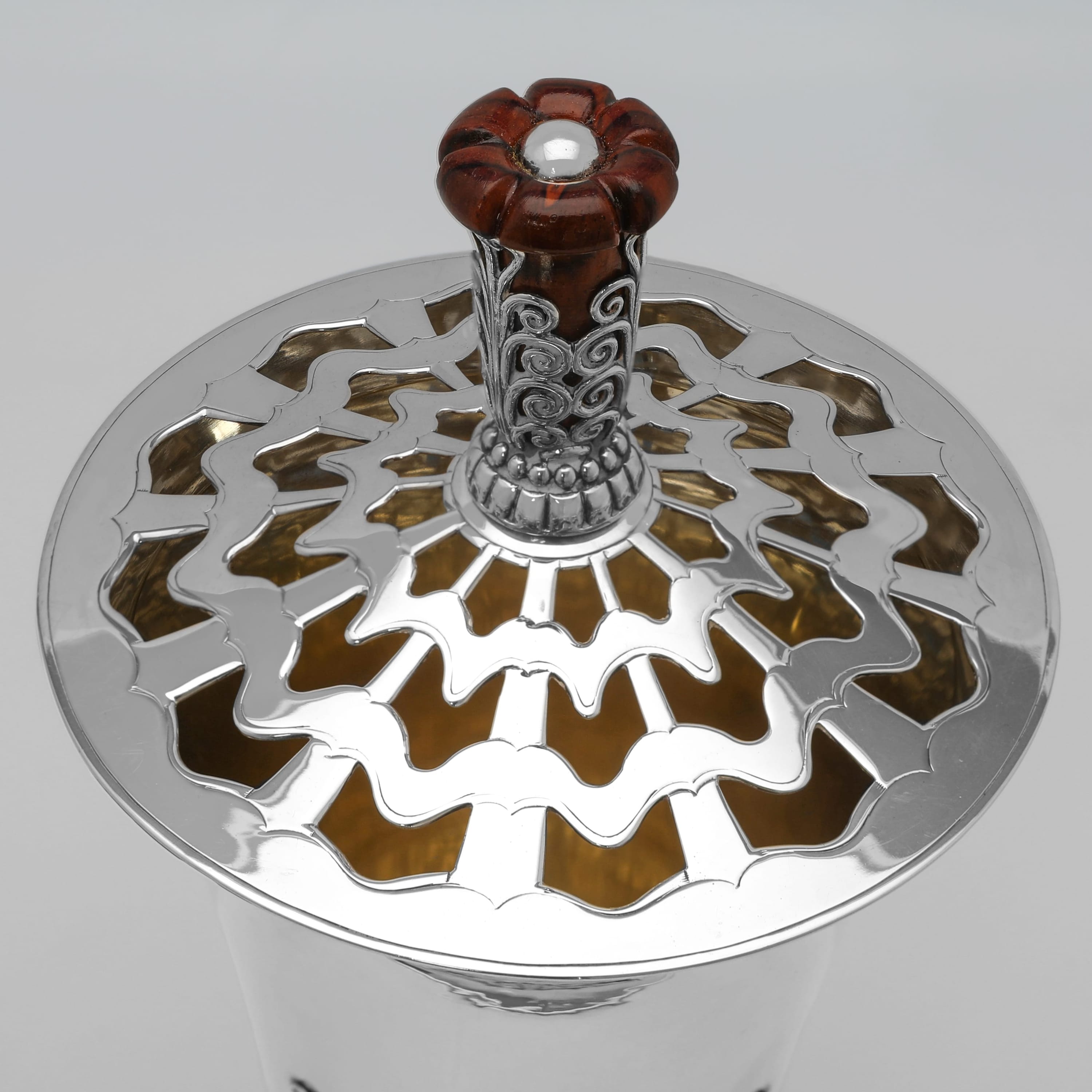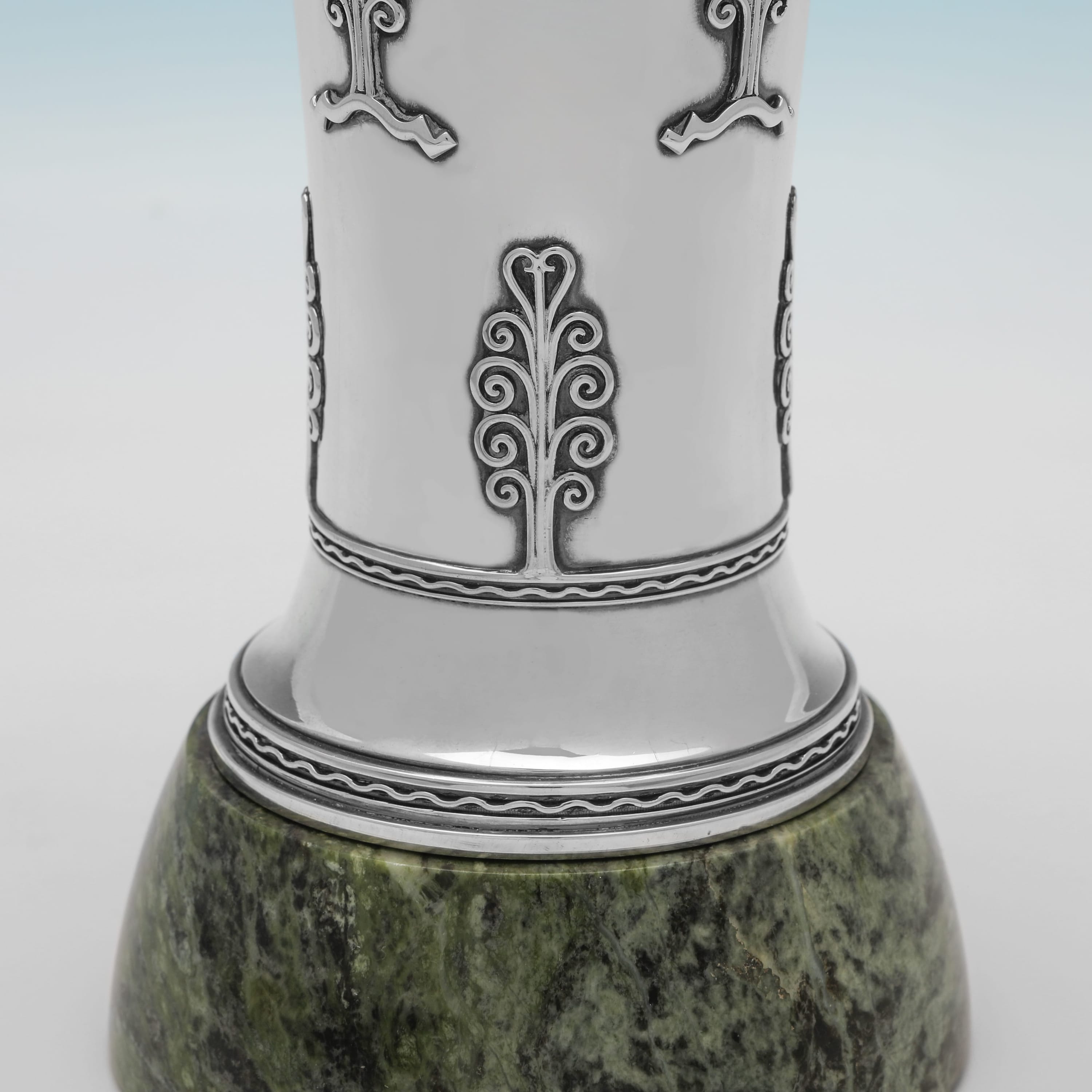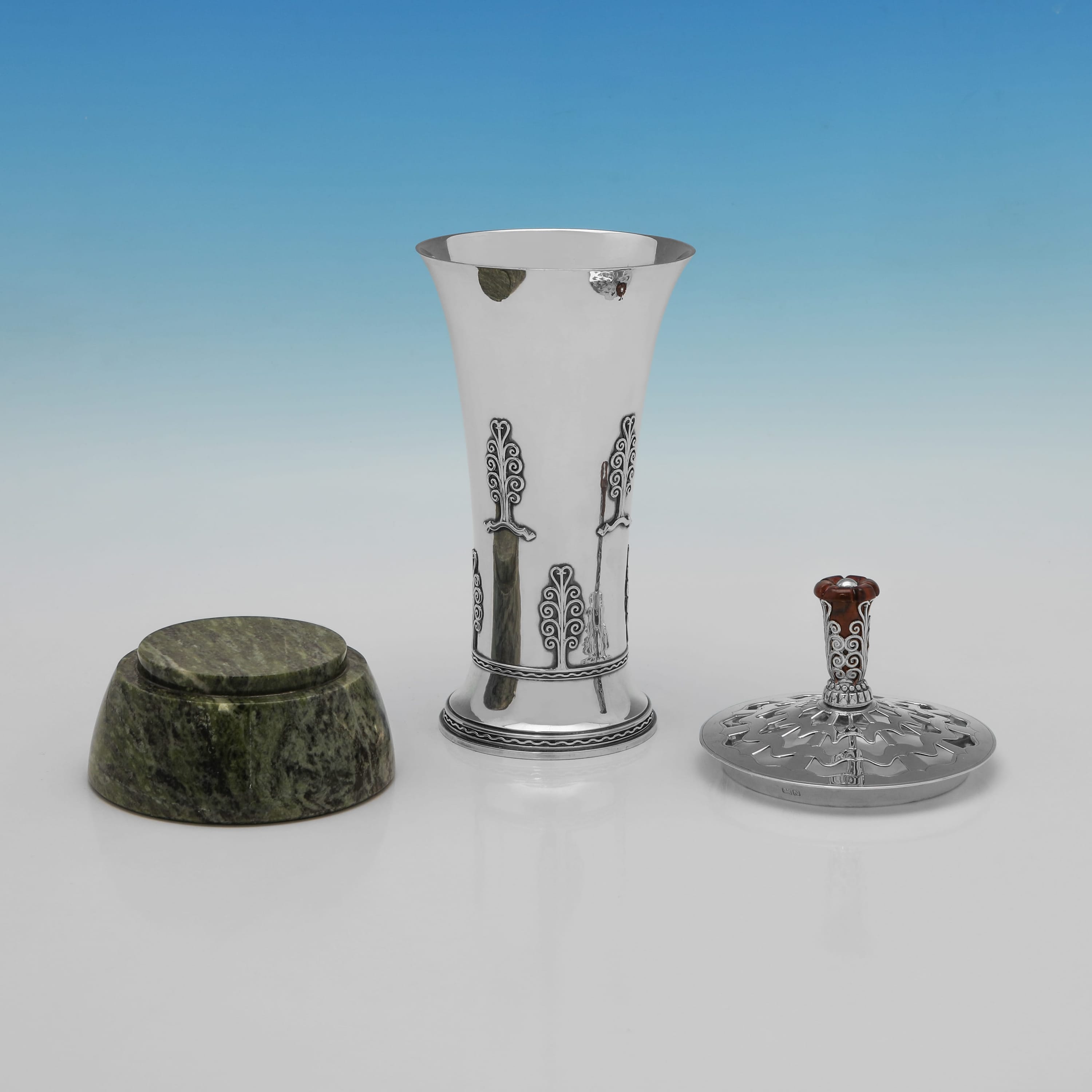 L7811: Hallmarked in London in 1948 by R. E. Stone this distinctive George VI sterling silver vase is executed in the Arts and Crafts style, mounted on a domed green marble base. The tapering body is decorated with applied stylised tree motifs and is complete with a removable pierced cover and a wooden finial. It measures 11"(28cm) tall including the base by 4.25"(11cm) in diameter, and the silver weighs 17.8 troy ounces.