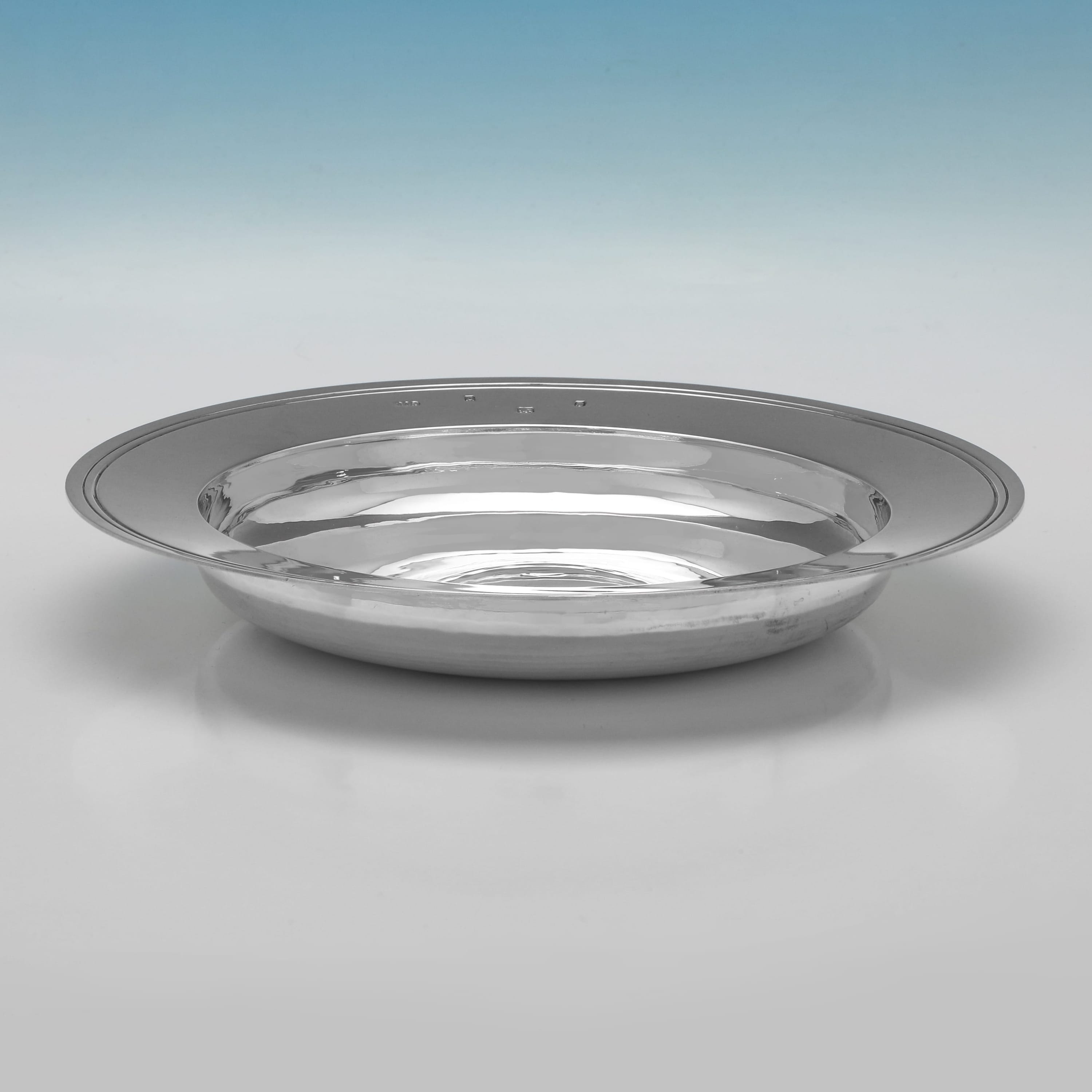 L7840: Hallmarked in London in 1936 by Reid & Sons this classic George V sterling silver Armada dish is of a plain, circular form with a broad rim decorated with a series of reeded bands. It measures 1.5"(4cm) tall, with a diameter of 10"(25.5cm), and weighs 22.71 troy ounces.