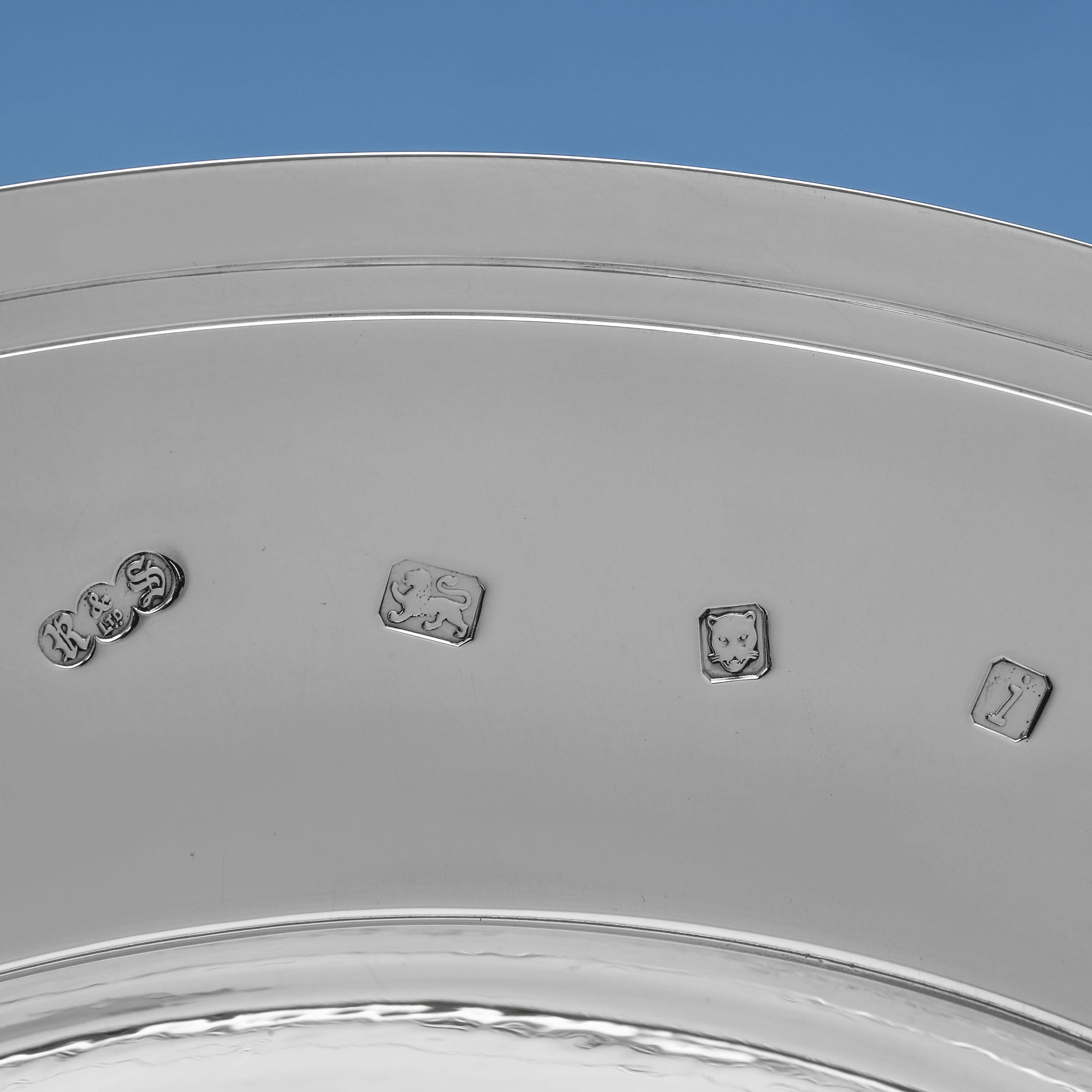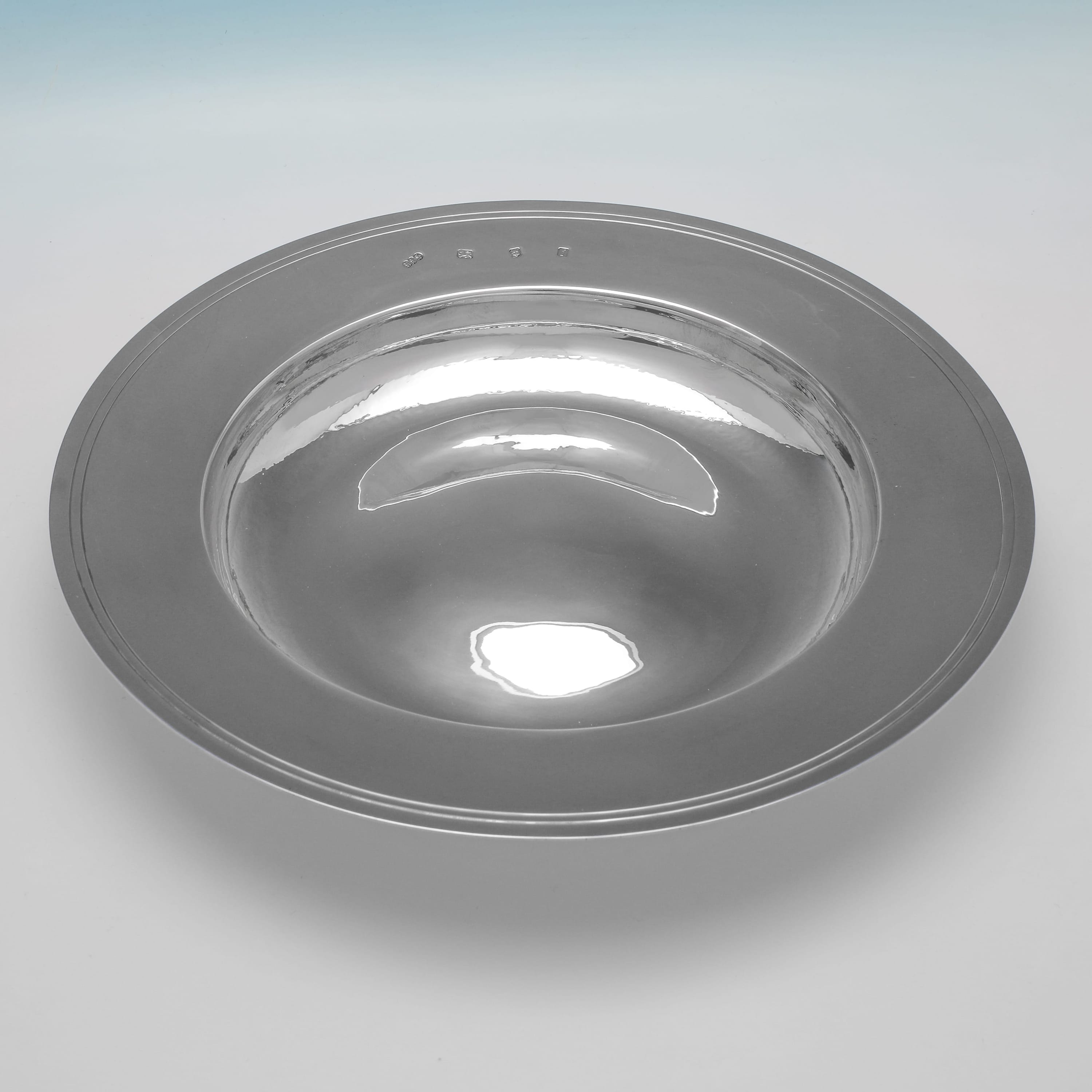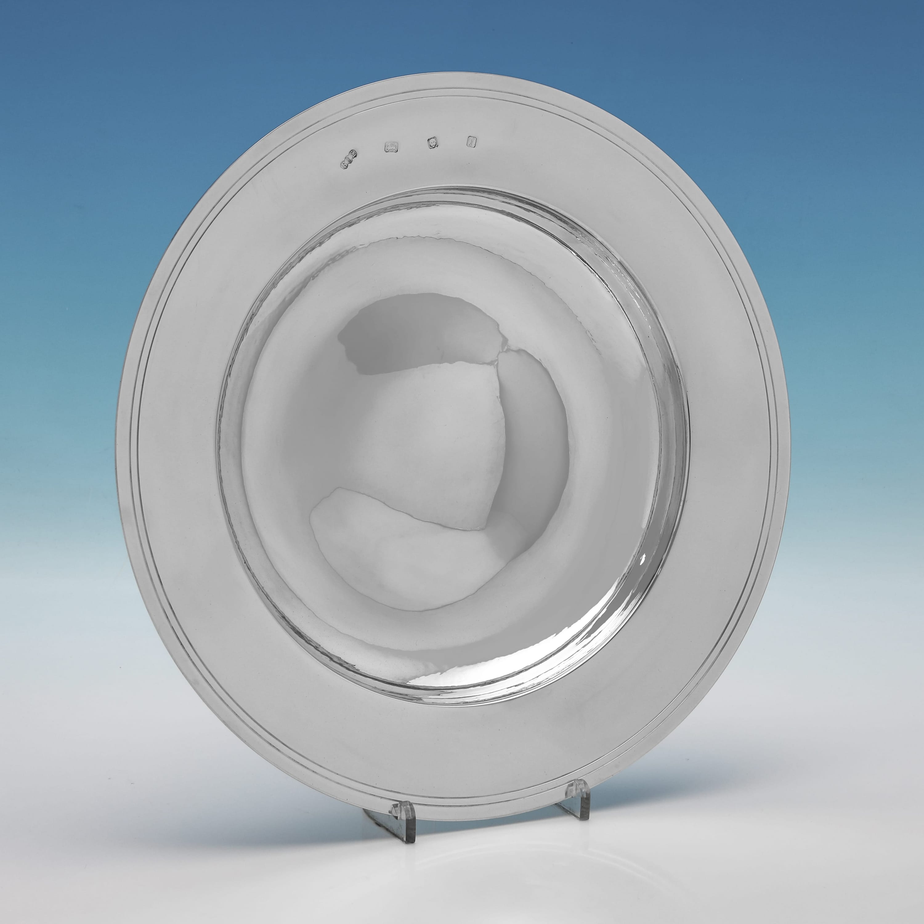 L7957: Hallmarked in London in 1964 by Reid & Sons, this substantial, Elizabeth II sterling silver Armada dish features a classic circular form with a broad rim and subtle concentric band detailing. The dish measures 2" (5cm) tall and 14" (36cm) in diameter, and weighs 50.34 troy ounces.