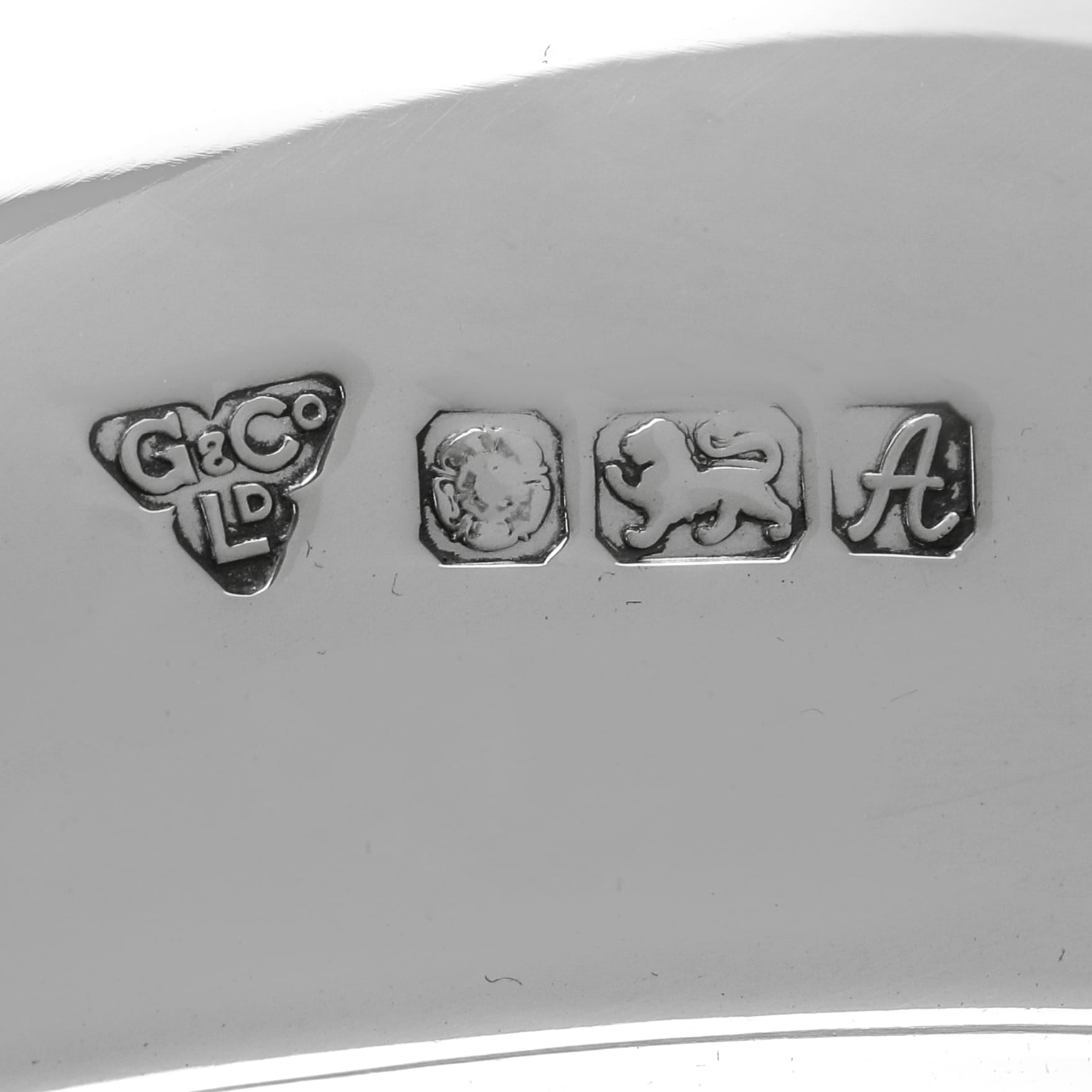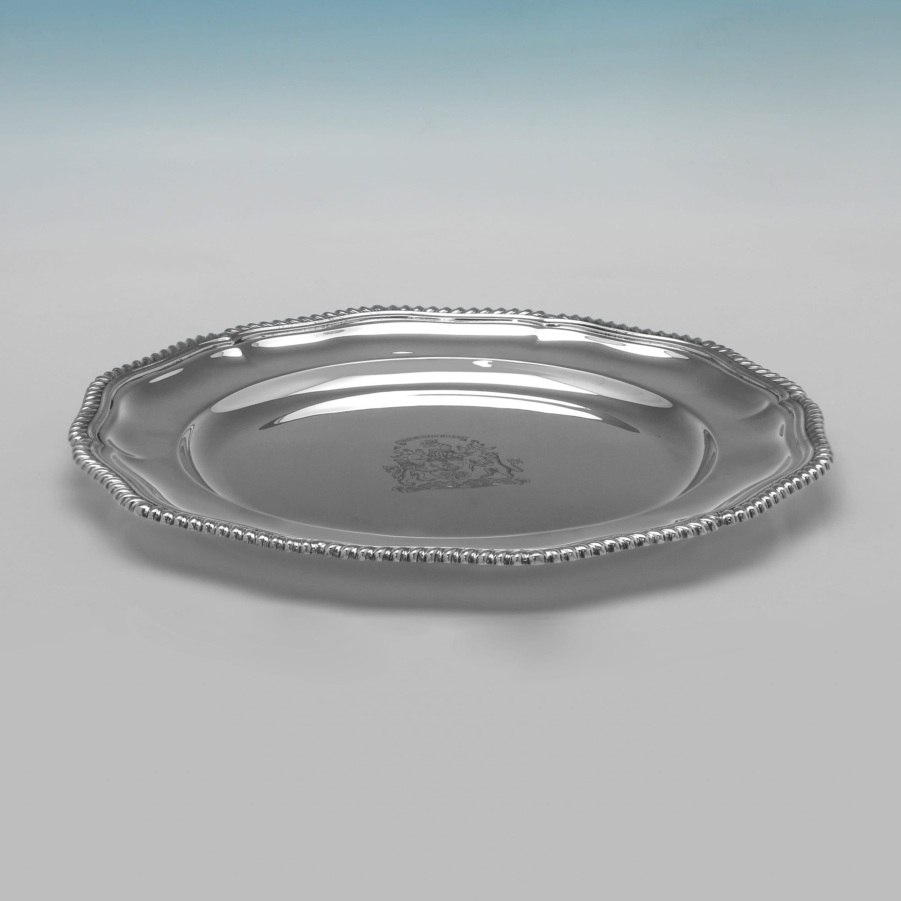 L8324: Hallmarked in Sheffield in 1973 and 1975 by Garrard & Co. Ltd. this impressive Elizabeth II sterling silver set comprises twelve dinner plates and twelve side plates. Each plate is of a shaped circular form with a gadroon border and is engraved with a central coat of arms. The twelve dinner plates (1975) each measure 11.4"(29cm) in diameter, and the twelve side plates (1973) each measure 6.1"(15.5cm) in diameter. The twenty-four plates have a combined weight of 316.2 troy ounces.