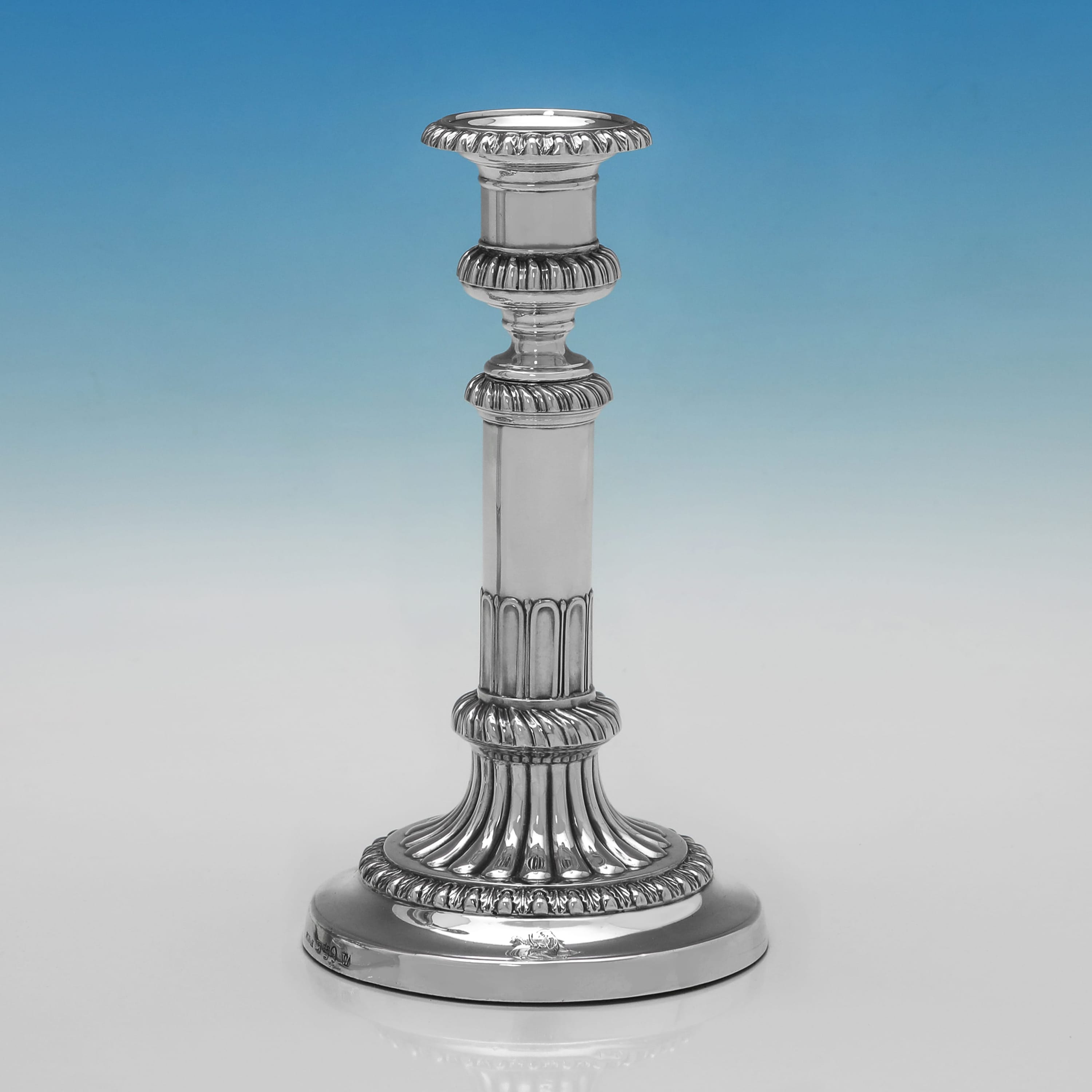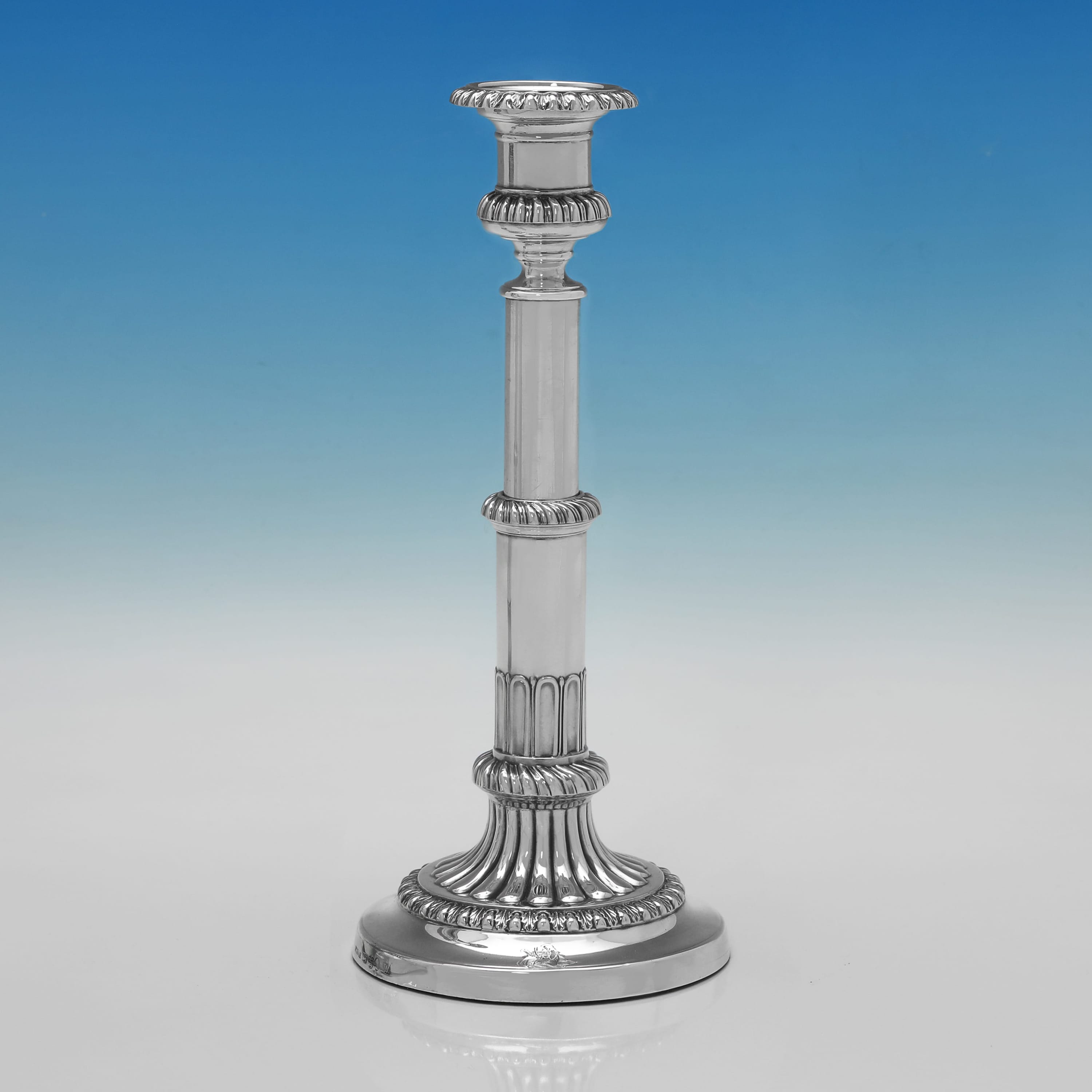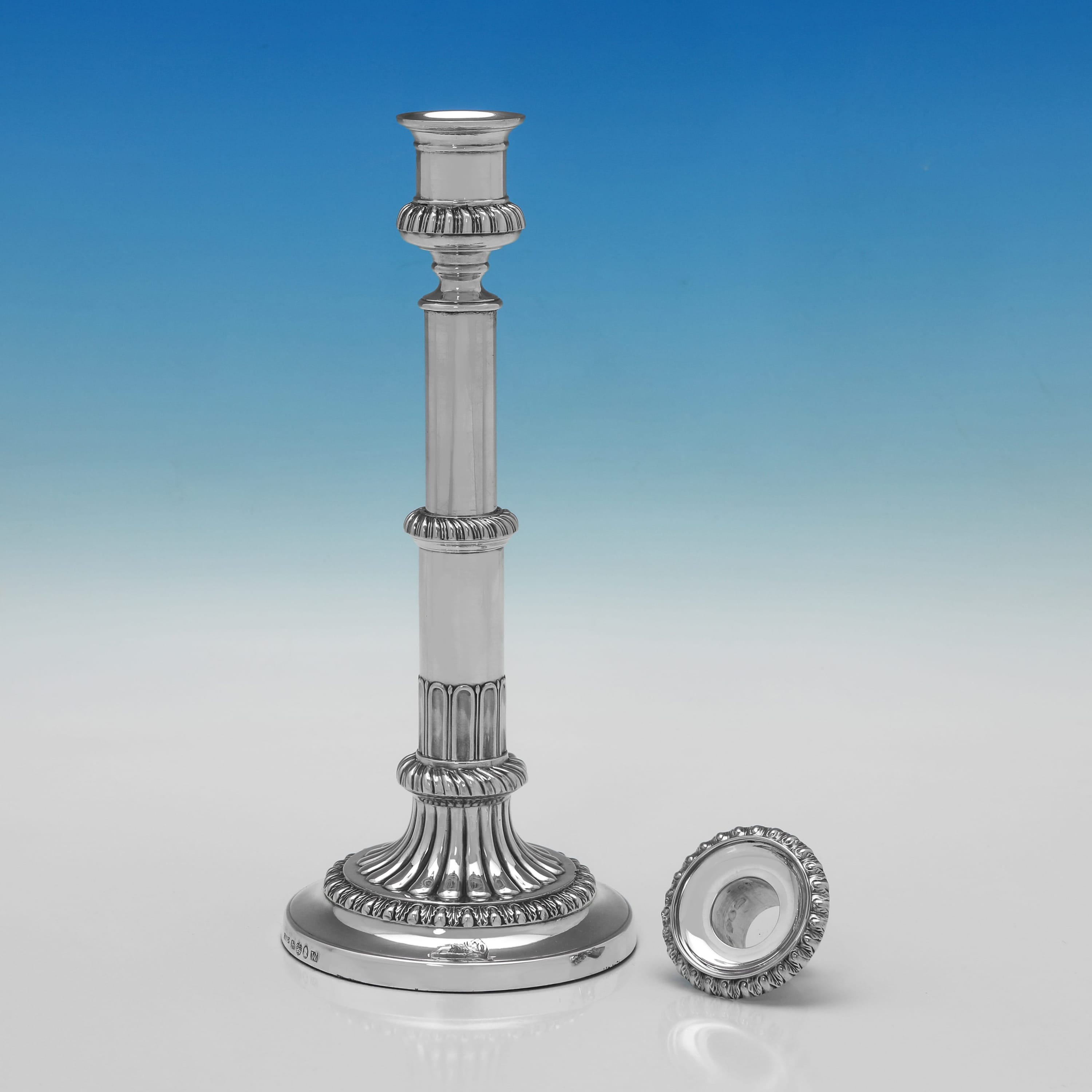 L8474: Hallmarked in Sheffield in 1814 by John Roberts & Co. this remarkable George III antique sterling silver pair of telescopic candlesticks has a spreading circular foot decorated with egg-and-dart and gadroon borders. The central stem features fluting and reeding, and the capital has a gadroon border. The candlesticks extend to adjust the height, and the base is finely engraved with a crest of an elephant's head. Each candlestick measures 11"(28cm) tall when extended, or 8.5"(21.5cm) tall when at their shortest, by 4.75"(12cm) in diameter.