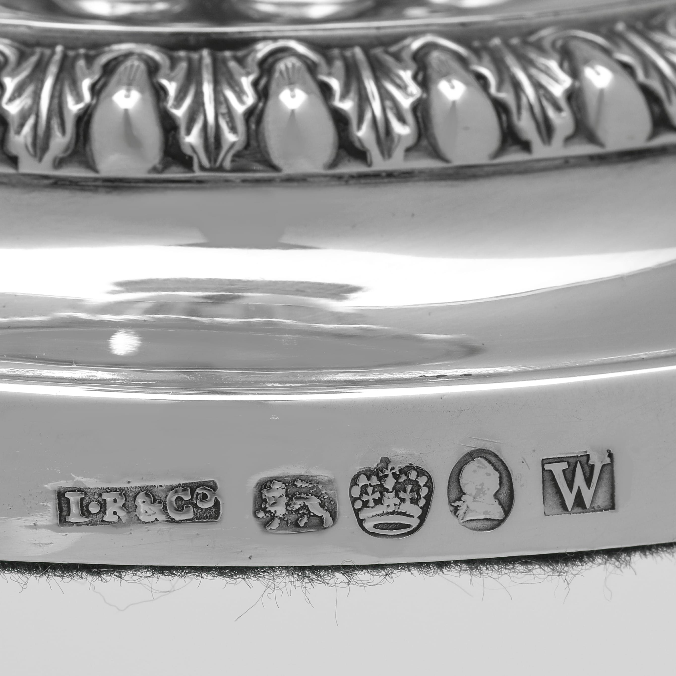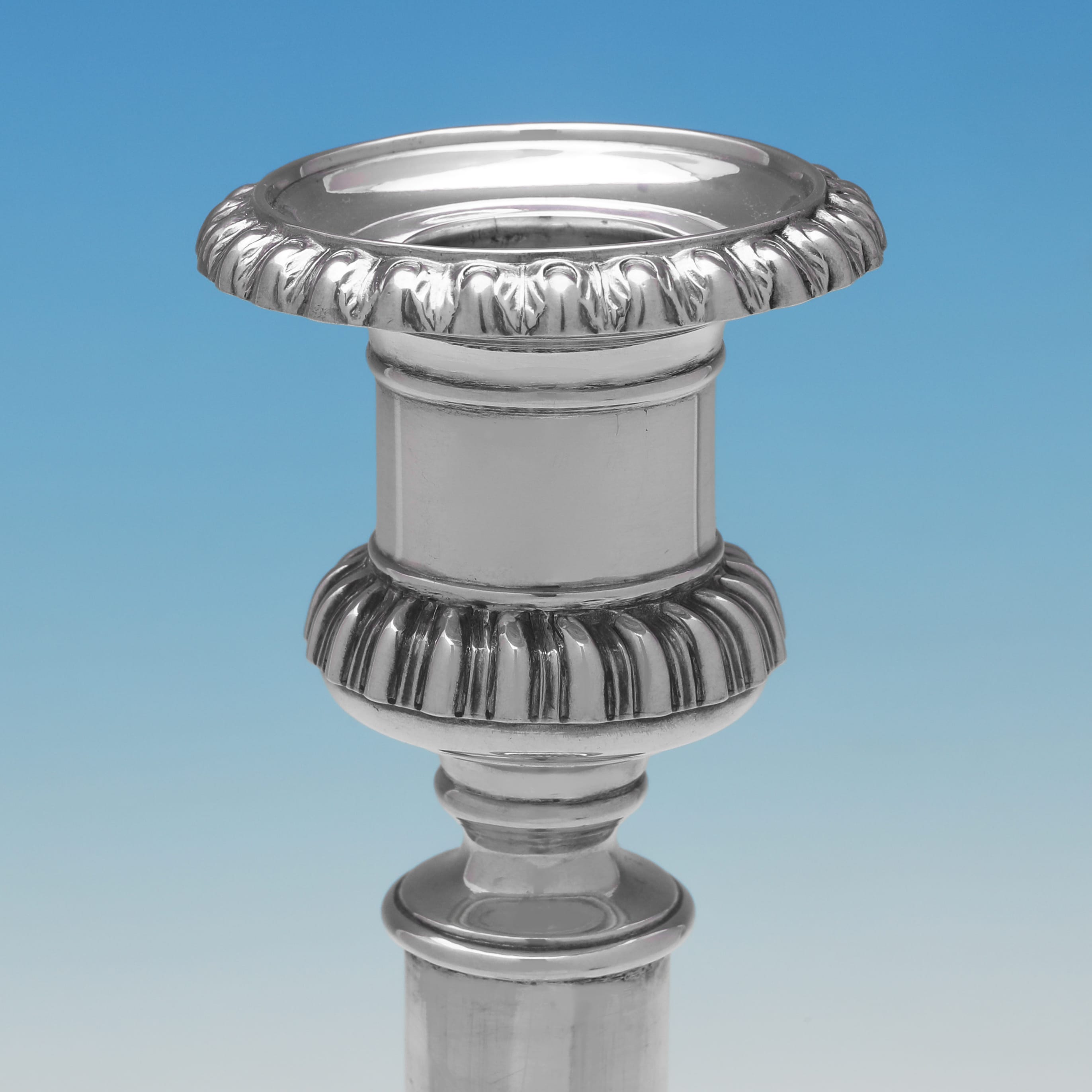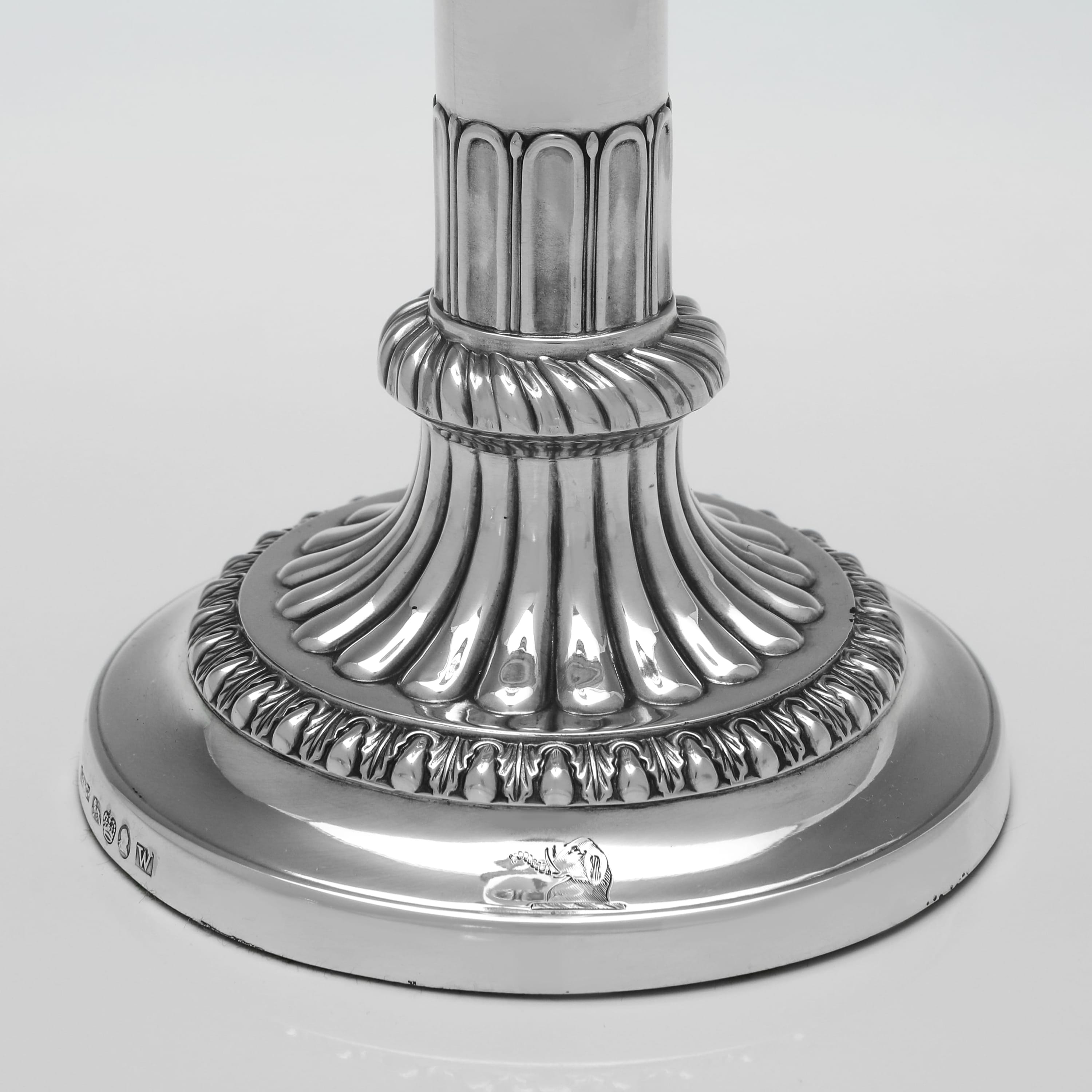 L8474: Hallmarked in Sheffield in 1814 by John Roberts & Co. this remarkable George III antique sterling silver pair of telescopic candlesticks has a spreading circular foot decorated with egg-and-dart and gadroon borders. The central stem features fluting and reeding, and the capital has a gadroon border. The candlesticks extend to adjust the height, and the base is finely engraved with a crest of an elephant's head. Each candlestick measures 11"(28cm) tall when extended, or 8.5"(21.5cm) tall when at their shortest, by 4.75"(12cm) in diameter.