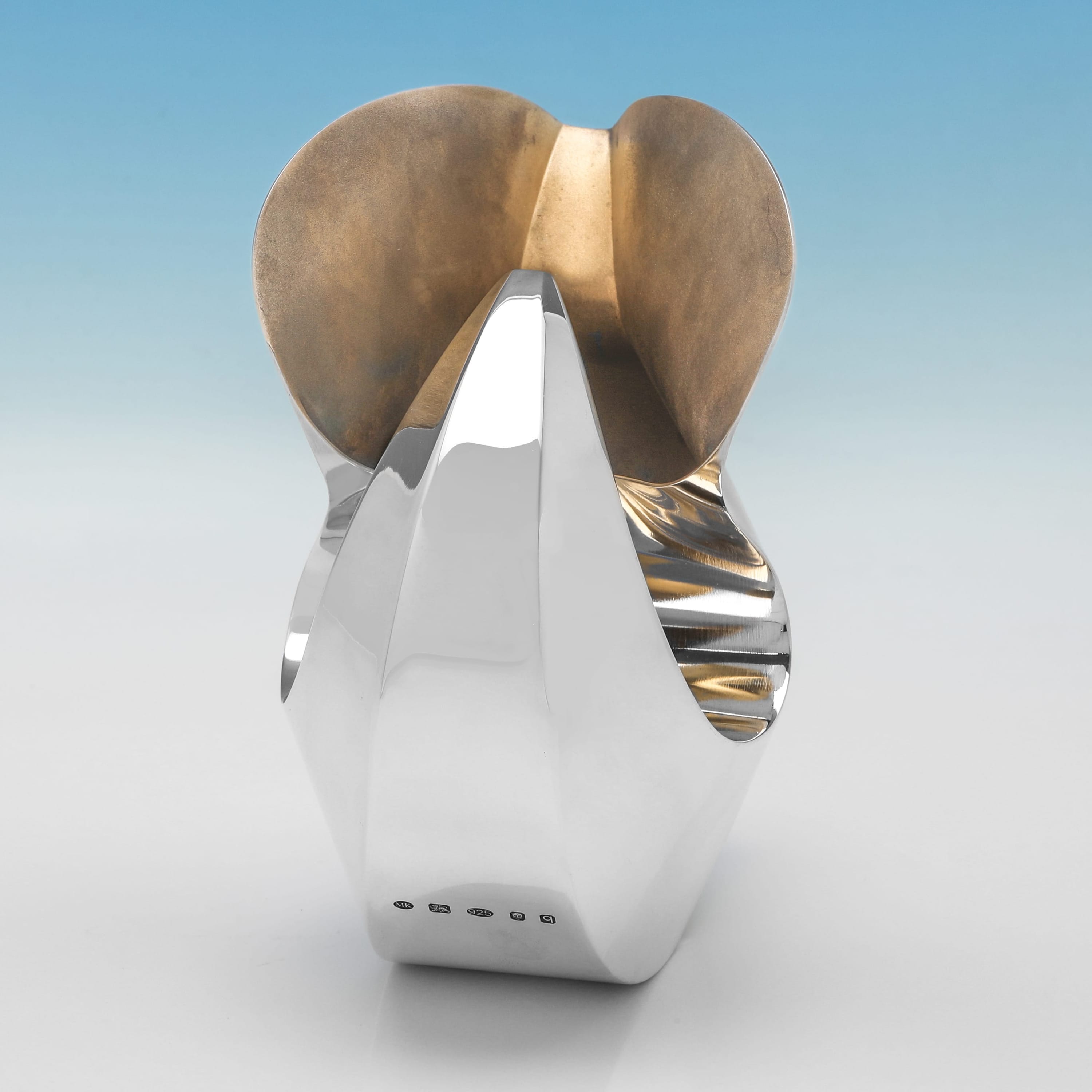 L8480: Hallmarked in London in 2015 by Martin Keane this sterling silver wine ewer or water jug is a striking, sculptural form, with a highly polished surface. Documented as the 'Yin Yang Carafe,' the design features a continuous flowing form, with a curved spout and handle. The wine carafe measures 7.25"(18.5cm) tall, by 7.25"(18.5cm) wide and 4.25"(11cm) deep, and weighs 25.56 troy ounces.