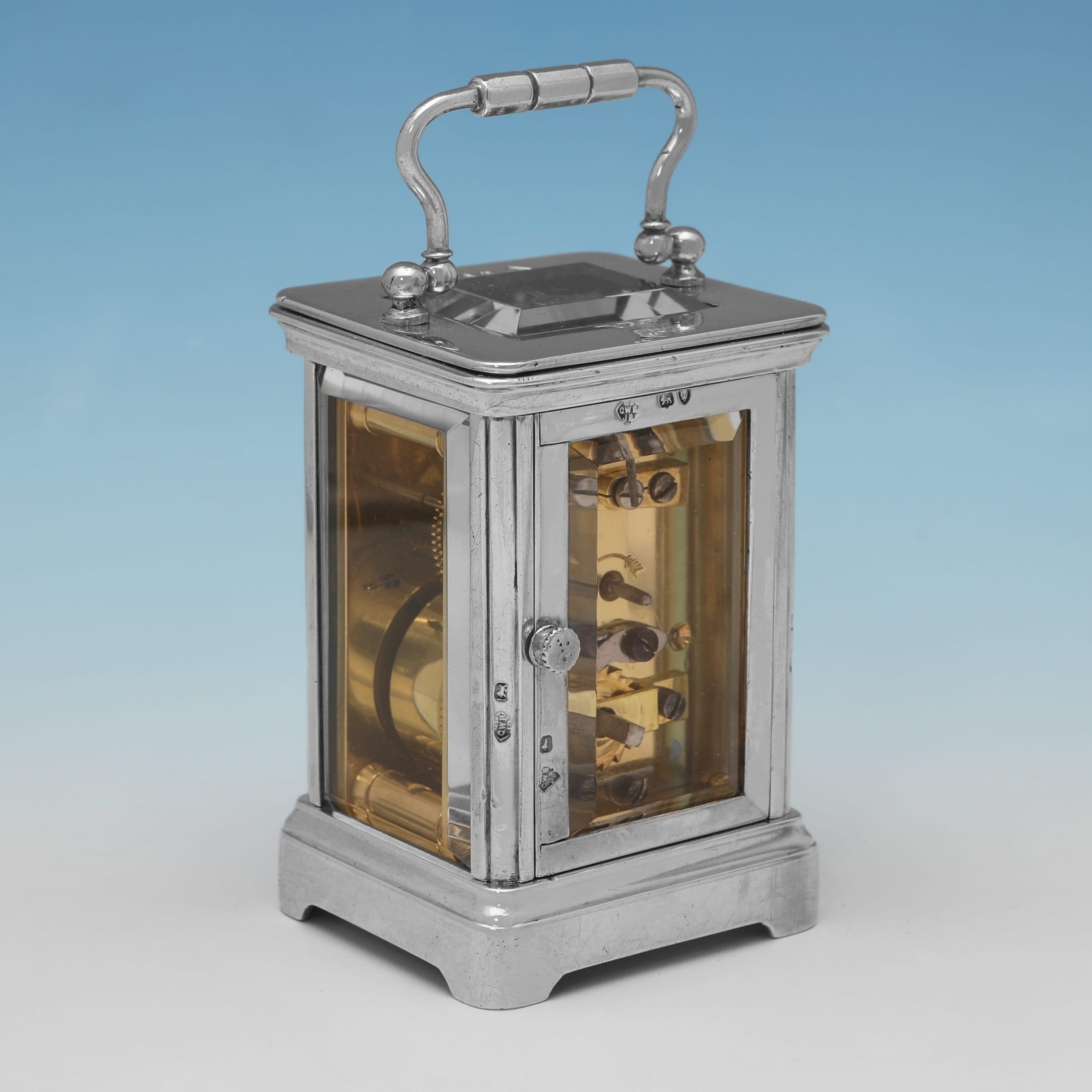 L8579: Hallmarked in London in 1890 by George Betjemann & Sons this fine Victorian antique sterling silver carriage clock has a hinged carrying handle and a polished silver case with glass panels to all four sides and the top. The clock features a white enamel dial with Roman numerals and is powered by a brass movement. The top is engraved with a crest. It measures 4"(10.5cm) tall, by 2"(5cm) wide and 1.75"(4.5cm) deep. The clock has been serviced.