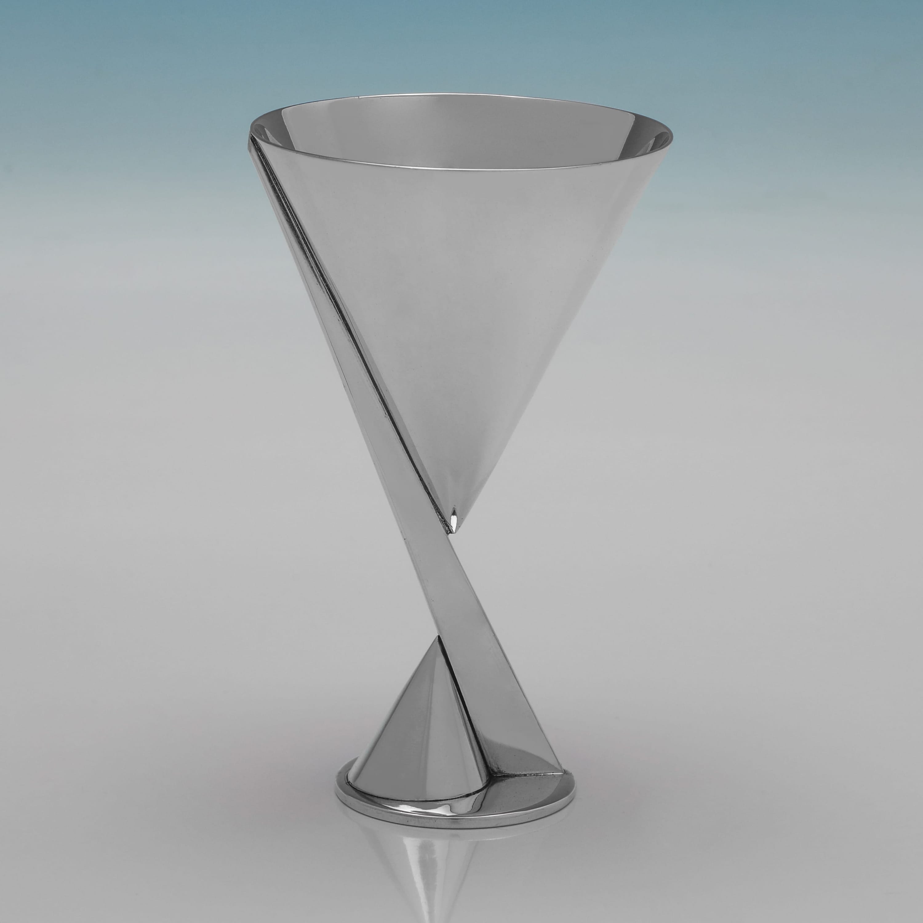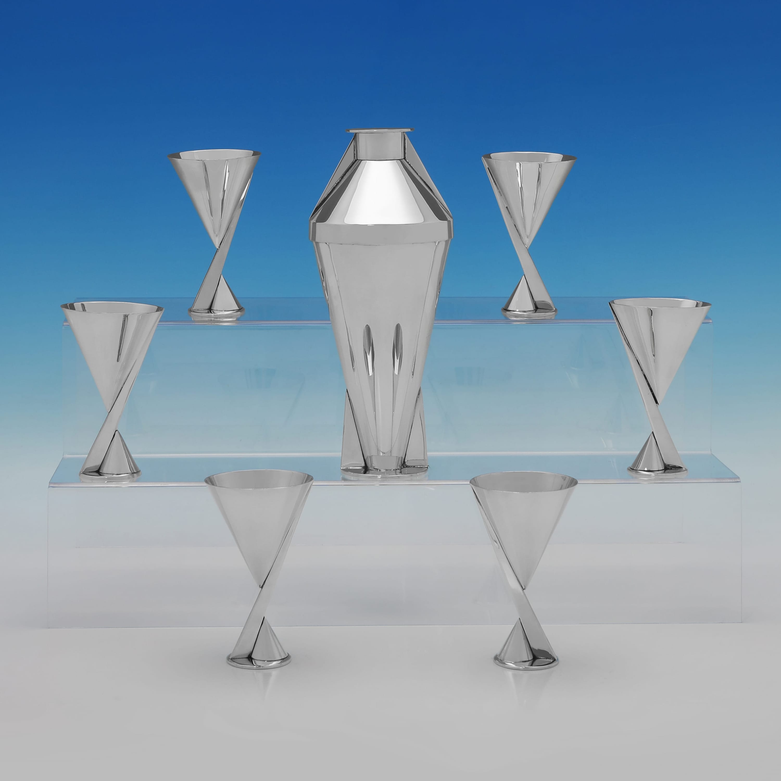 L8584: Made circa 1928 by Maison Desny, this striking and sought after silver plate cocktail set is of a highly architectural Art Deco design. The set comprises a three-piece cocktail shaker and six cocktail coupes, all featuring strong geometric, conical forms and a polished surface. The cocktail shaker measures 10"(25.5cm) tall by 4.25"(11cm) in diameter. Each coupe measures 4.75"(12cm) tall by 2.75"(7cm) in diameter.