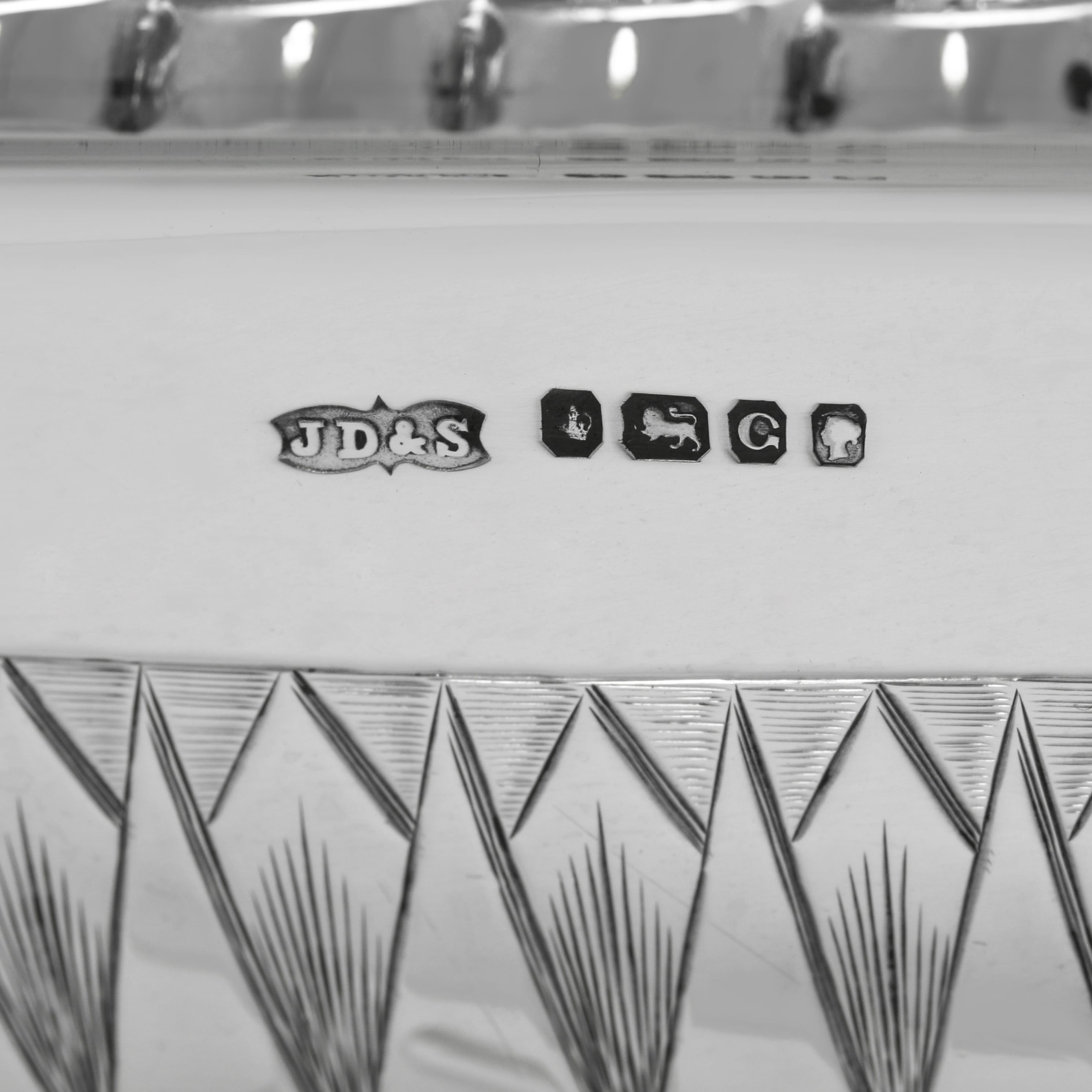 L8755: Hallmarked in Sheffield in 1874 by James Dixon & Sons this ornate Victorian sterling silver entrée dish is of an oval form with a domed, reversible lid and a removable handle. The body and lid are decorated with repoussé and chased foliate scrolls within engraved panels and have beaded borders, with a vacant cartouche to the centre of each side. The entrée dish measures 6.5"(16.5cm) tall, by 12.5"(31.5cm) wide and 9"(23cm) deep, and weighs 62.99 troy ounces.