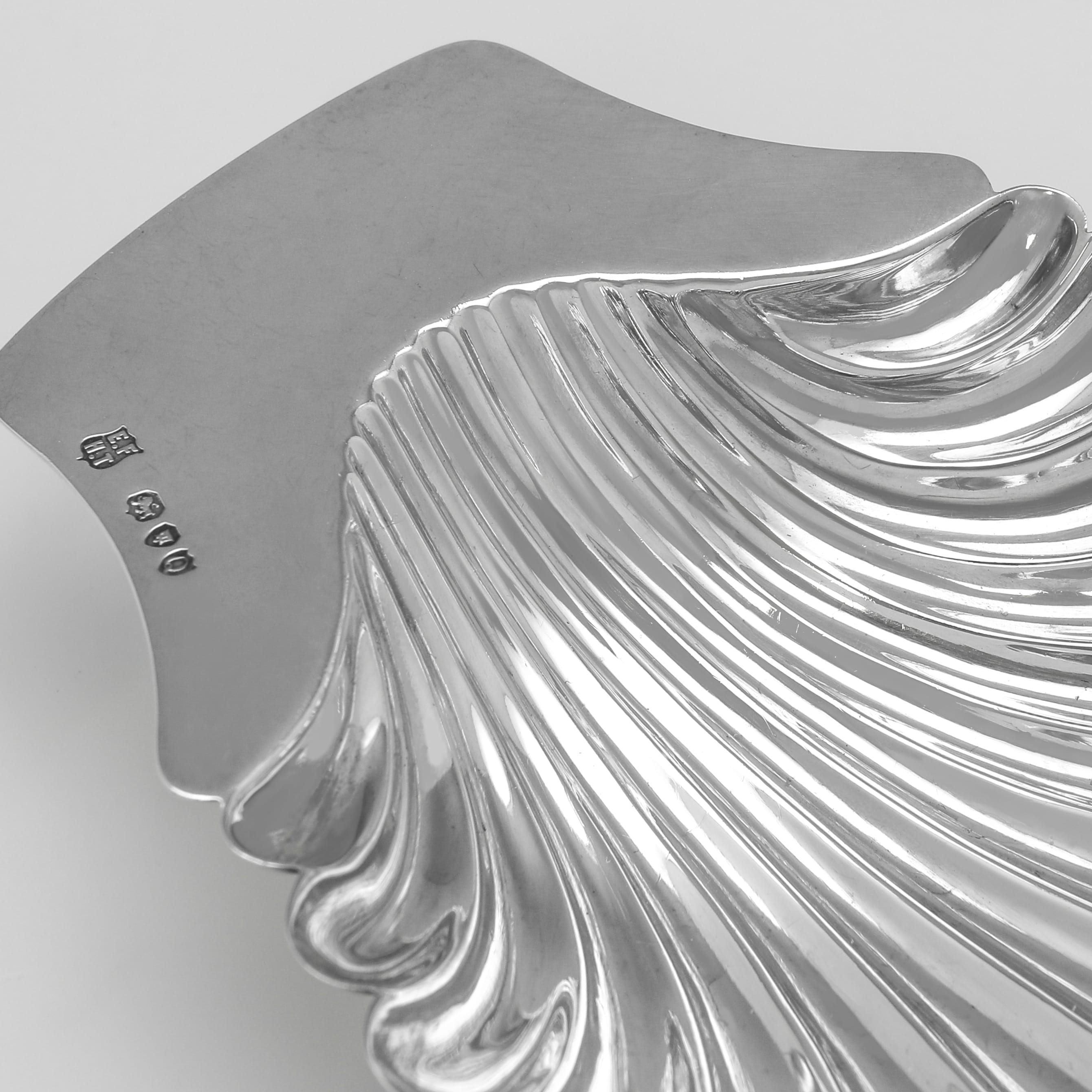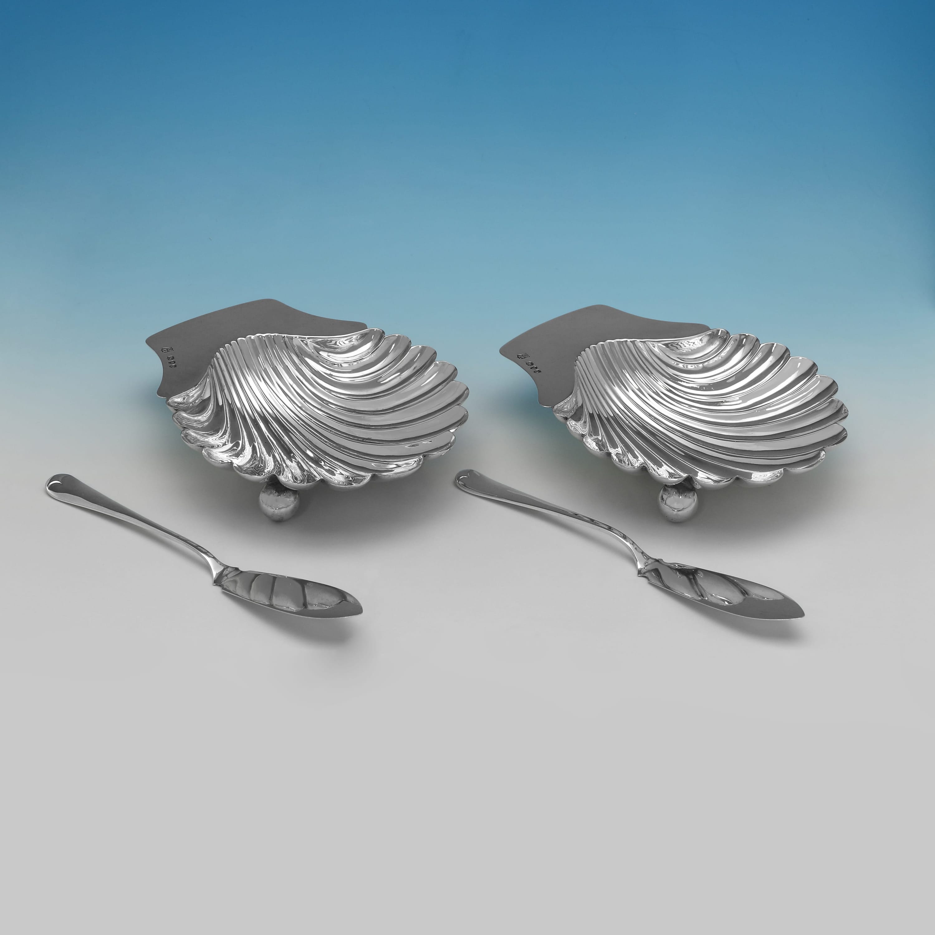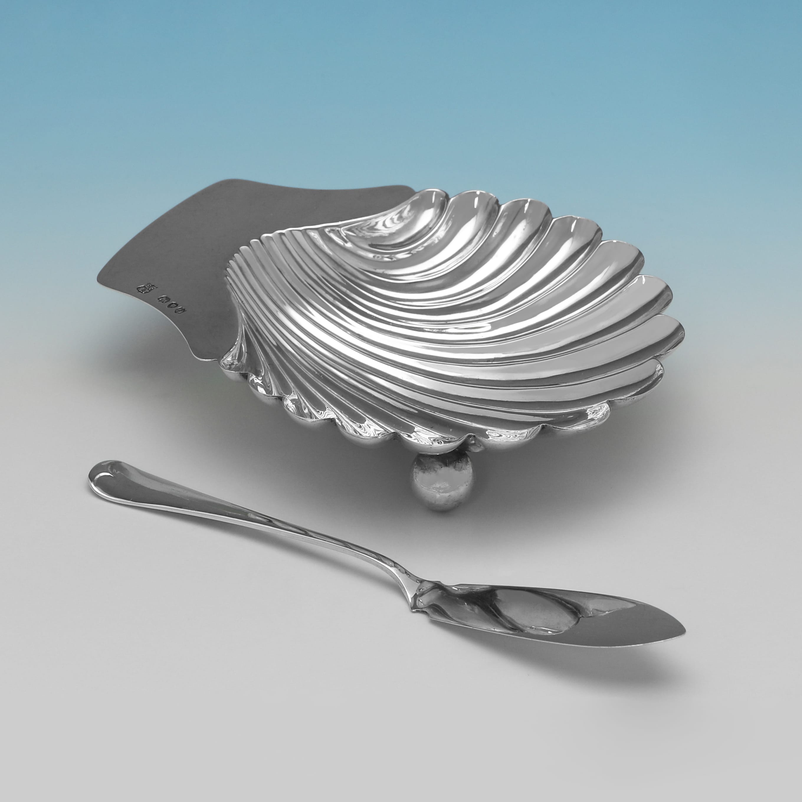 L8784: Hallmarked in London in 1891 by Edgar Finley & Hugh Taylor this fine Victorian antique sterling silver pair of butter dishes and knives is presented in a fitted case. Each butter dish is modelled in the shape of a scalloped shell standing on 3 ball feet. The set includes a pair of matching butter knives in Old English pattern. The silver has a combined weight of 5.65 troy ounces.