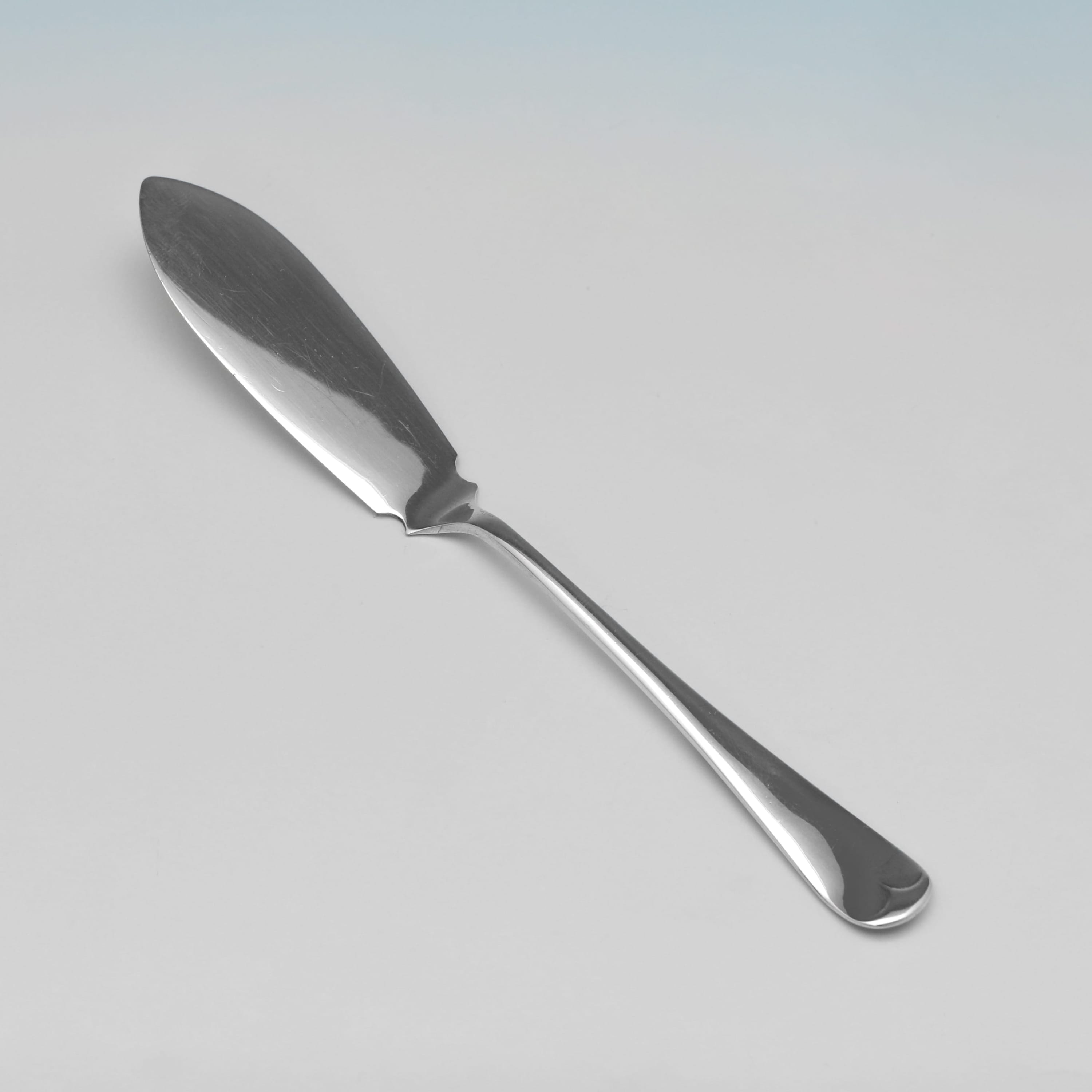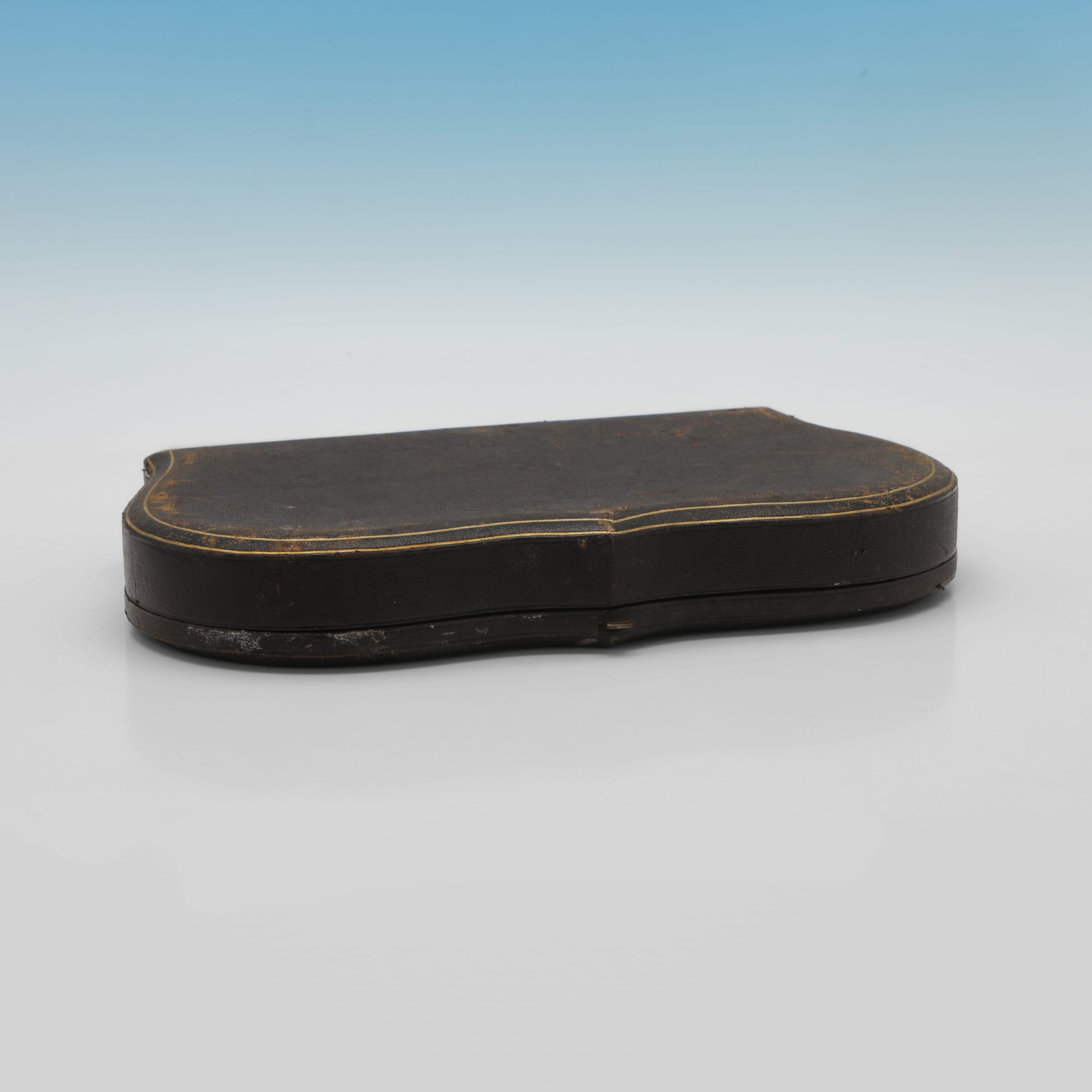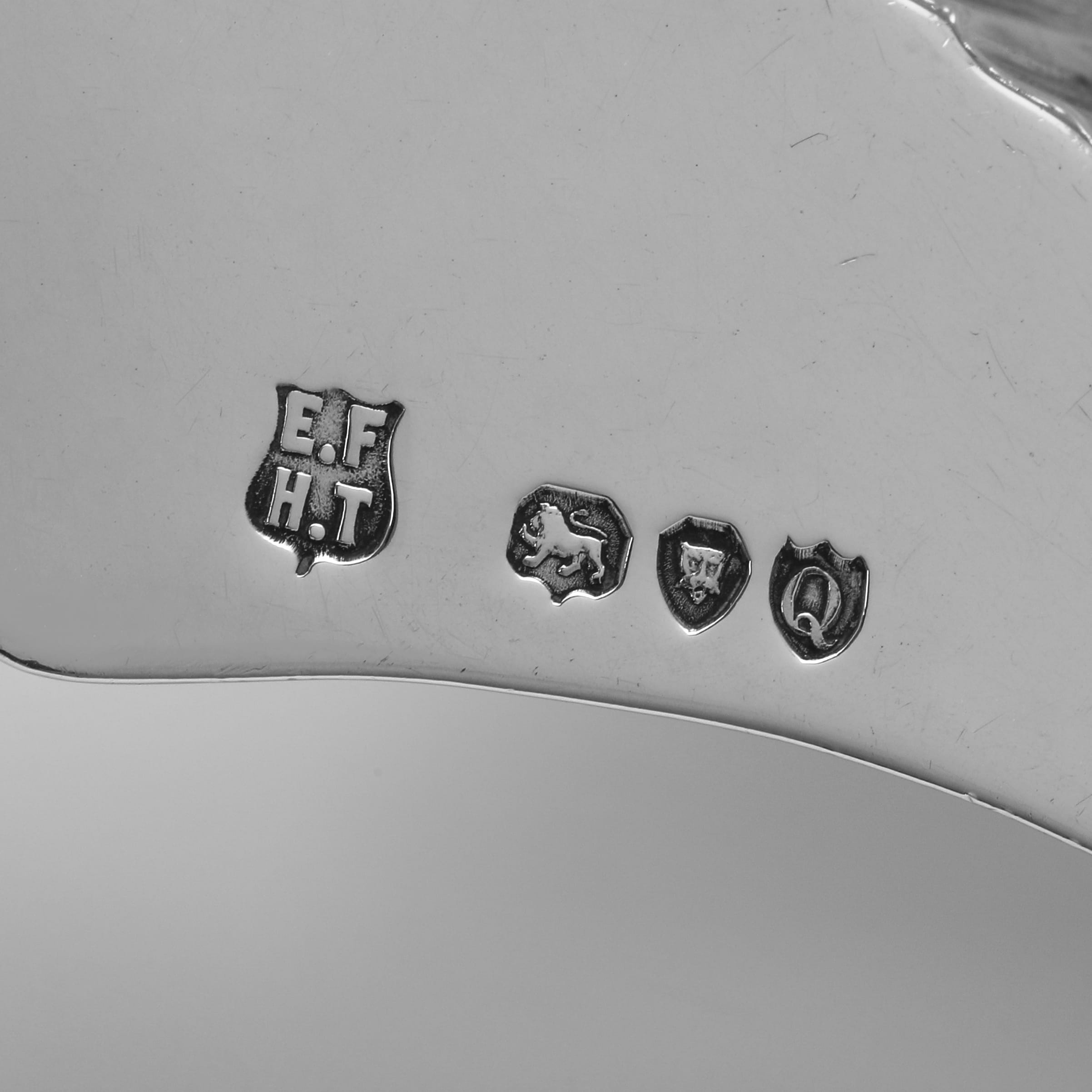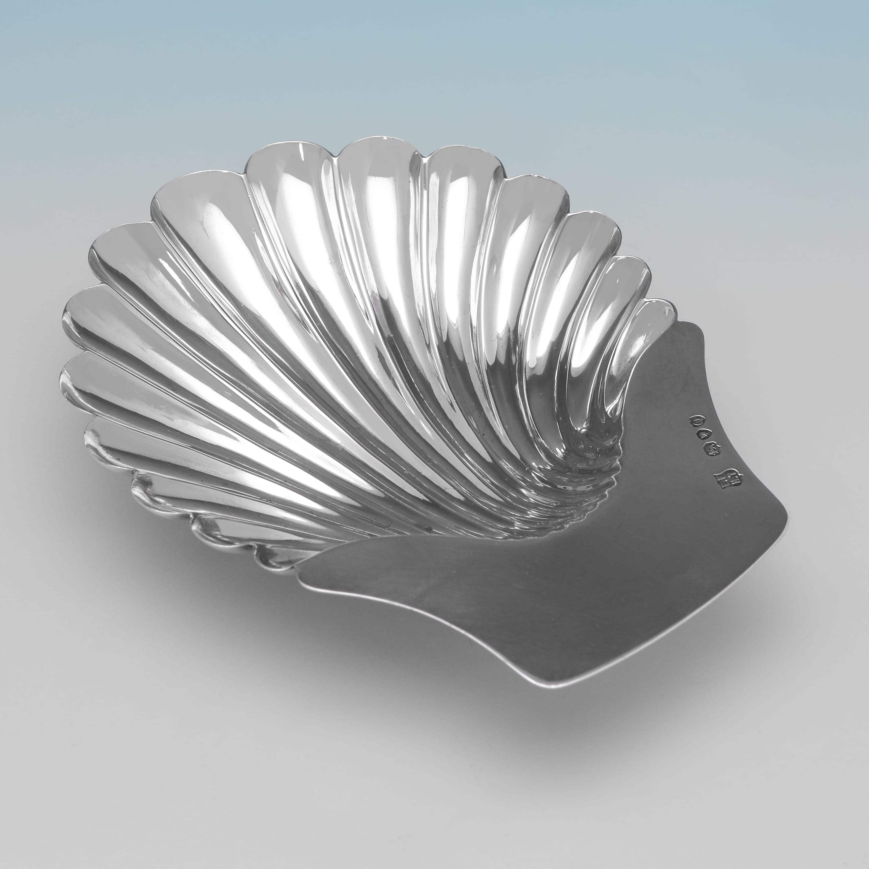 L8784: Hallmarked in London in 1891 by Edgar Finley & Hugh Taylor this fine Victorian antique sterling silver pair of butter dishes and knives is presented in a fitted case. Each butter dish is modelled in the shape of a scalloped shell standing on 3 ball feet. The set includes a pair of matching butter knives in Old English pattern. The silver has a combined weight of 5.65 troy ounces.