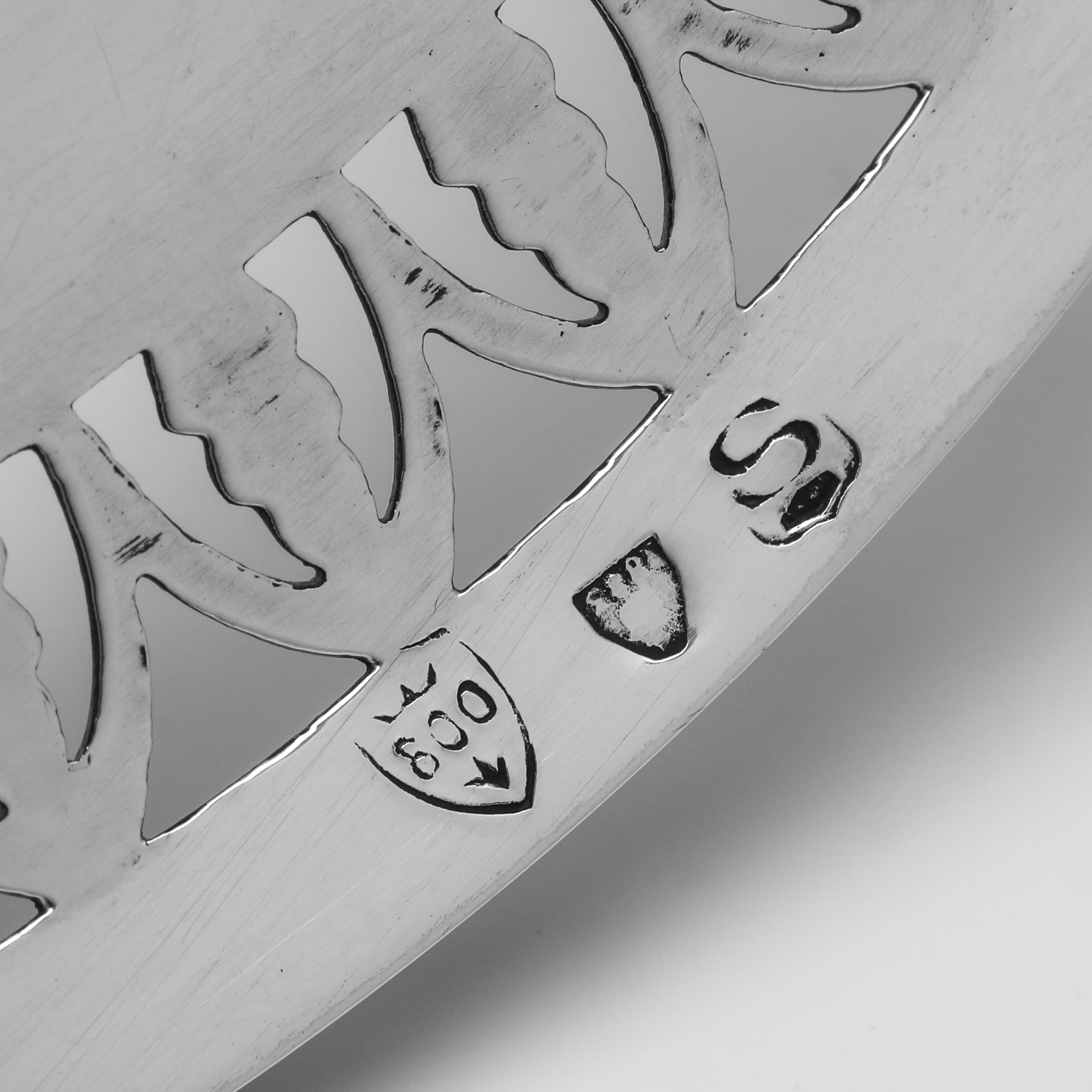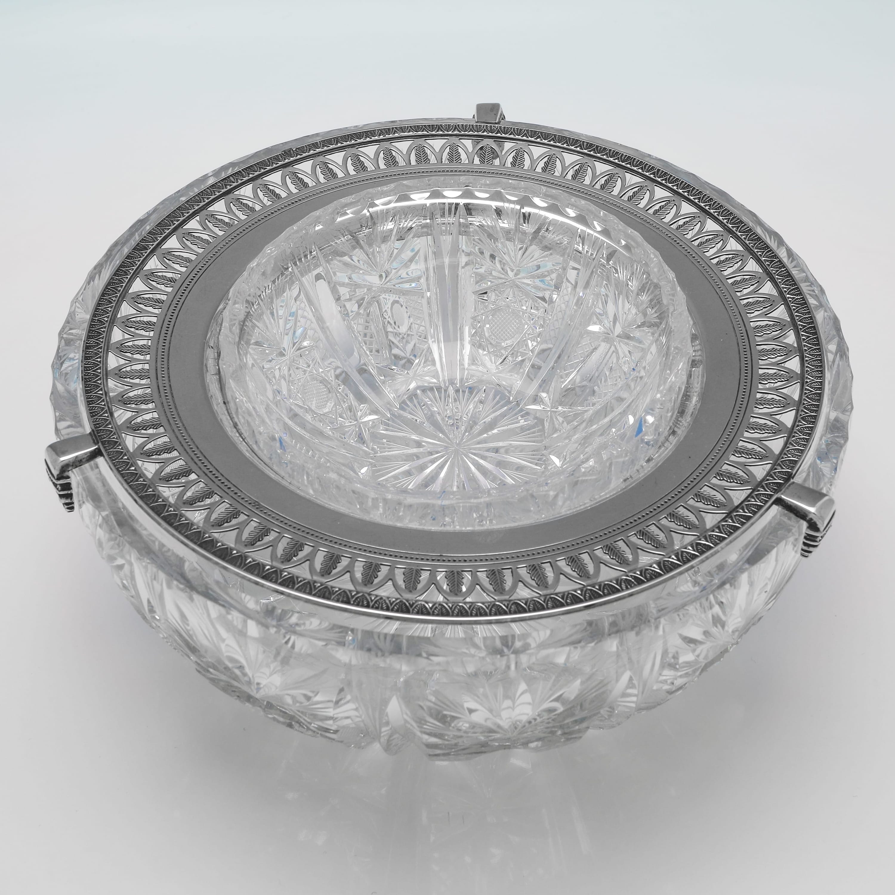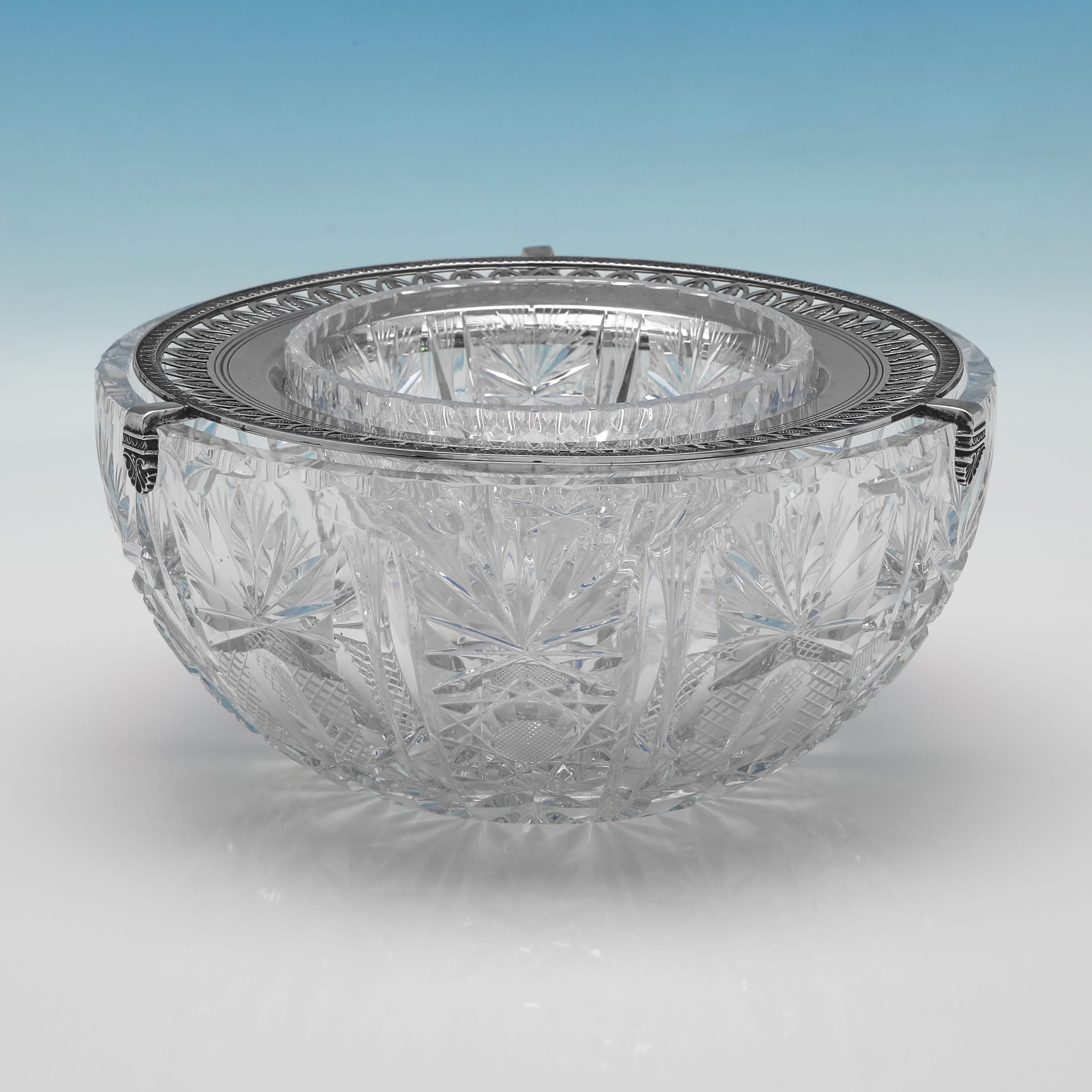L8837: Made circa 1920, this elegant antique German 800 standard silver and cut-glass caviar dish is of a fine circular form with a pierced foliate silver rim. The stand holds a large outer bowl for ice and a smaller inner bowl for caviar. Both bowls are decorated with fine cut-glass geometric and starburst patterns. It measures 4.25"(11cm) tall, by 9"(23cm) in diameter.