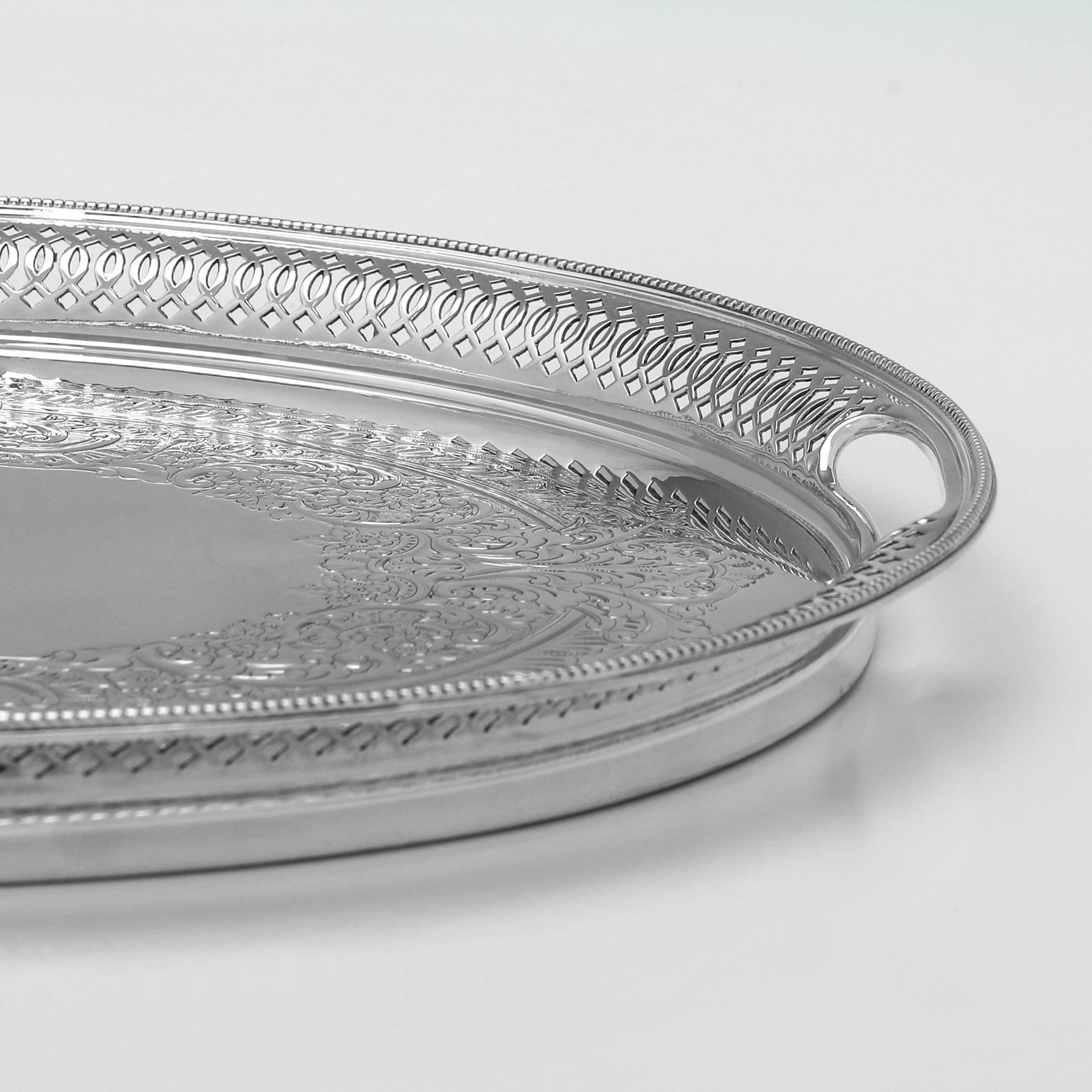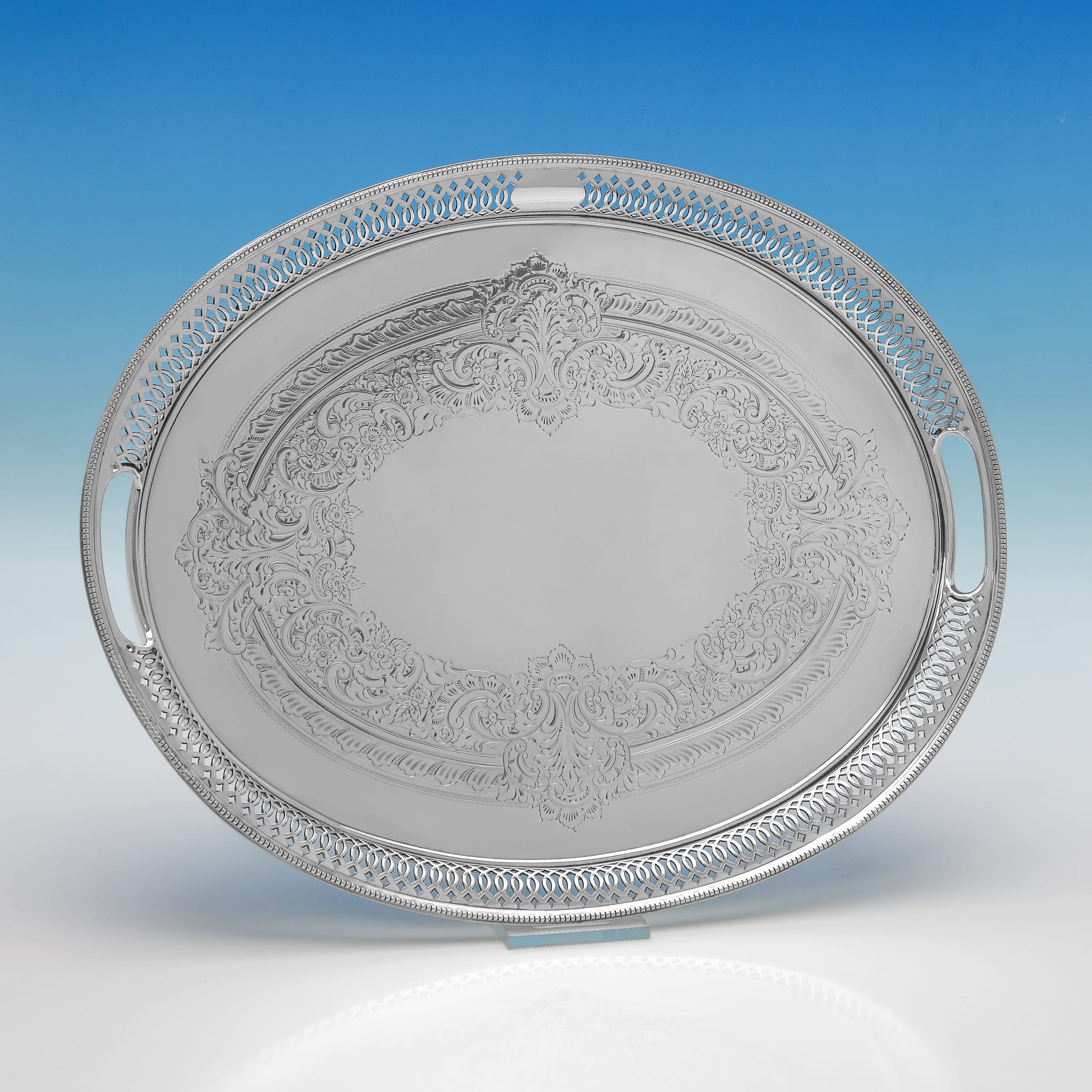 L8896: Hallmarked in Sheffield in 1897 by Martin & Hall this elaborate Victorian antique sterling silver oval tray has a finely pierced gallery with an intricate interlocking design. The centre of the tray is decorated with fine foliate scroll engraving and an oval vacant cartouche. The tray measures 1"(2.5cm) tall, by 13.5"(34cm) from handle to handle and 10.75"(27.5cm) deep, and weighs 27.39 troy ounces.