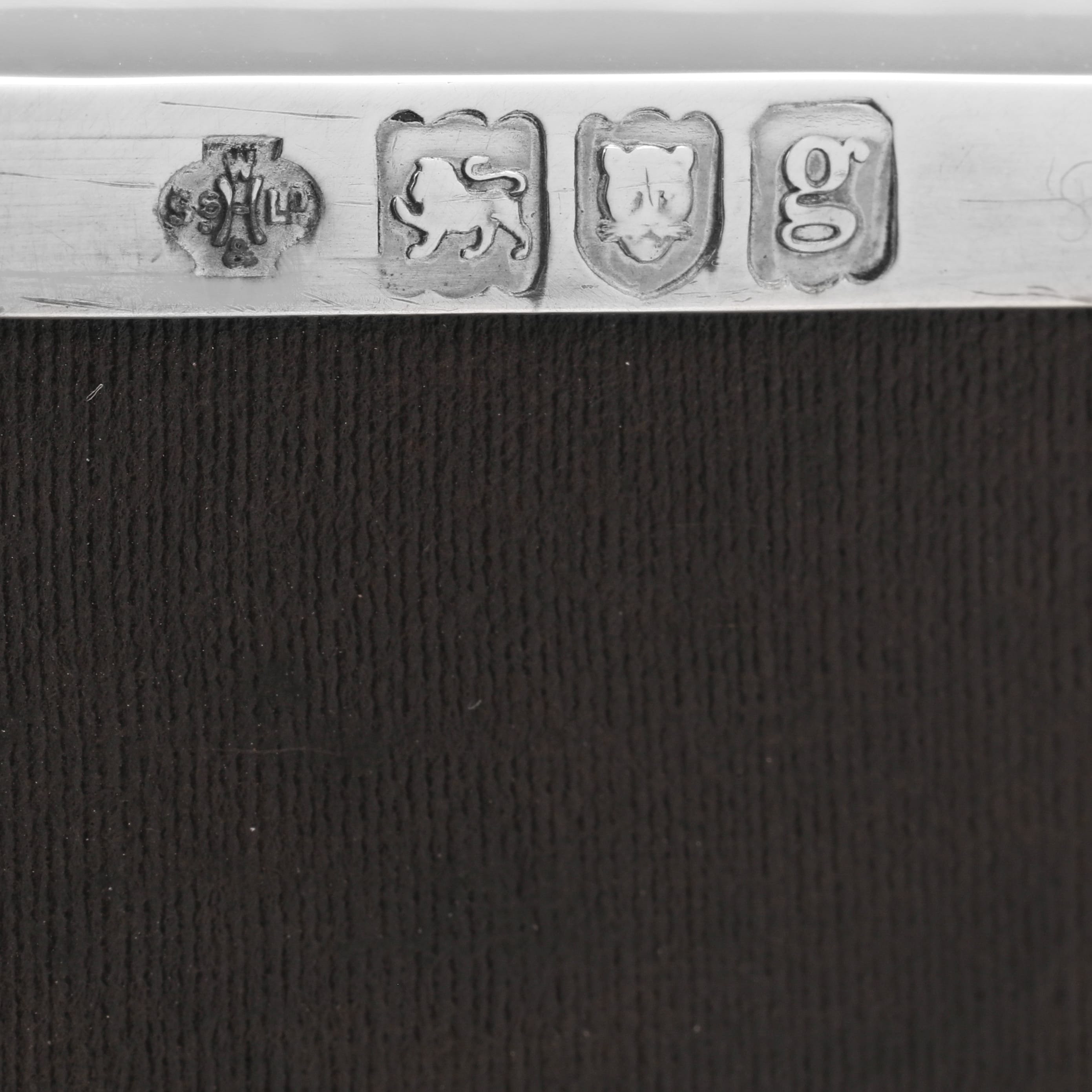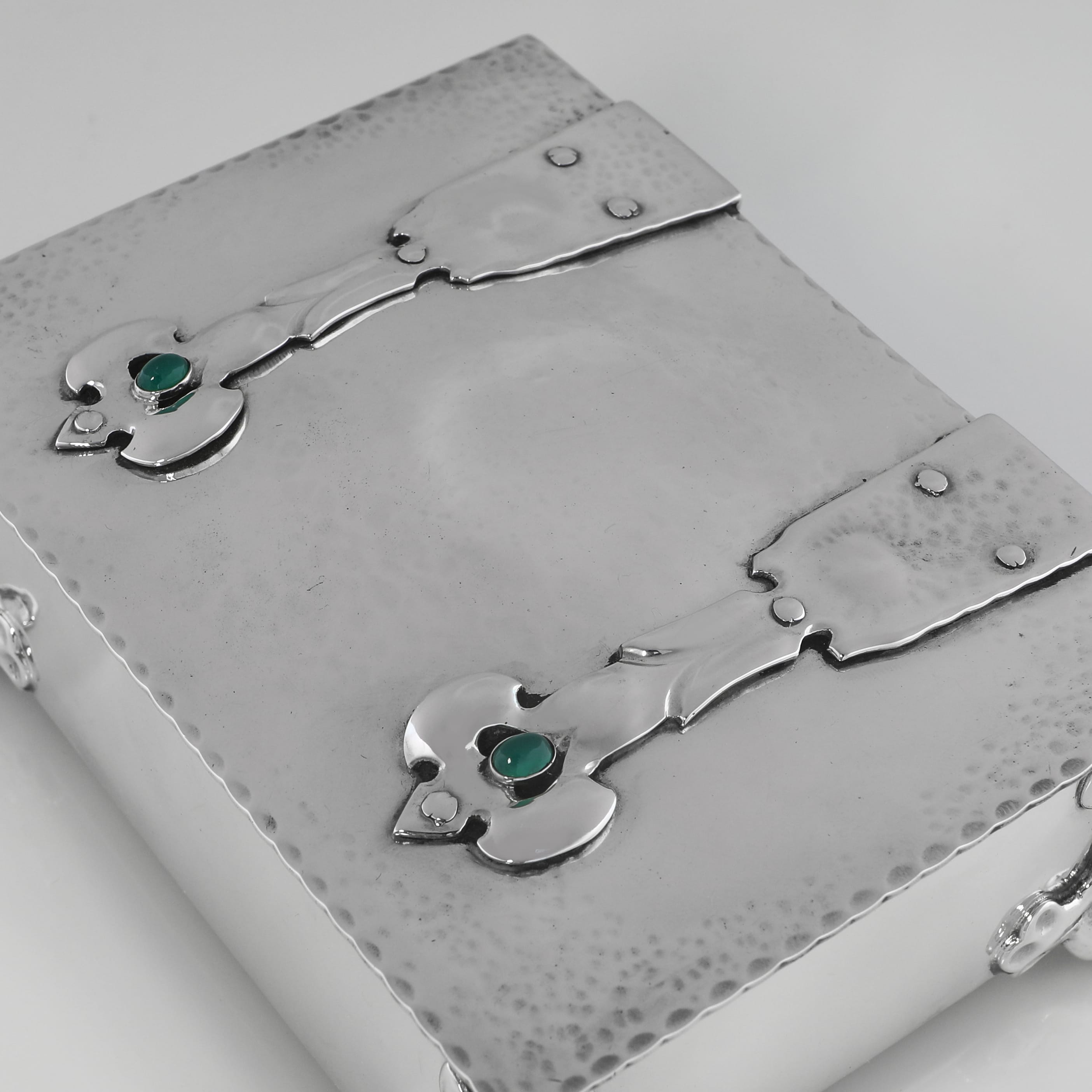 L8974: Hallmarked in London in 1902 by William Hutton & Sons Ltd. this distinctive Edwardian antique sterling silver jewellery box, is of the Arts and Crafts style with a rectangular, planished body and hinged lid. The box features cast decorative corner brackets and stylised iron hinge straps applied to the lid, each set with a green cabochon stone and a green velvet lined interior. It measures 2.25"(6.5cm) tall, by 5.5"(14cm) wide and 4"(10.5cm) deep.