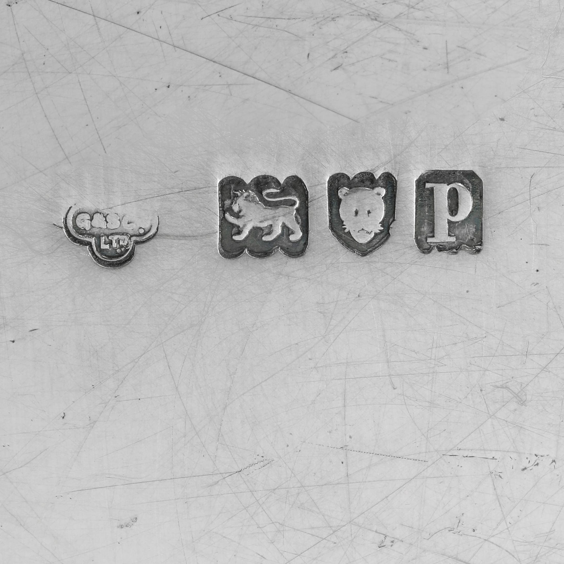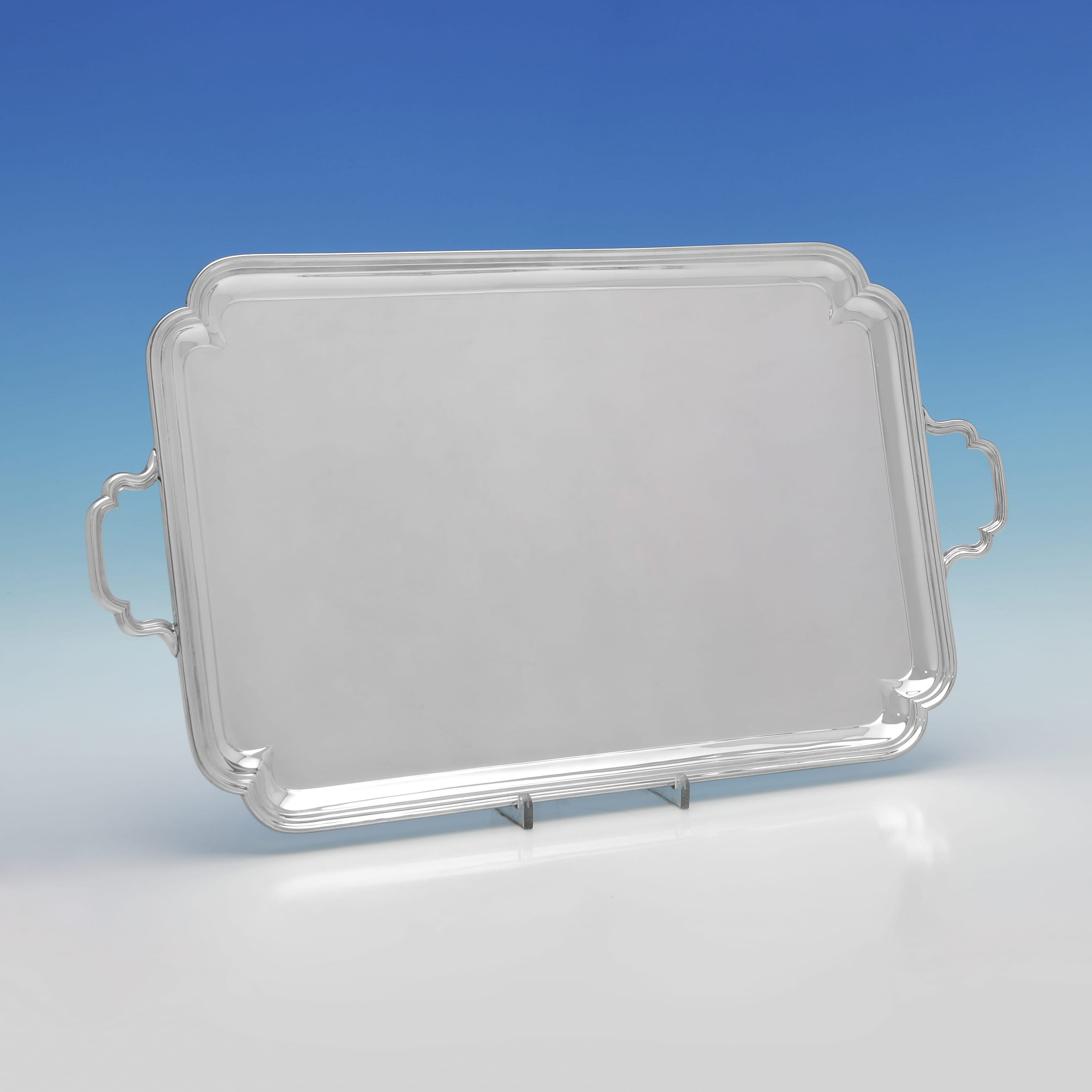 L8975: Hallmarked in London in 1910 by Goldsmiths & Silversmiths Co., this elegant, antique, George V, sterling silver tray features shaped corners, applied handles, and a reeded border. The tray measures 1.25" (3.5cm) tall, by 21.5" (54.5cm) from handle to handle and 12" (30.5cm) deep, and weighs 65.83 troy ounces.
