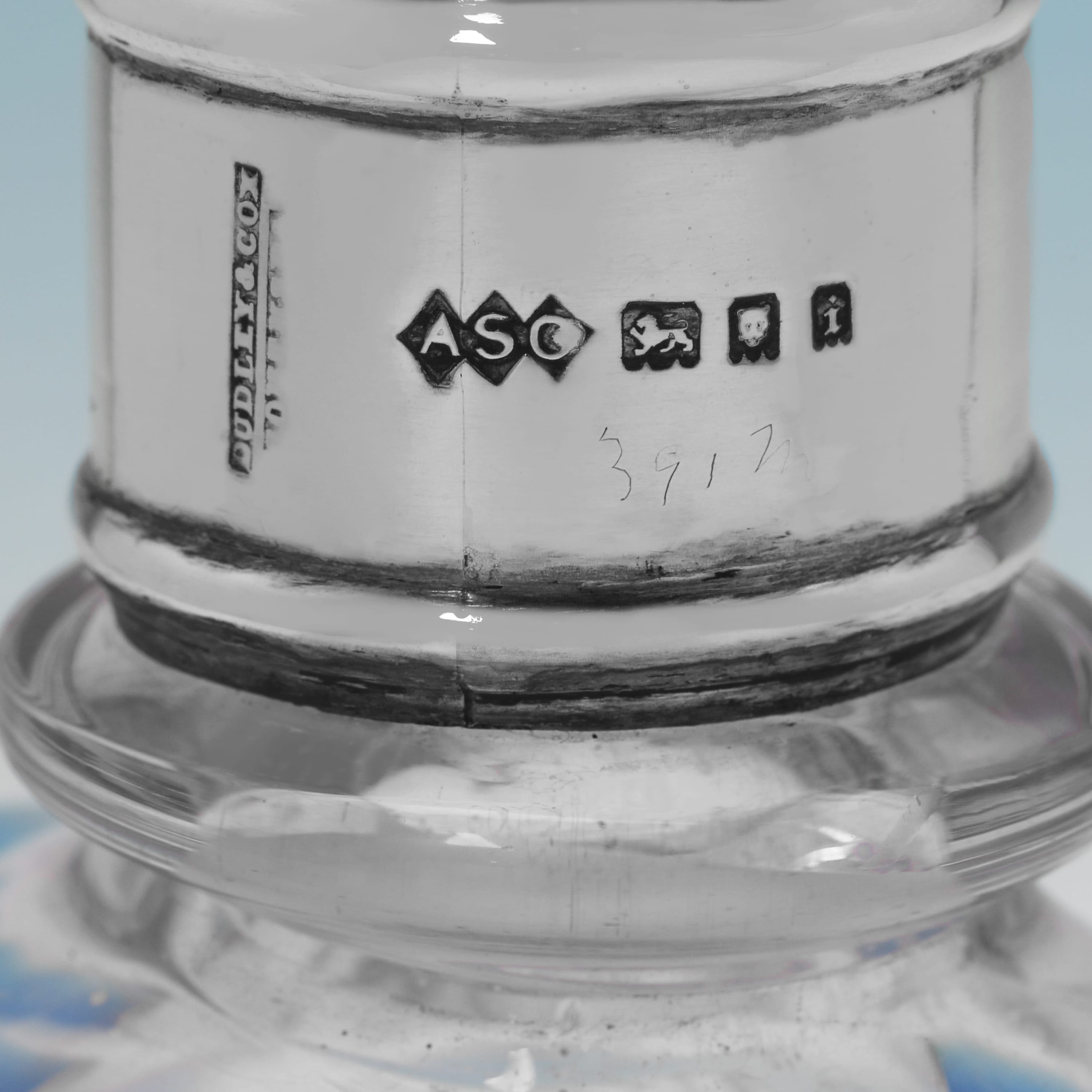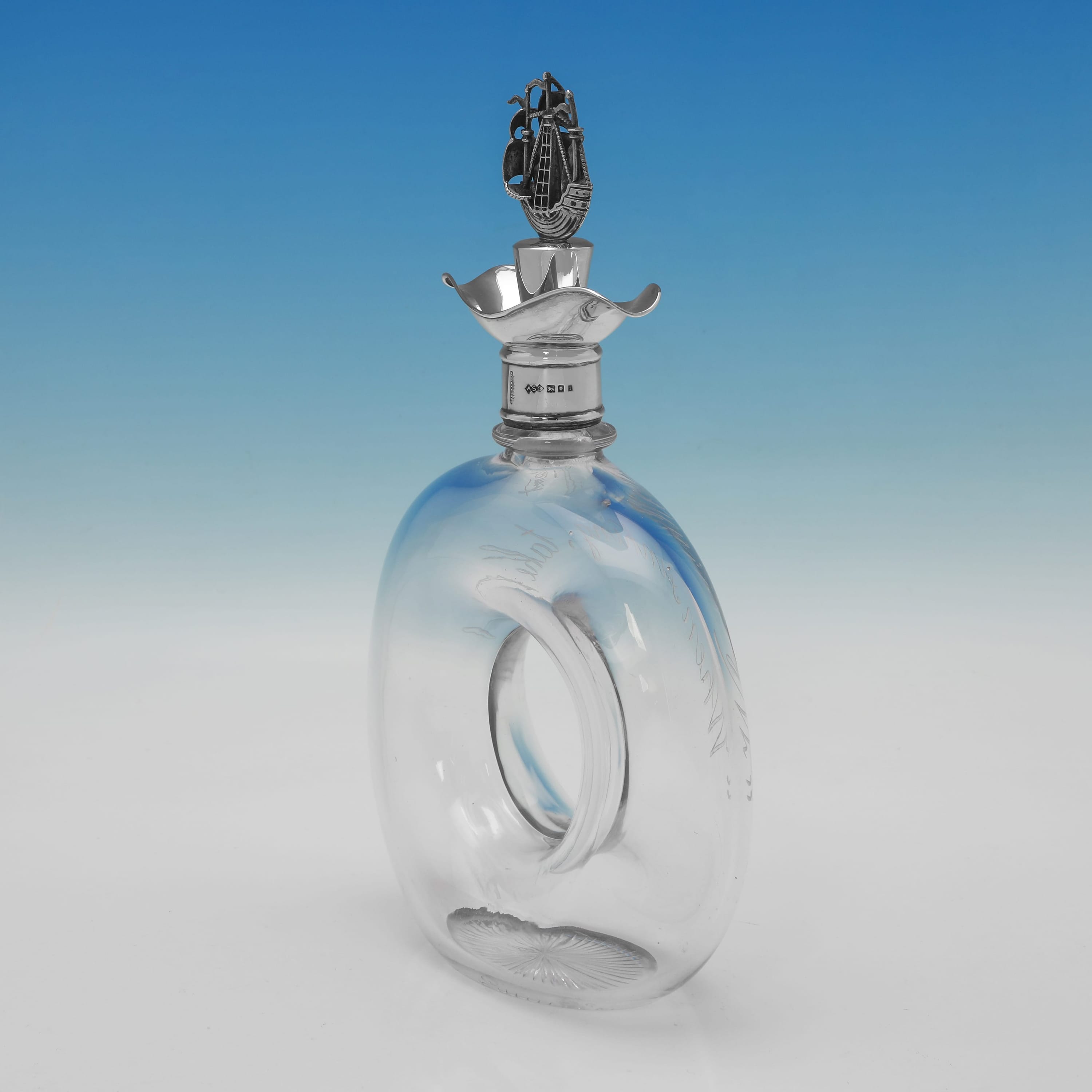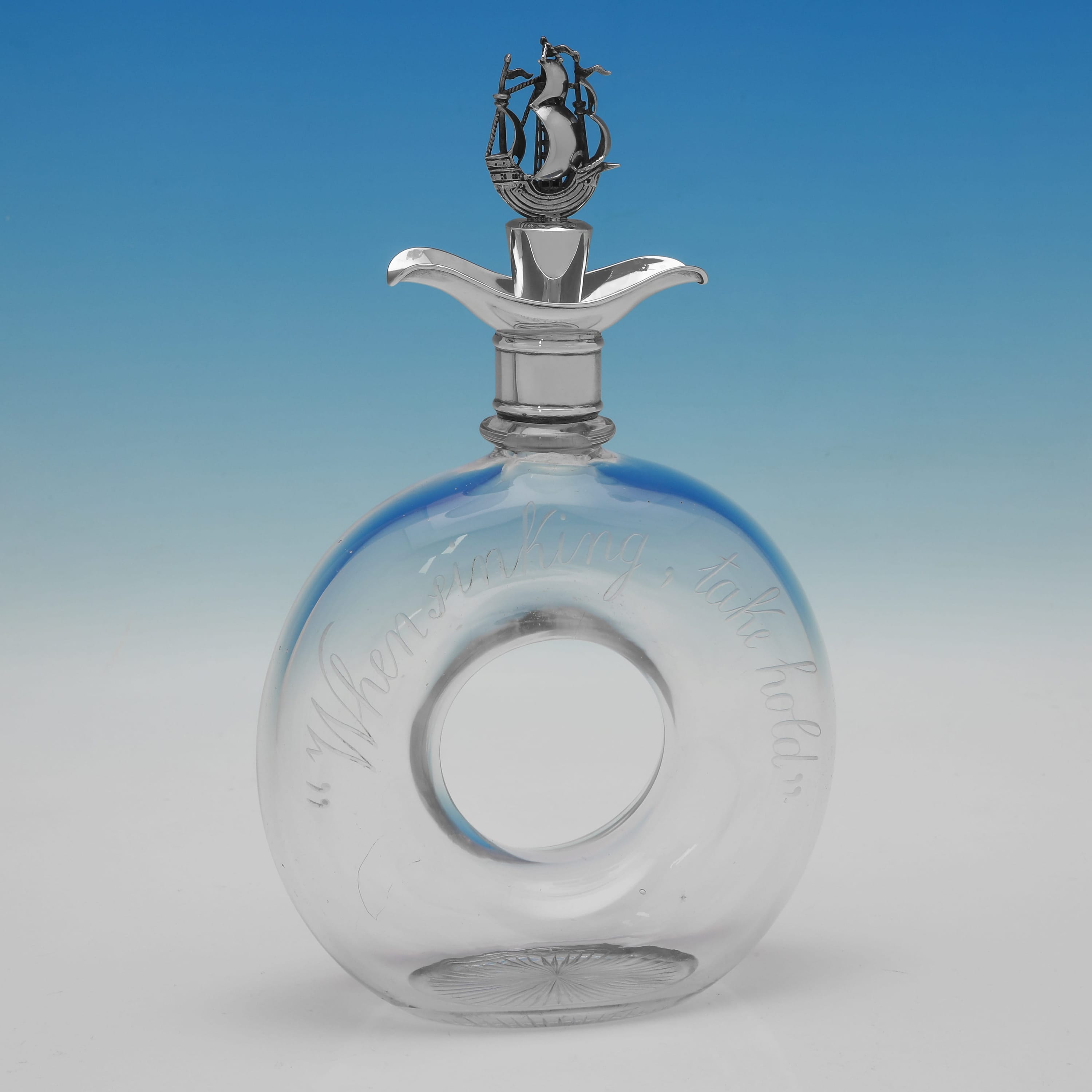 L8986: Hallmarked in London in 1924 by Dudley & Cox this unusual George V sterling silver and glass decanter is of a distinctive ring or 'lifebuoy' form and is hand-engraved with the motto "When sinking, take hold." The decanter is complete with its original sterling silver stopper, which is modelled as a stylised three-masted sailing ship. It measures 11.25"(29cm) tall, by 6.75"(17cm) wide and 2.75"(7cm) deep.