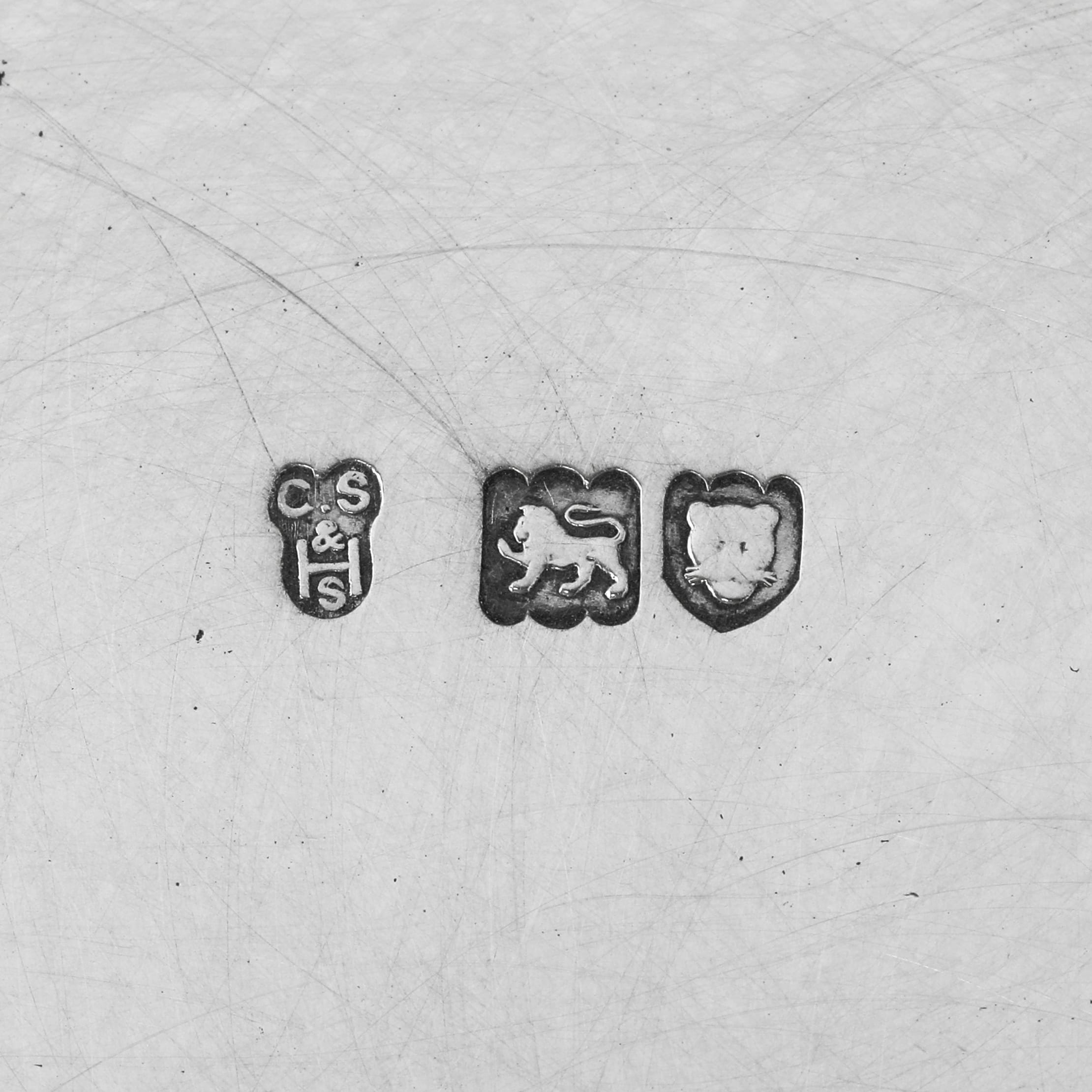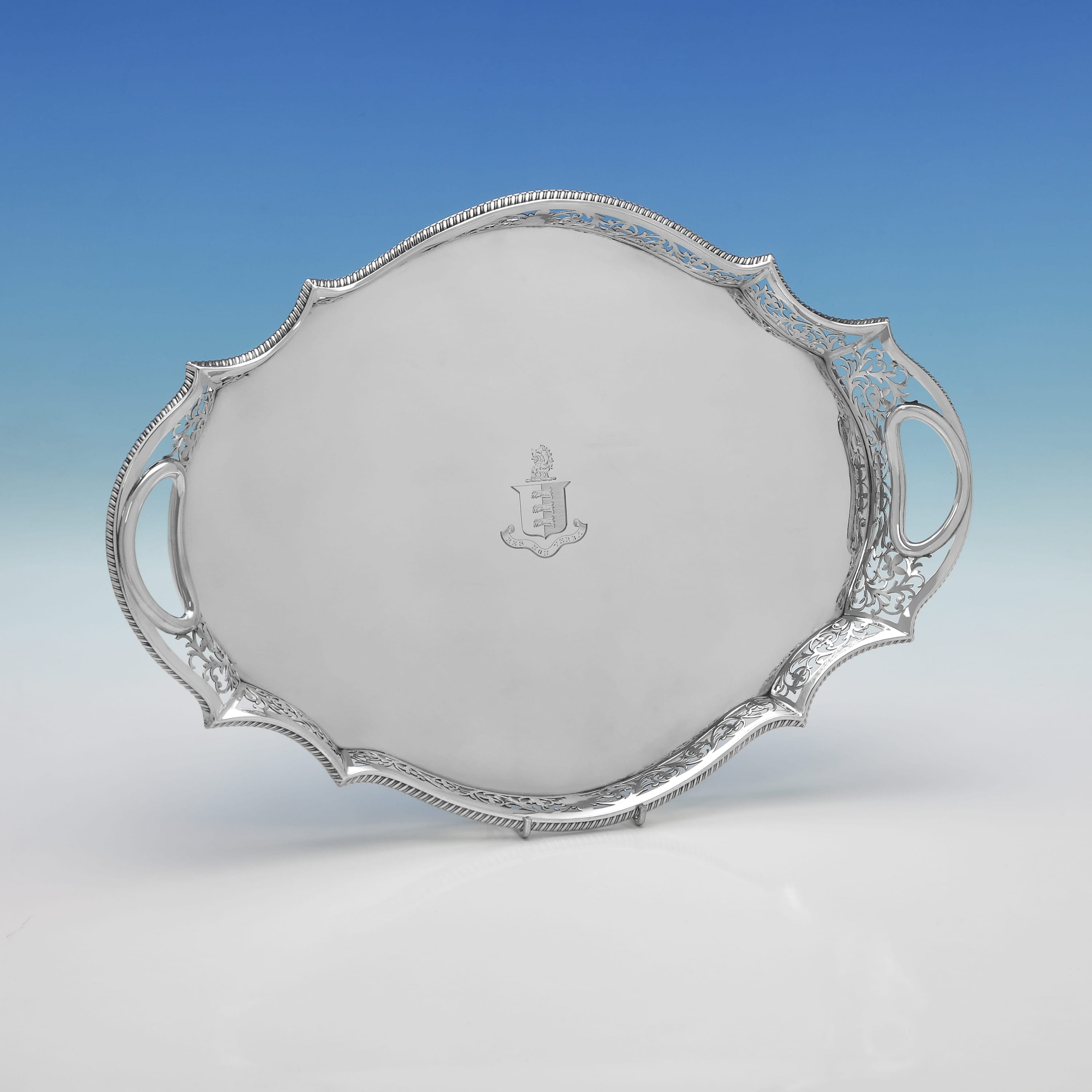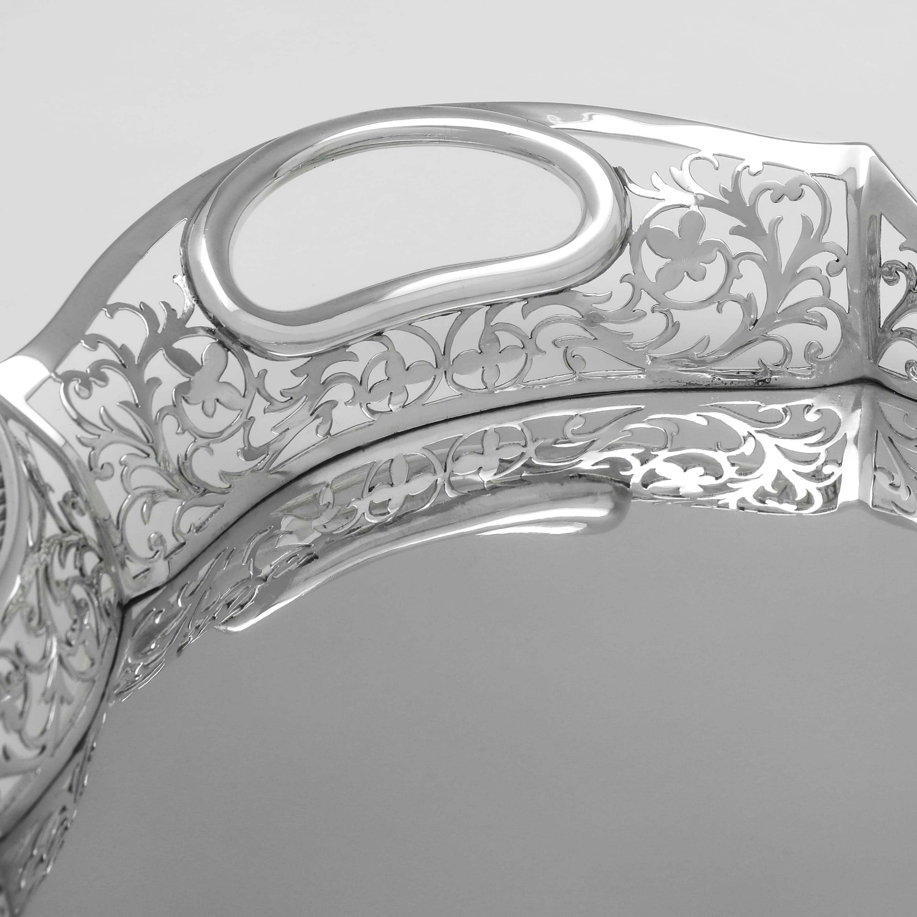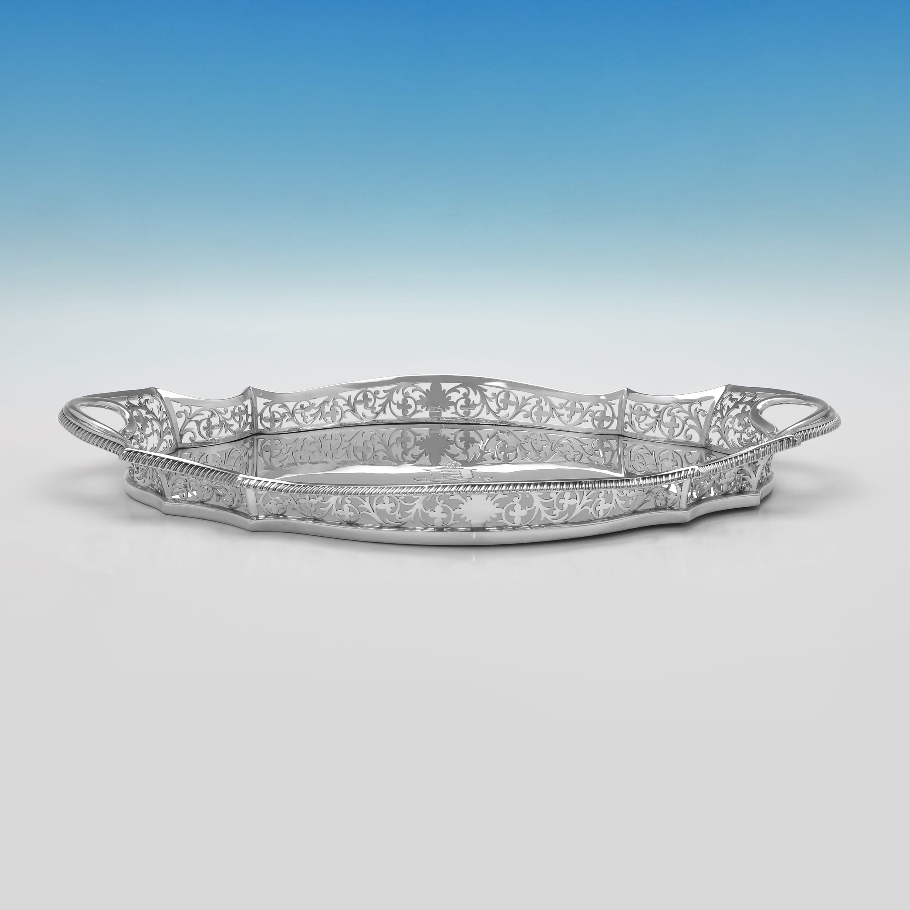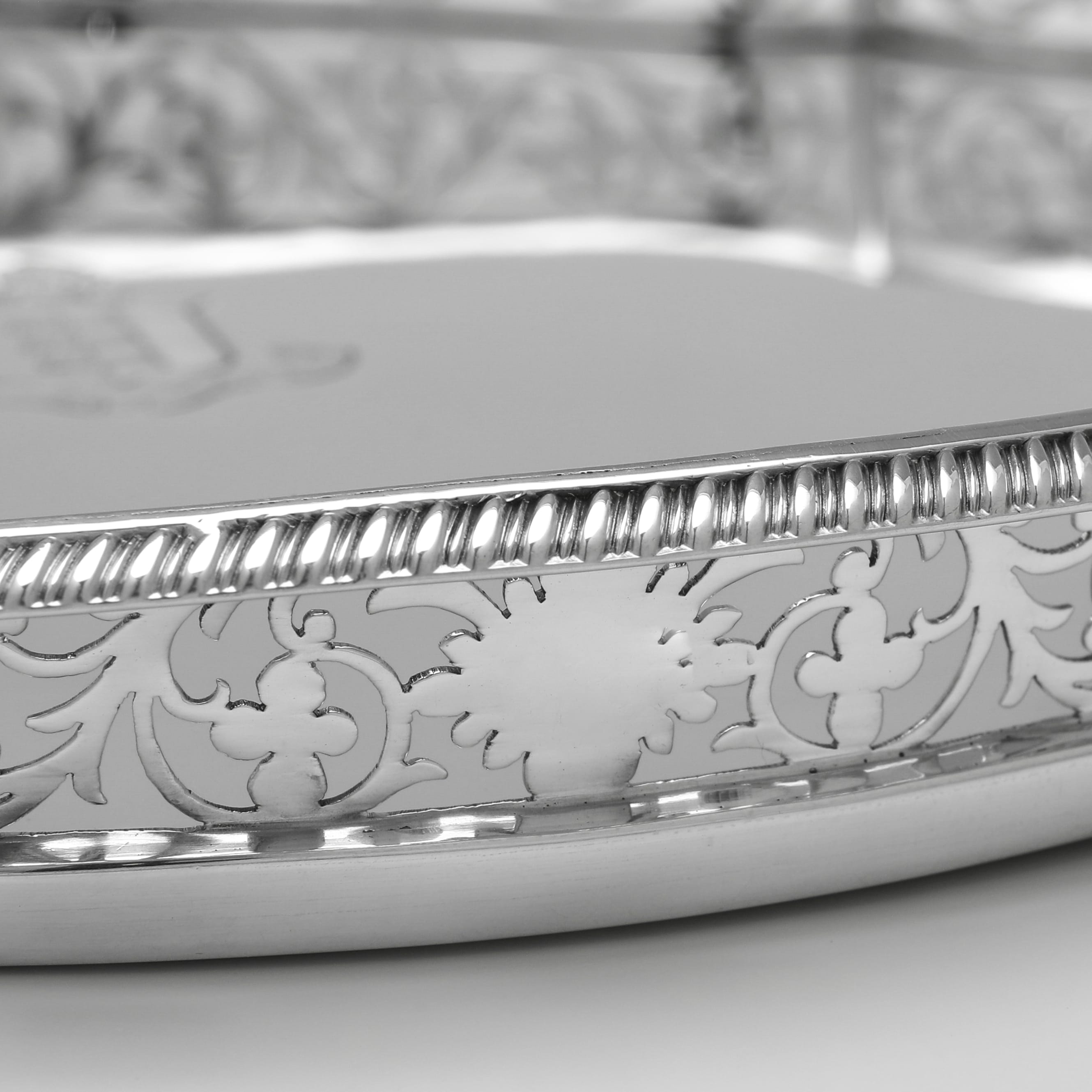 L8987: Hallmarked in London in 1907 by Charles Stuart Harris this ornate Edwardian antique sterling silver tray is of a navette form with a gadroon border, a pierced gallery with foliate scrolls and a pair of open handles. The surface is engraved with a central armorial crest and the motto "Res Non Verba." It measures 1.75"(4.5cm) tall, by 16.5"(42cm) from handle to handle and 11.5"(29cm) deep, and weighs 36.06 troy ounces.