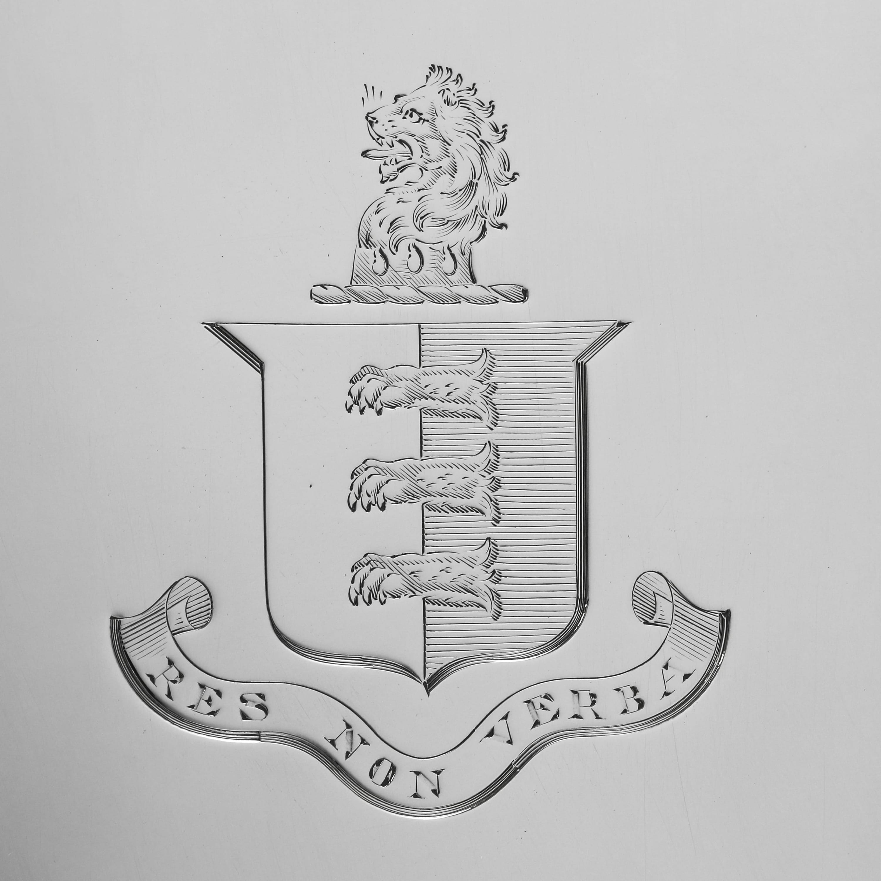 The tray is engraved with the armorial crest of the Wilson family of Wellsbourne. The shield is divided vertically, displaying three lions' gambs (paws). The crest above the shield is a lion's head couped, gouttés de sang (with drops of blood), and the motto below is "Res Non Verba," which is Latin for "Deeds, not words."