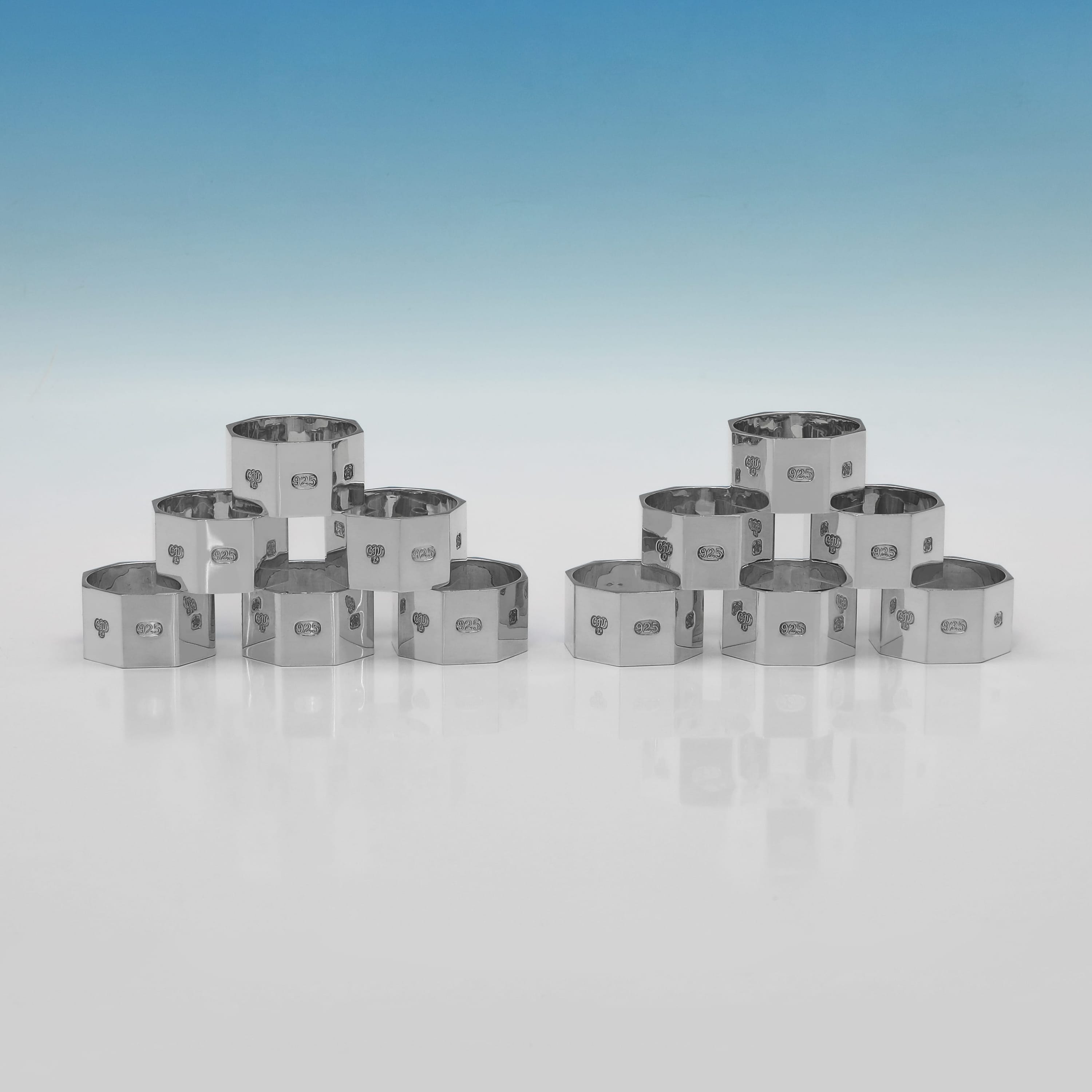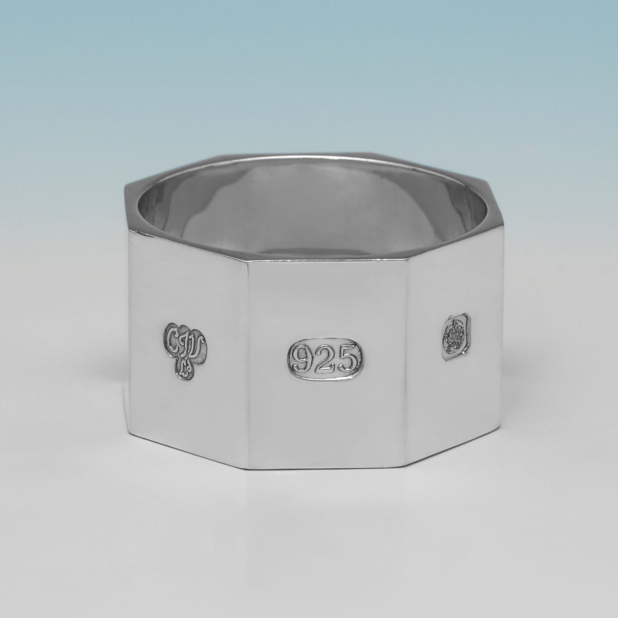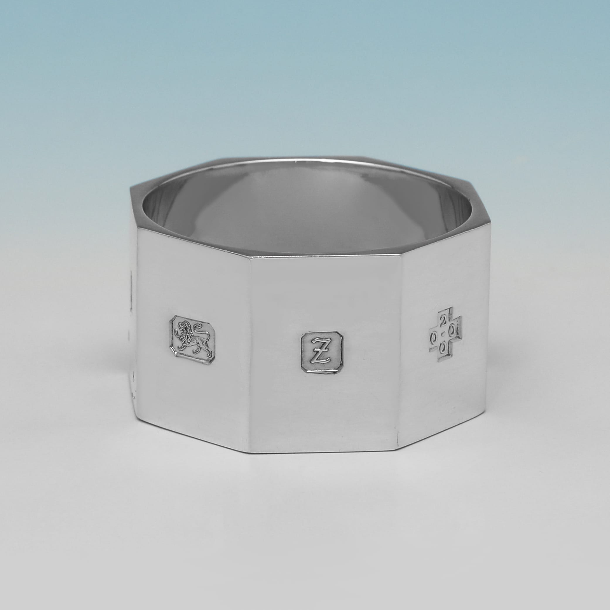L8998: Hallmarked in Sheffield in 1999 by C. J. Vander, this very handsome Elizabeth II period, sterling silver set of twelve napkin rings is of octagonal form, featuring a sleek, modernist design. The set weighs an impressive feeling 29.41 troy ounces.