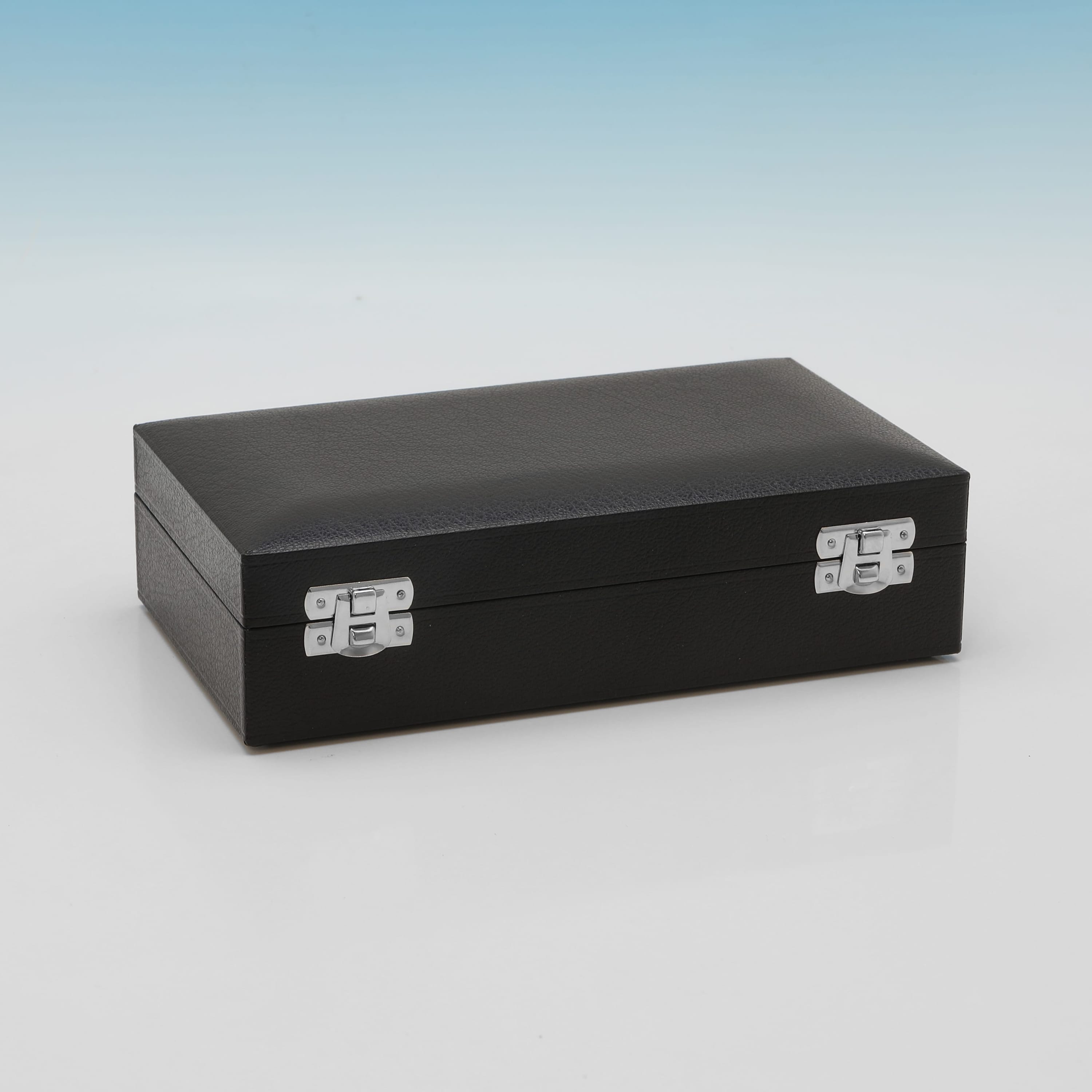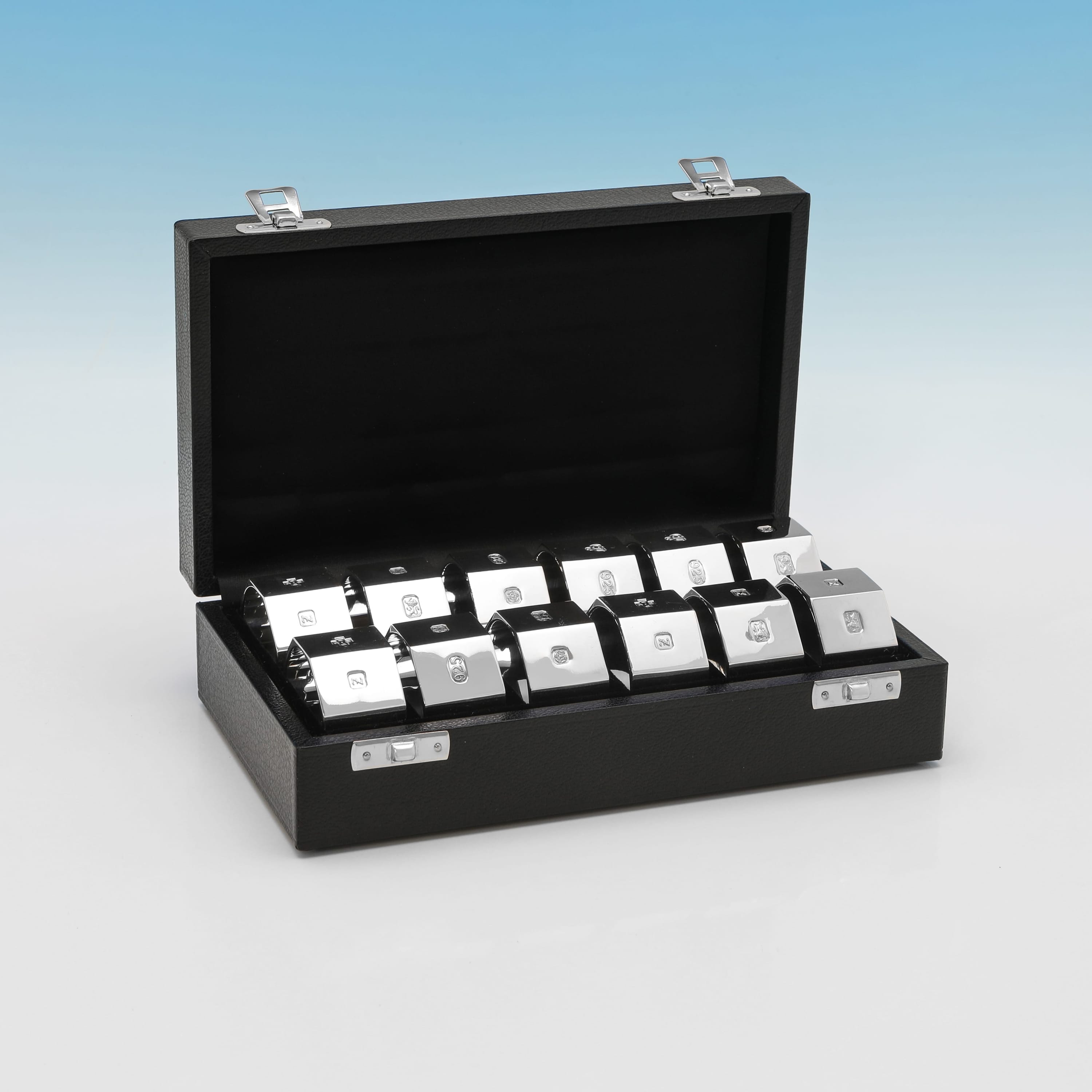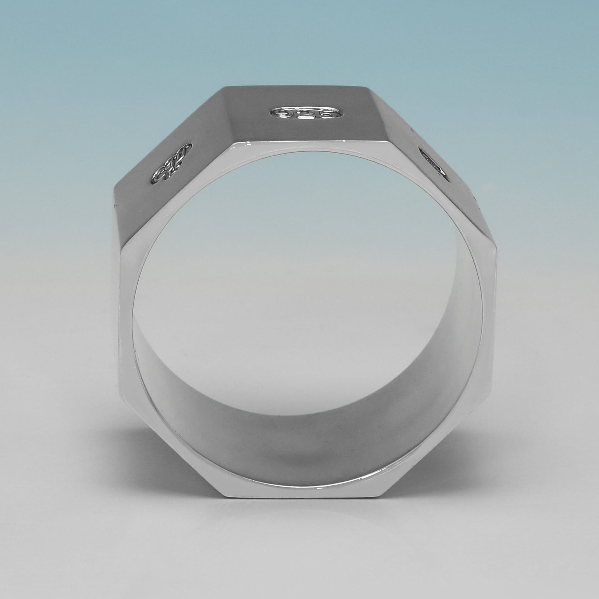 L8998: Hallmarked in Sheffield in 1999 by C. J. Vander, this very handsome Elizabeth II period, sterling silver set of twelve napkin rings is of octagonal form, featuring a sleek, modernist design. The set weighs an impressive feeling 29.41 troy ounces.