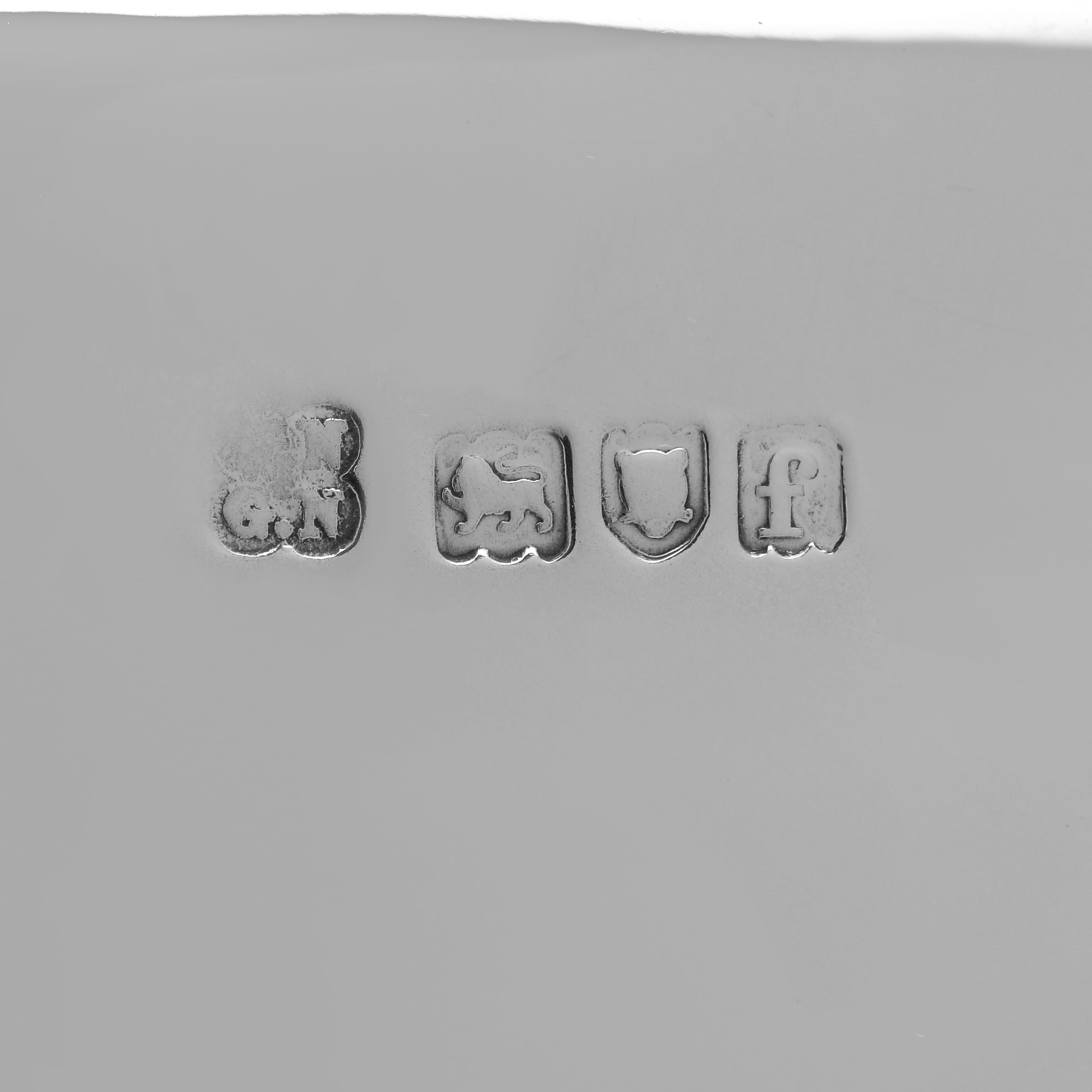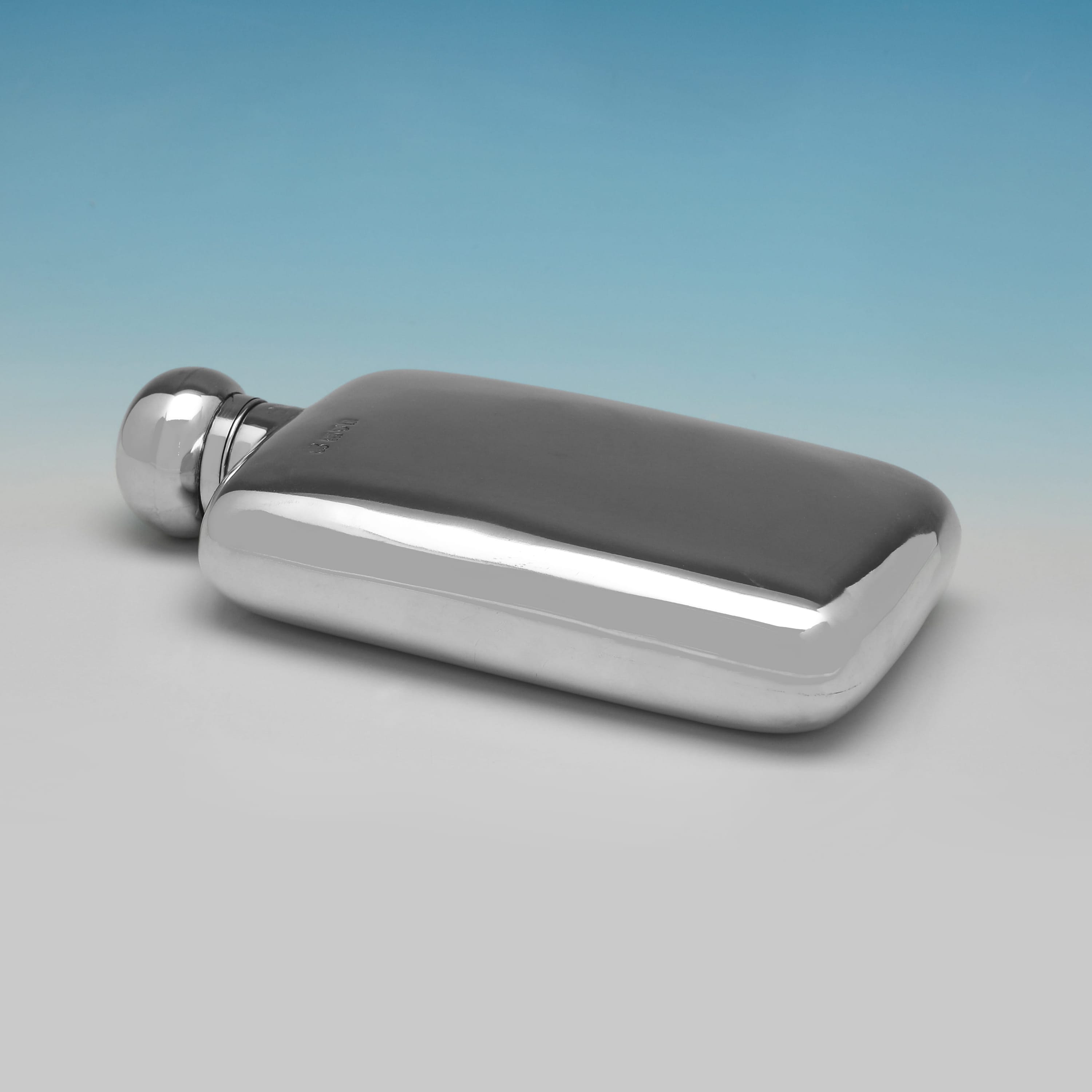 L9032: Hallmarked in London in 1901 by William & George Neal this timeless Edwardian antique sterling silver hip flask is of a plain, rectangular form with gently rounded corners, and features a hinged, bayonet-fit domed cap. It measures 5.75"(14.5cm) tall by 3.25"(8cm) wide and 1.25"(3cm) deep, and weighs 4.95 troy ounces.