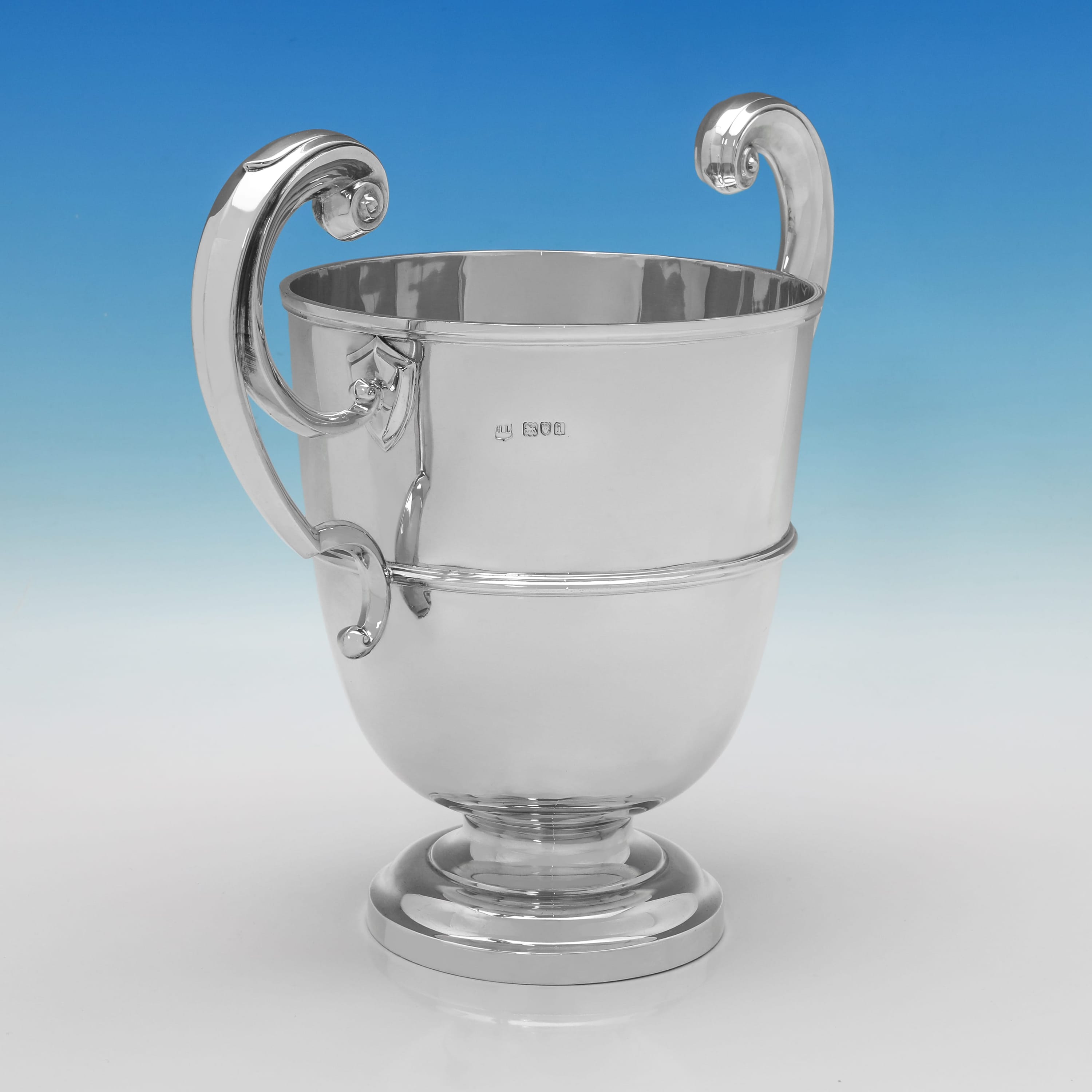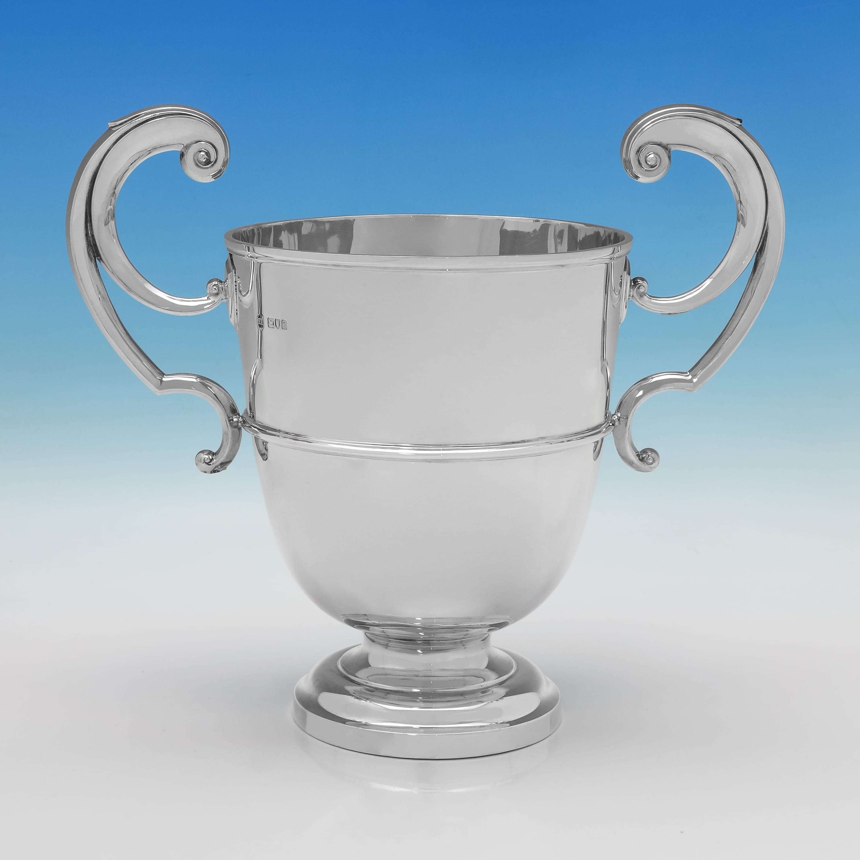 L9069: Hallmarked in London in 1904 by Lambert & Co. this elegant Edwardian antique sterling silver two-handled cup is of a classic urn form, standing on a pedestal foot. The cup has a plain, tapering body and is fitted with a pair of substantial scroll handles. It measures 11.75"(30cm) tall by 13.25"(34cm) wide and 7.5"(19cm) deep, and weighs 46.2 troy ounces.