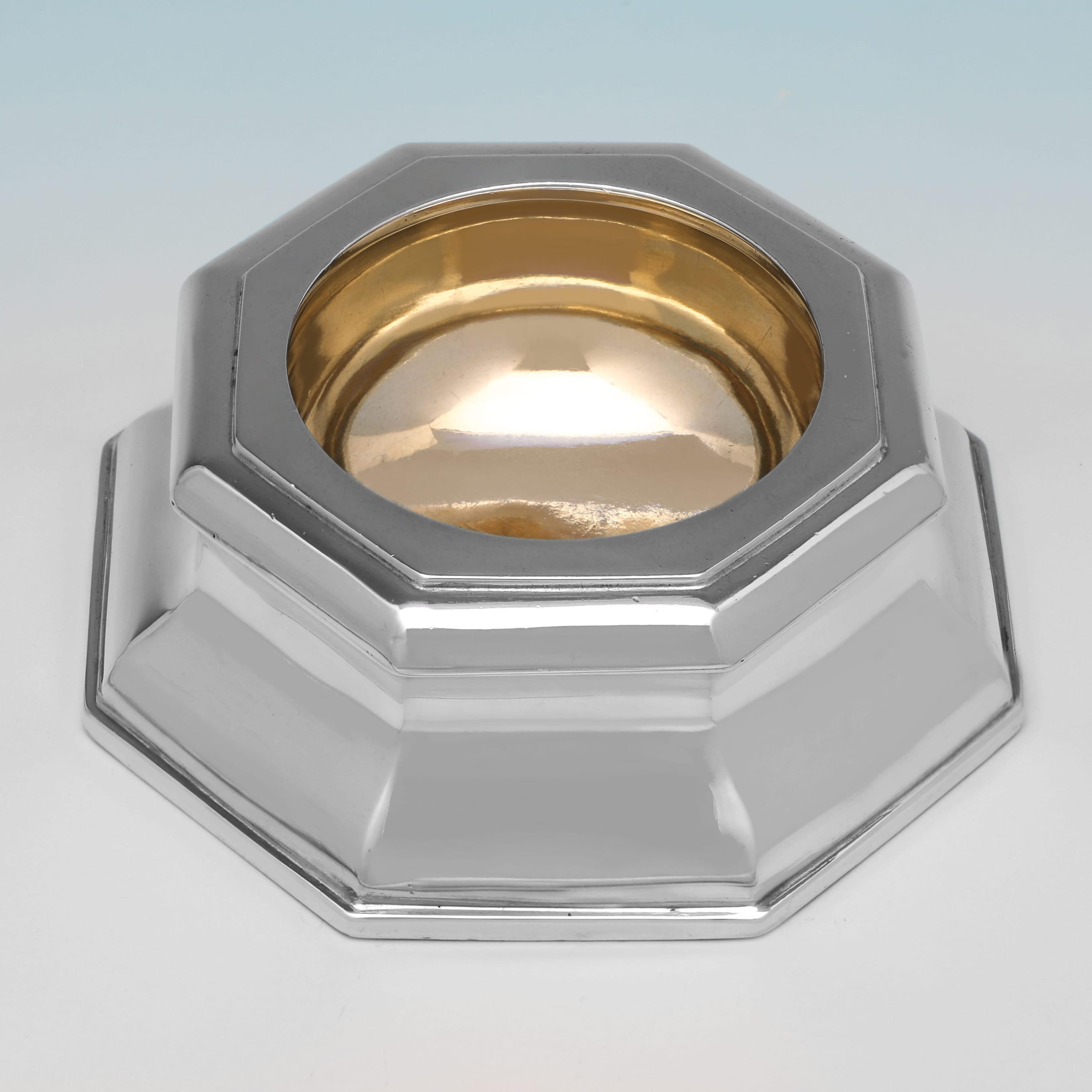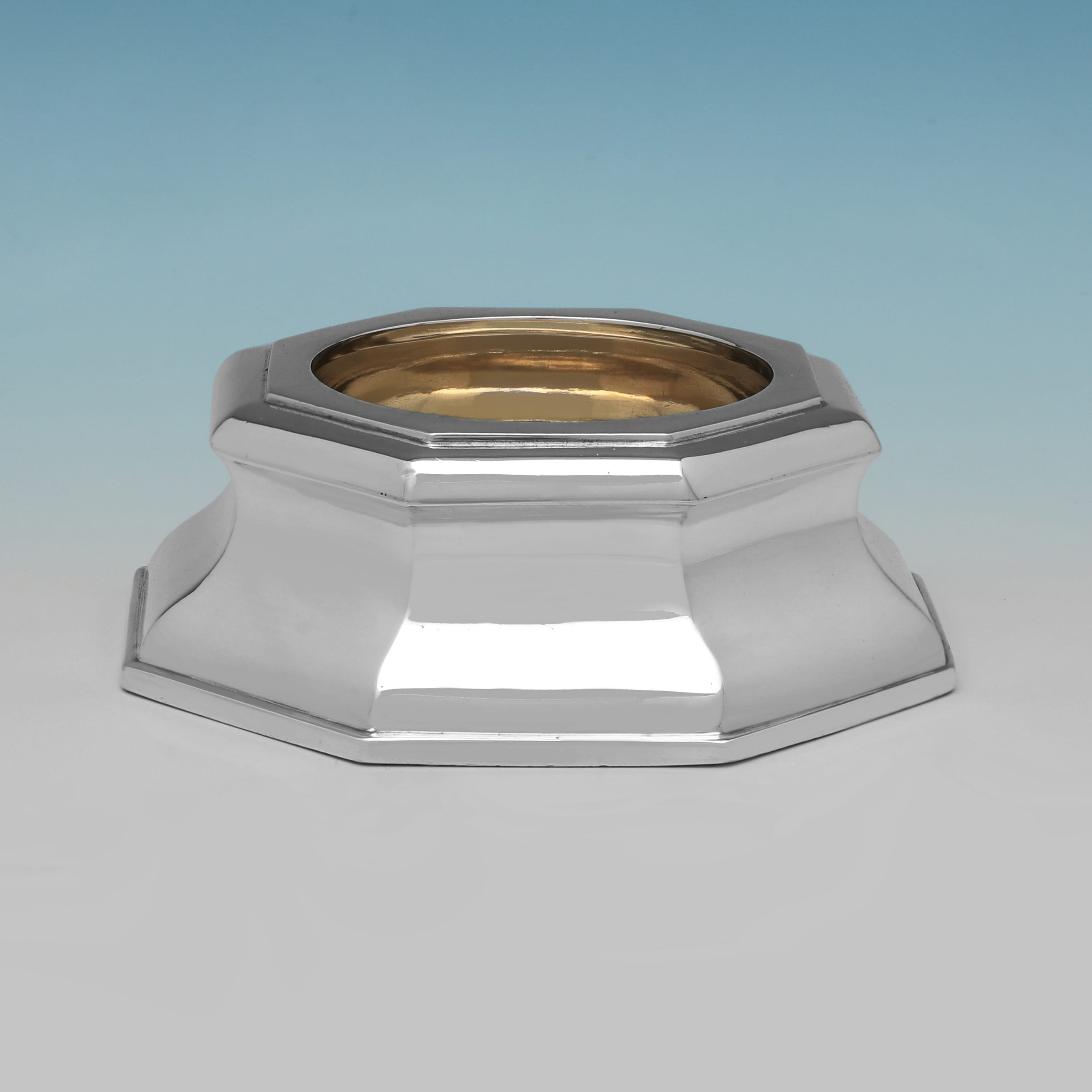 L9076: Hallmarked in London in 1891 by Aldwinckle & Slater this handsome Victorian sterling silver pair of salt cellars is of an octagonal waisted form with a polished surface and a gilded interior. Each salt cellar measures 1.5"(4cm) tall, with a base diameter of 4.25"(11cm), and together they weigh 13.24 troy ounces.