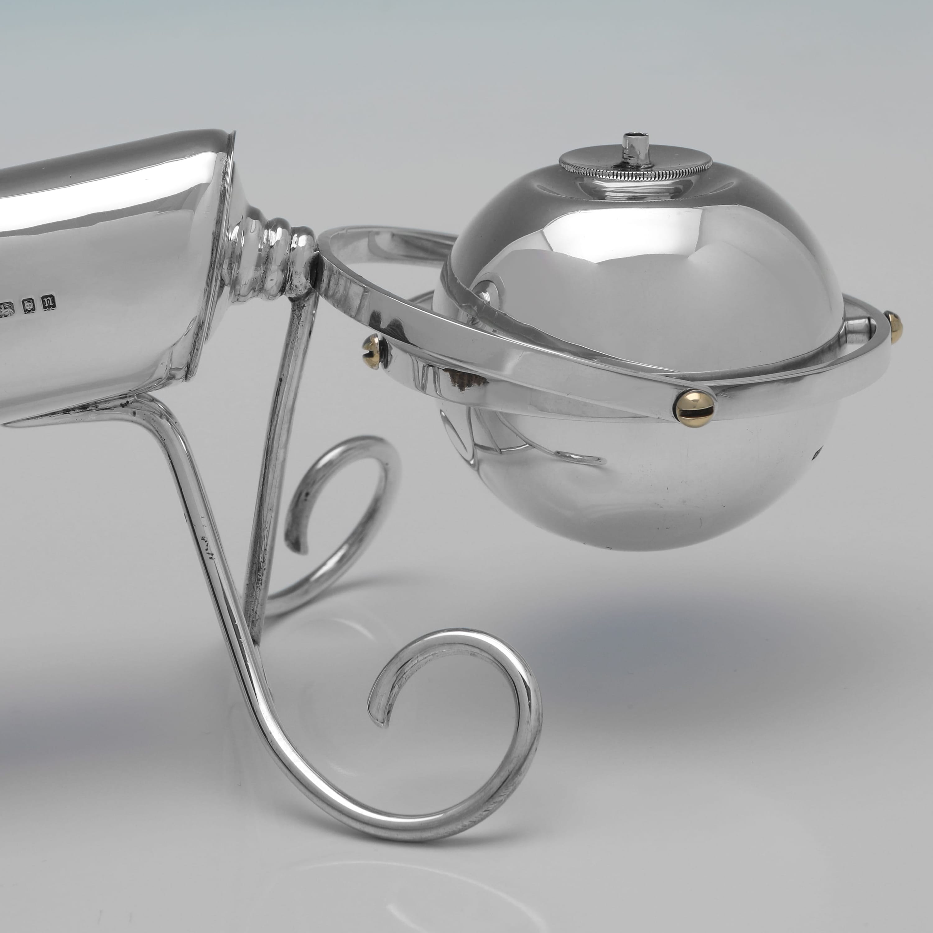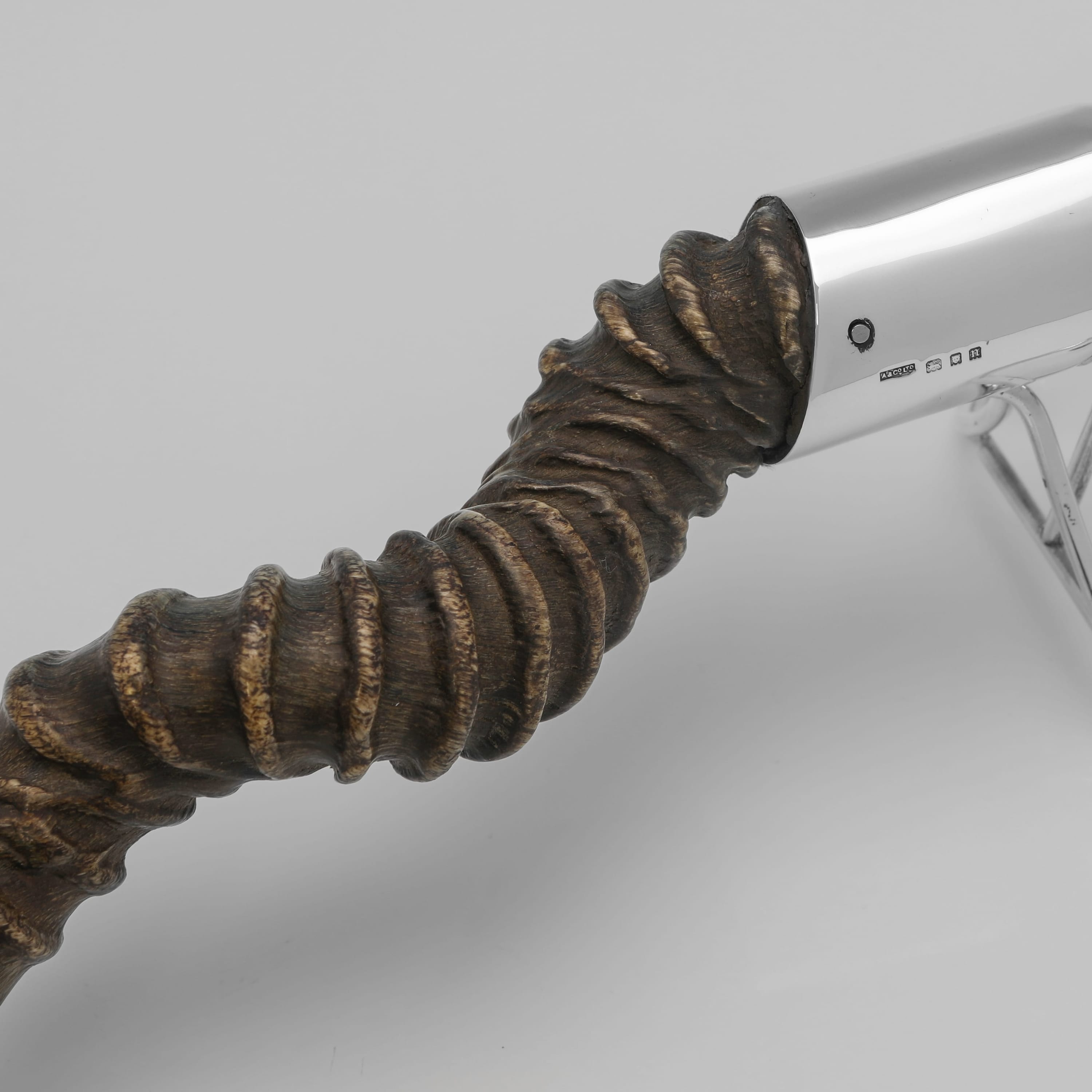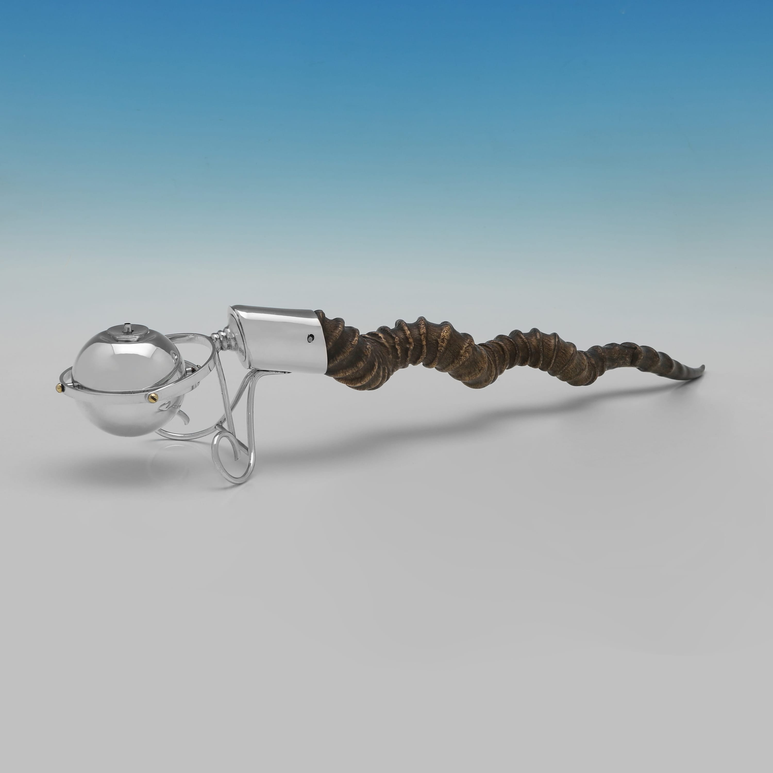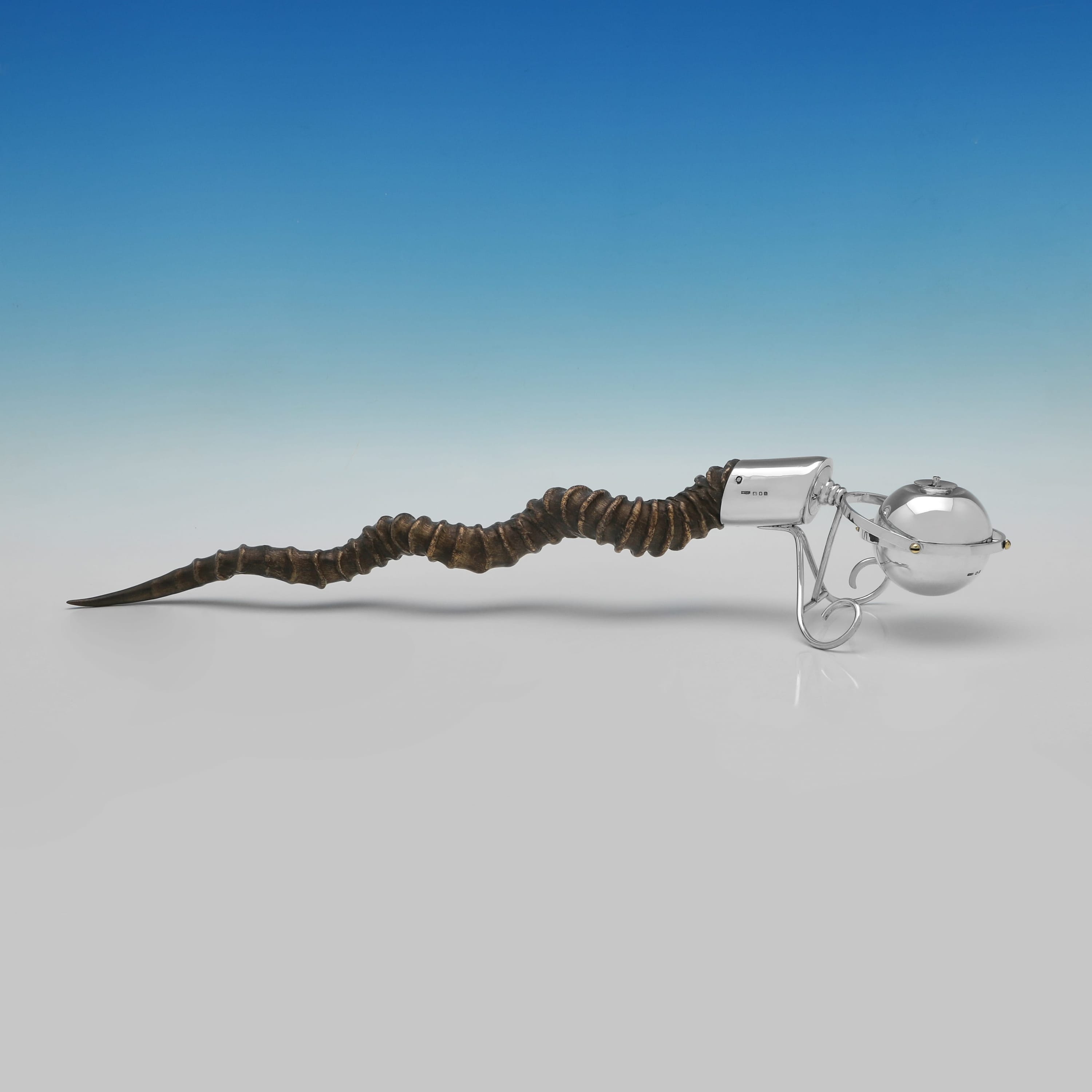 L9083: Hallmarked in London in 1928 by Asprey & Co. Ltd. this unusual George V sterling silver gimbal cigar lighter is cleverly designed, allowing the spherical lighter to remain upright regardless of motion. The polished silver mounting leads to a long, impala horn handle. It measures 3.5"(9cm) tall by 20.5"(52cm) wide and 4"(10.5cm) deep.