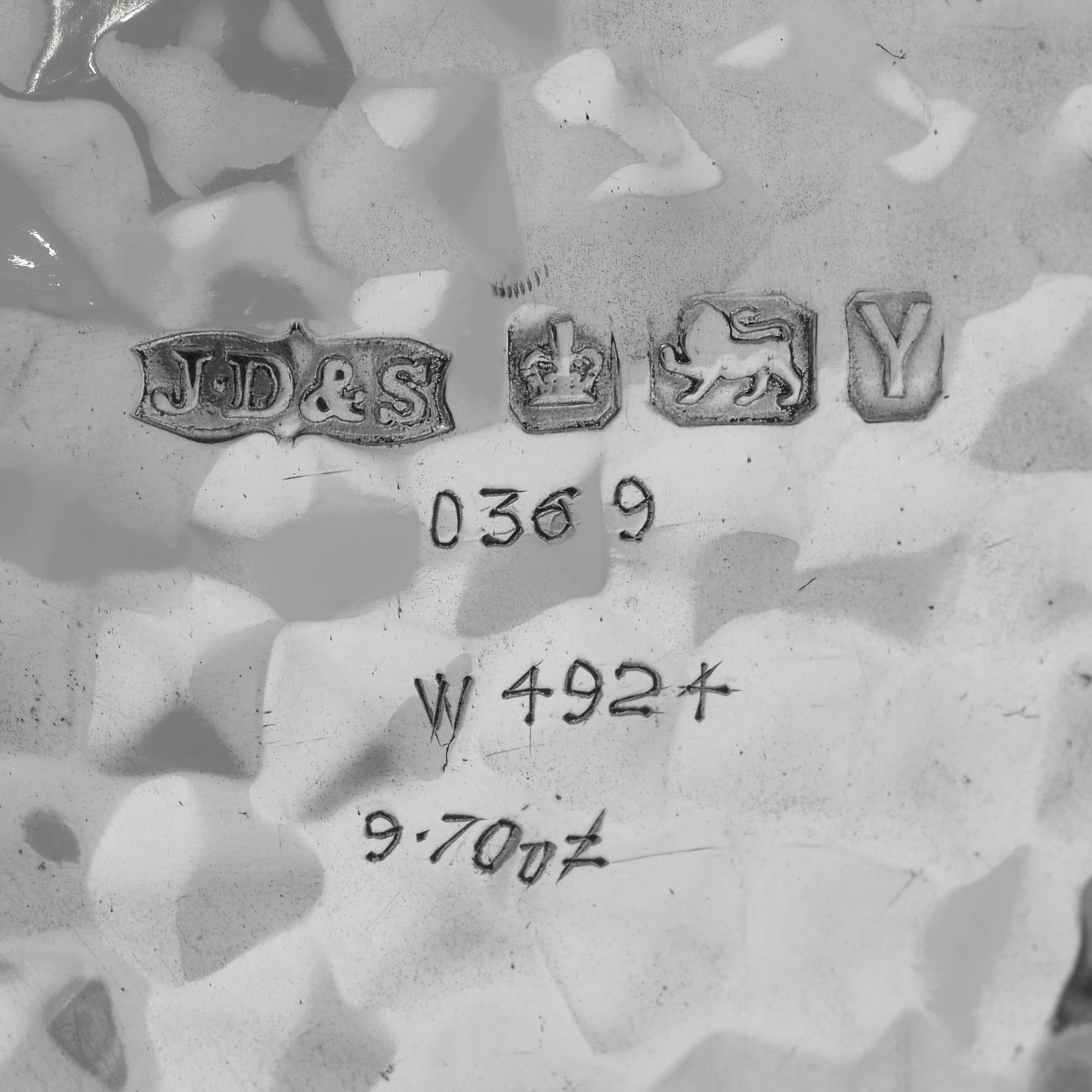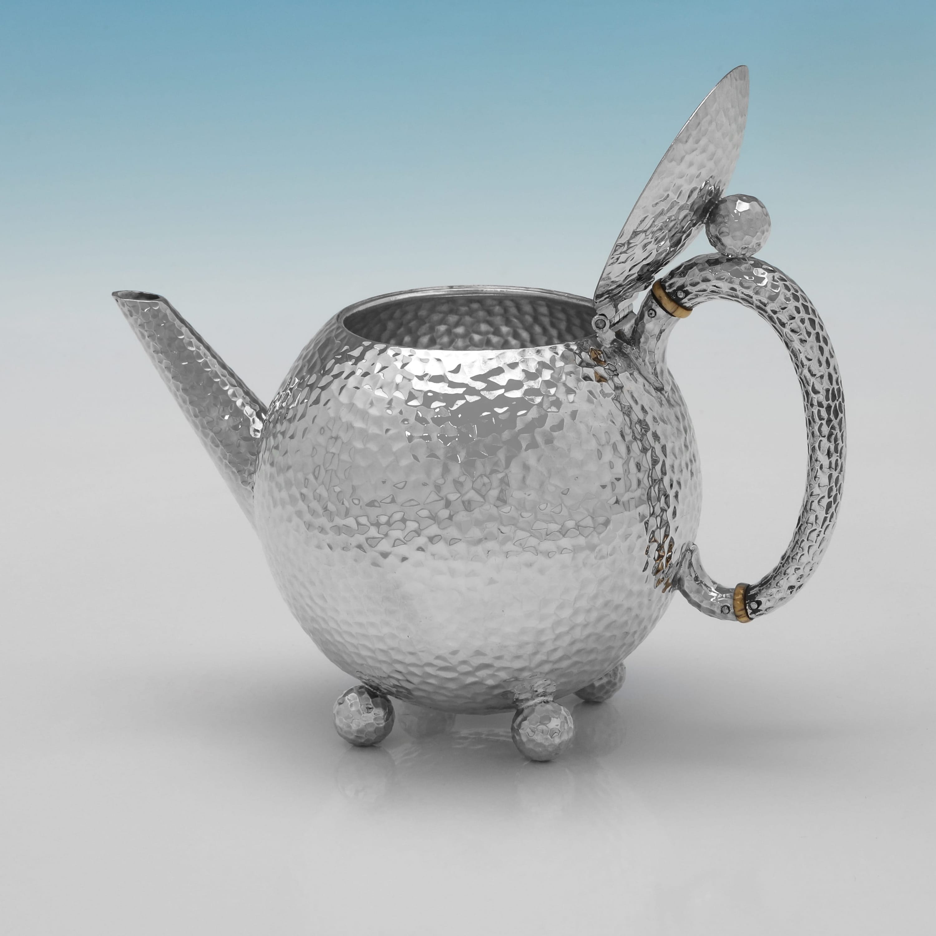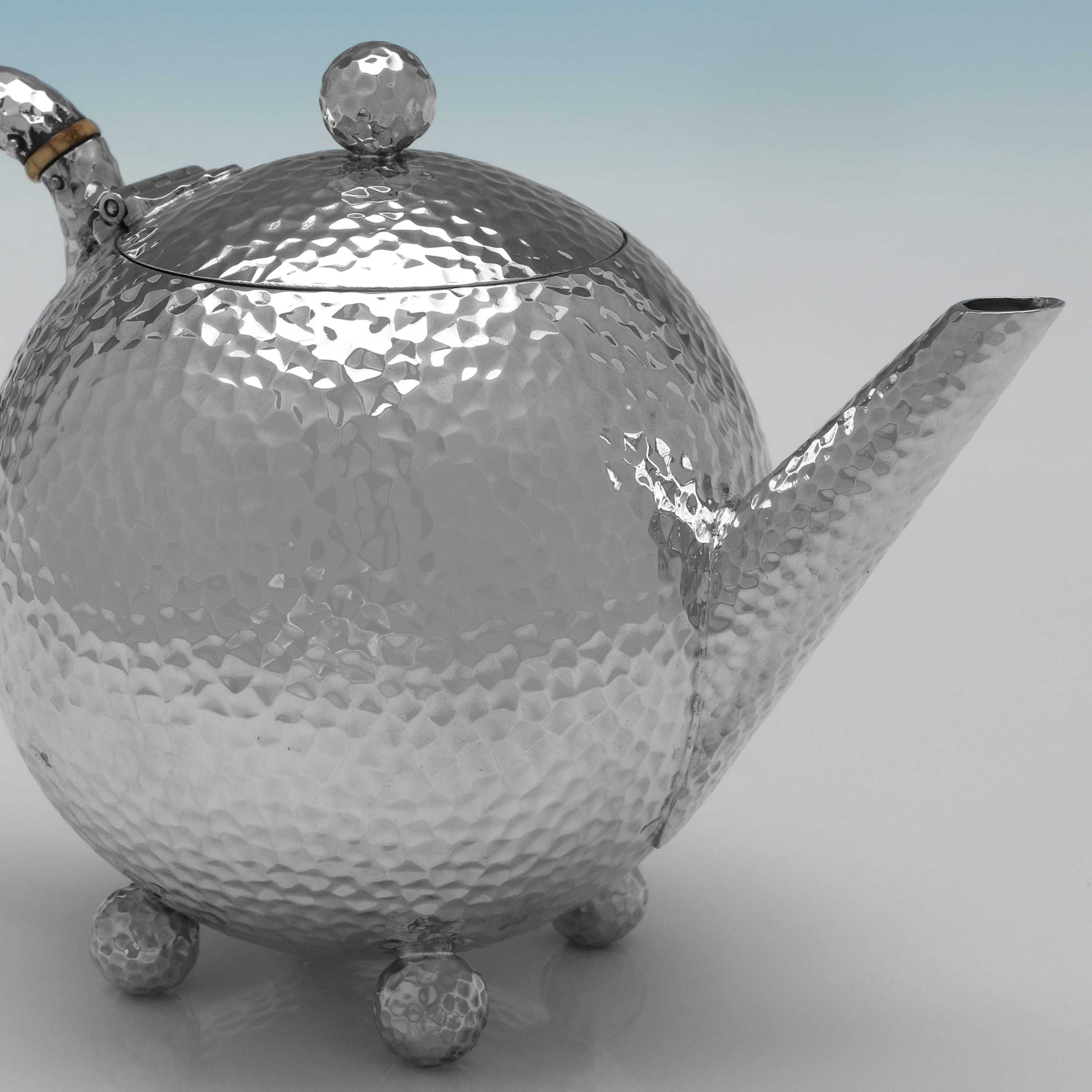 L9105: Hallmarked in Sheffield in 1891 by James Dixon & Sons this distinctive Victorian antique sterling silver teapot is of a spherical form executed in the Arts and Crafts style. The entire surface is heavily hand-hammered, or planished, and it stands on four ball feet with a matching ball finial to the hinged lid. It measures 5.25"(13cm) tall by 7"(18cm) from handle to spout and 4"(10.5cm) deep, and weighs 9.76 troy ounces.