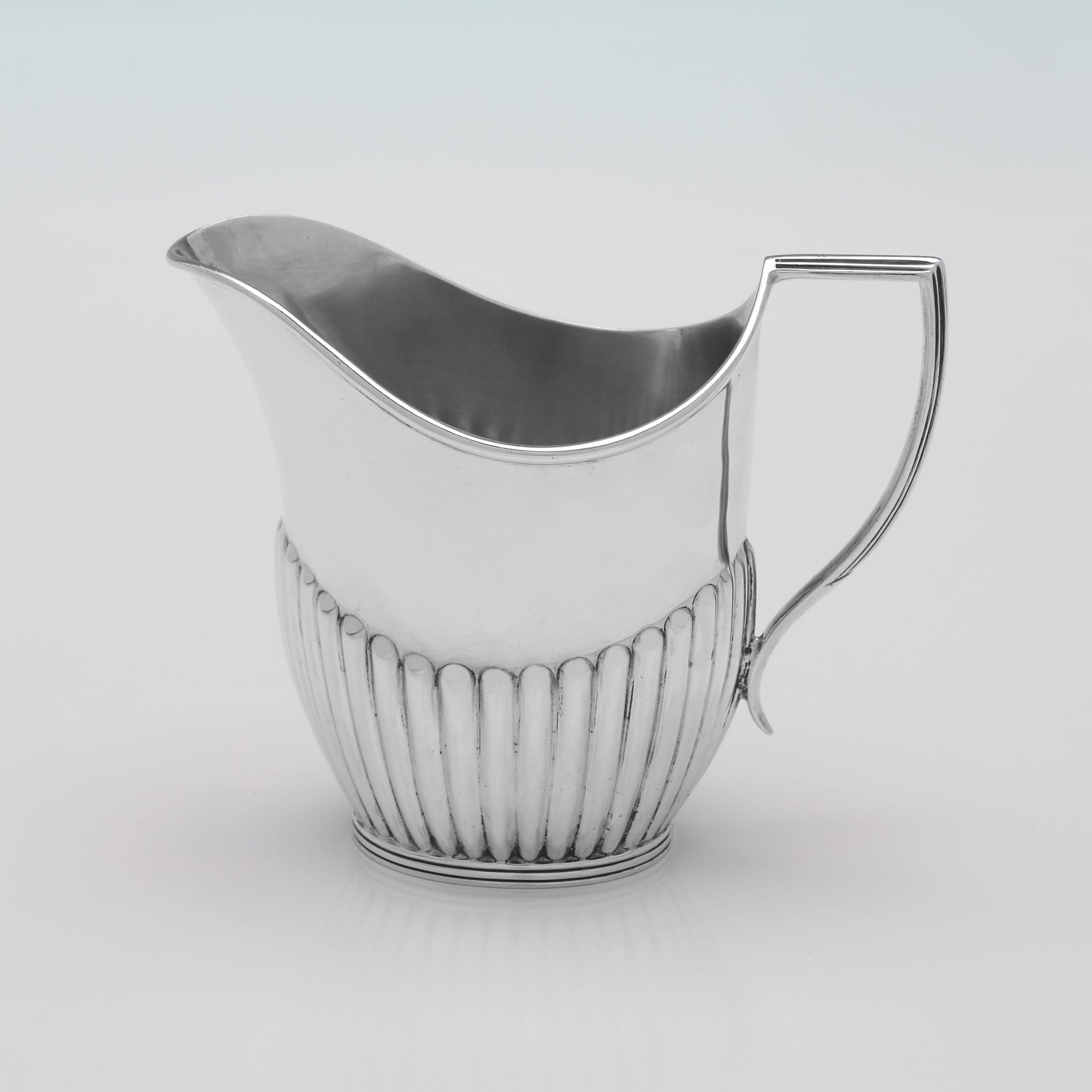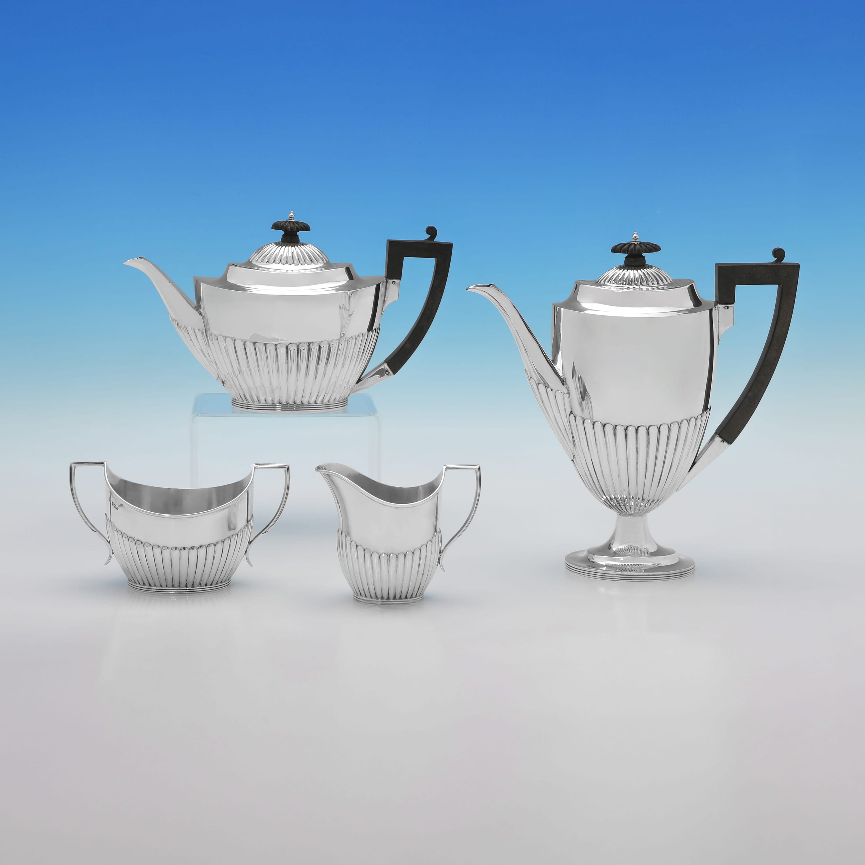 L9106: Hallmarked in Sheffield in 1911 - 1912 by Mappin And Webb this elegant George V antique sterling silver four-piece tea set is of a classic Queen Anne design. The pieces are of an ovoid form with half fluting to the lower body, and stand on a pedestal foot. The teapot and coffee pot are fitted with wooden handles and finials to the lid. The set has a combined weight of 45 Troy Ounces.