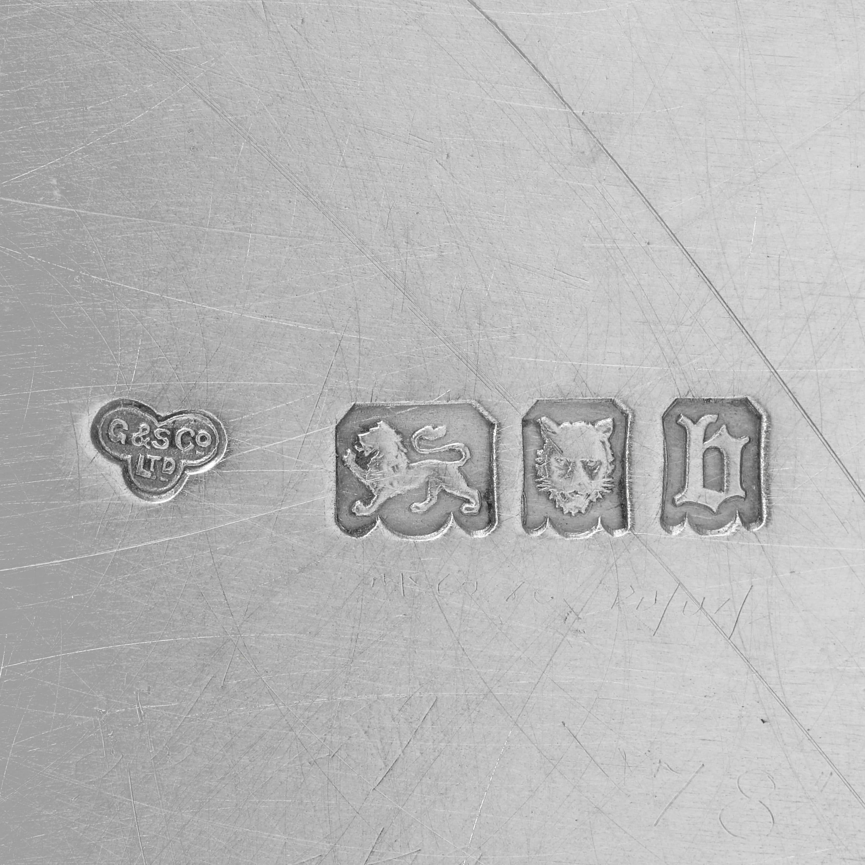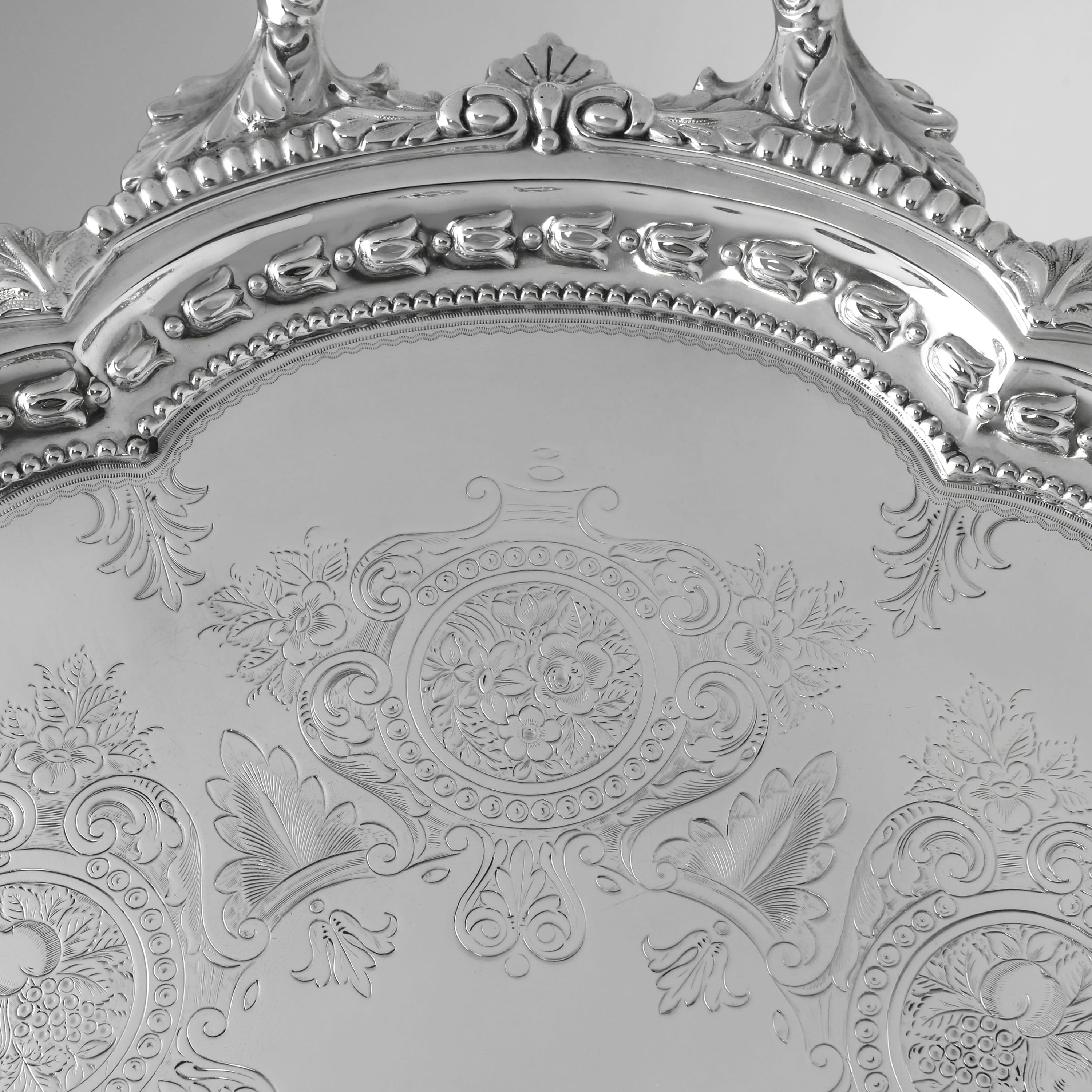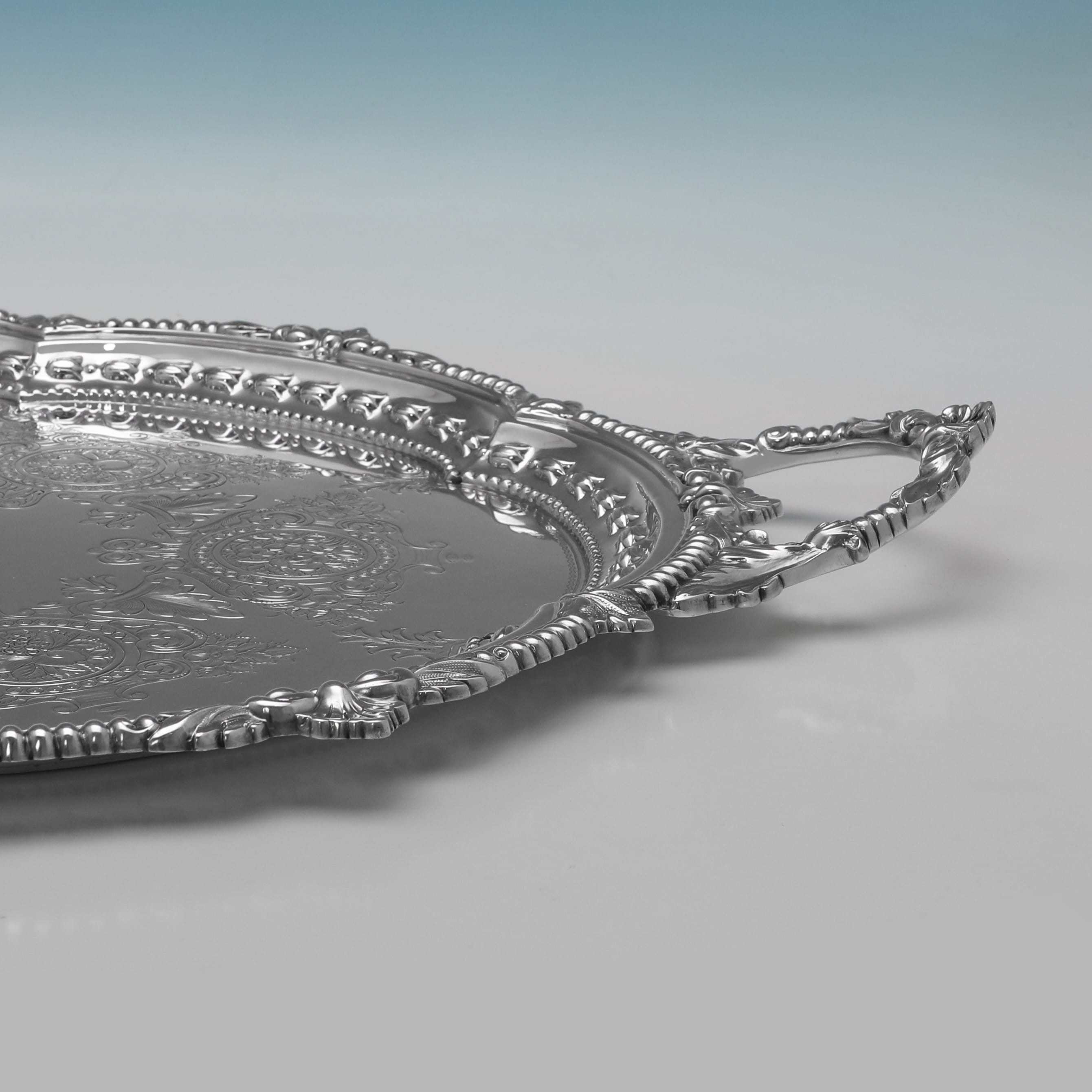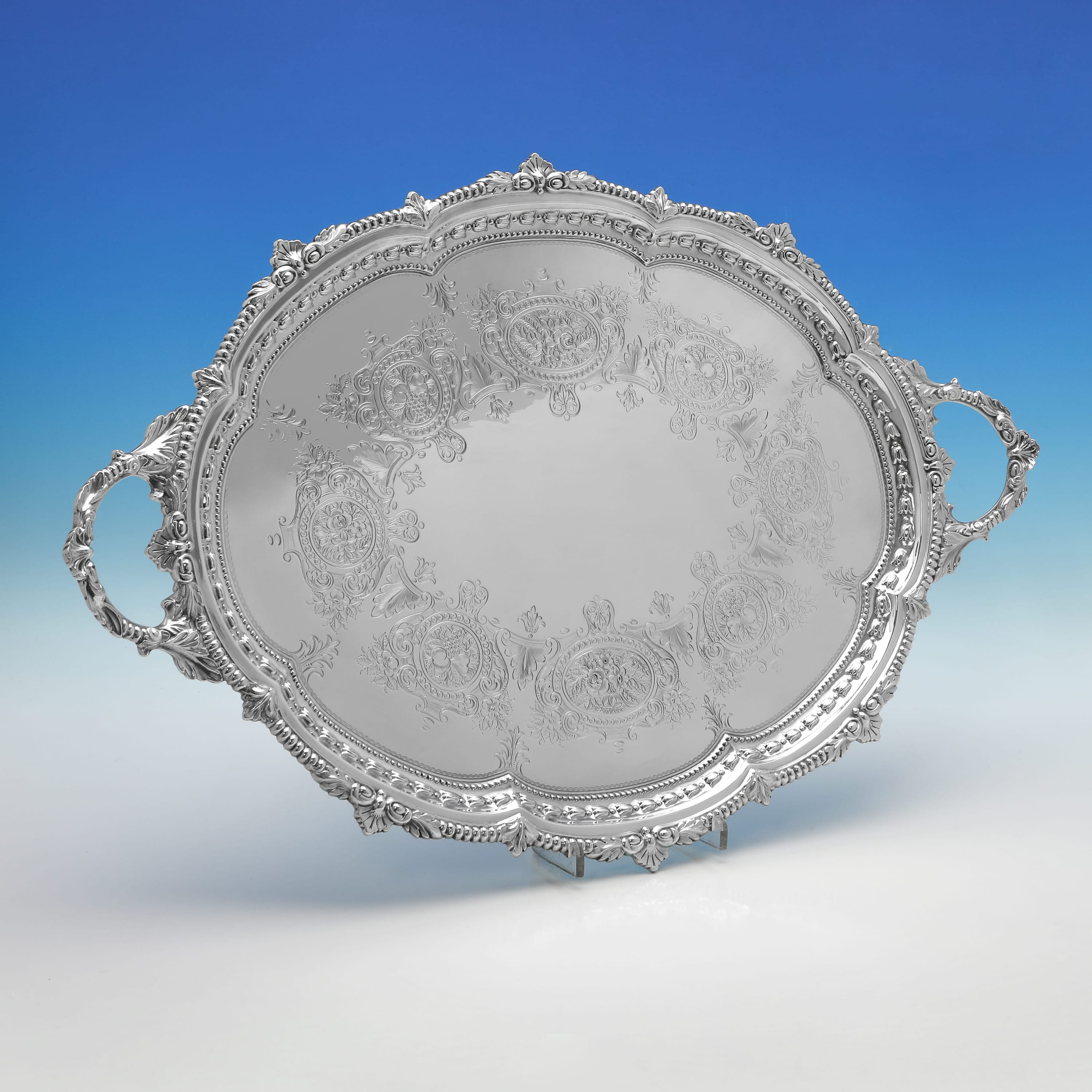 L9146: Hallmarked in London in 1917 by Goldsmiths & Silversmiths Co., and retailed by Asprey, this impressive George V antique sterling silver serving tray is of a shaped oval form, featuring a highly detailed cast Rococo Revival border and a pair of elaborate cast handles. The centre of the tray is finely engraved with foliate scrolls and flowerheads. It measures 1.5"(4cm) tall by 25.25"(64cm) from handle to handle and 16.5"(42cm) deep, and weighs 76.5 troy ounces.