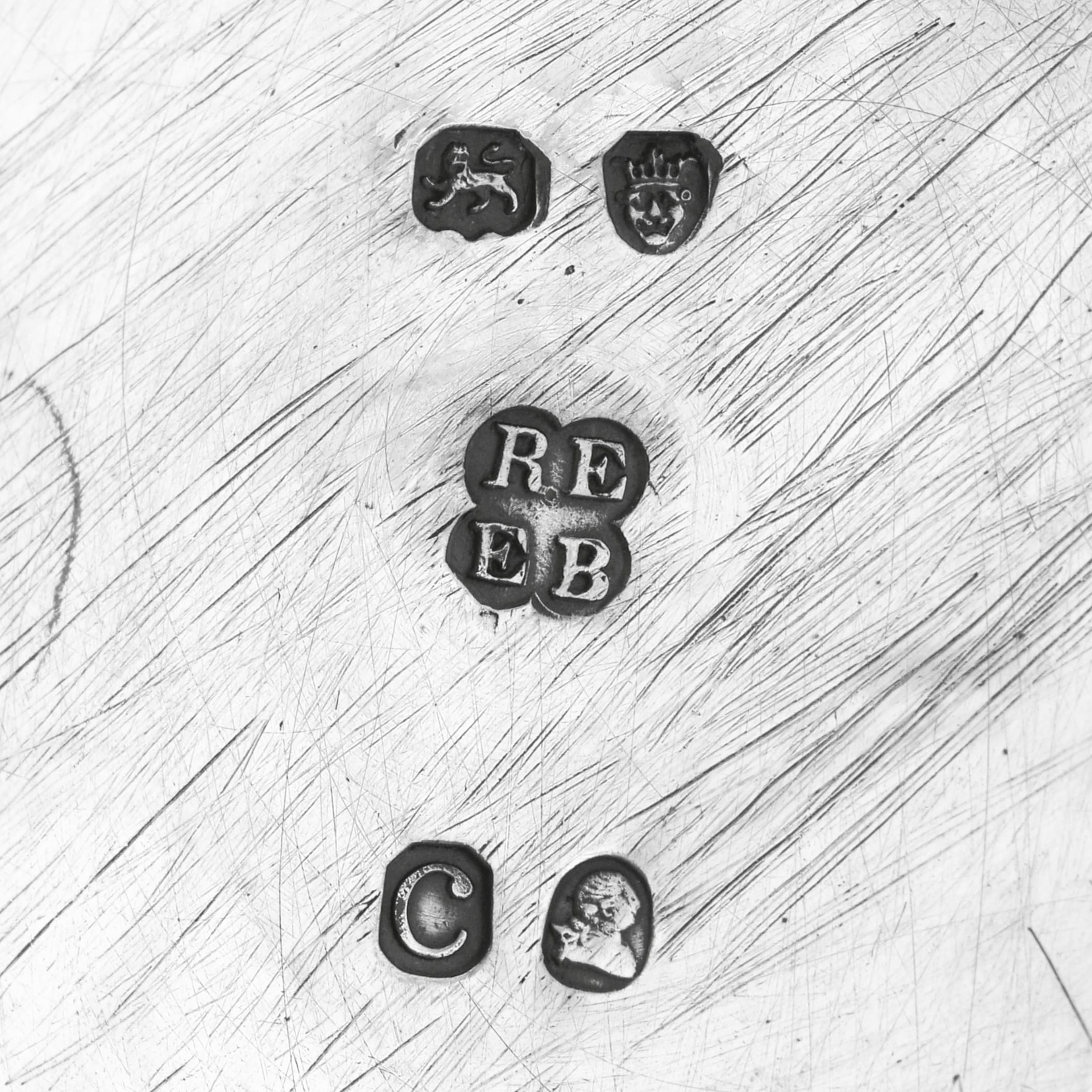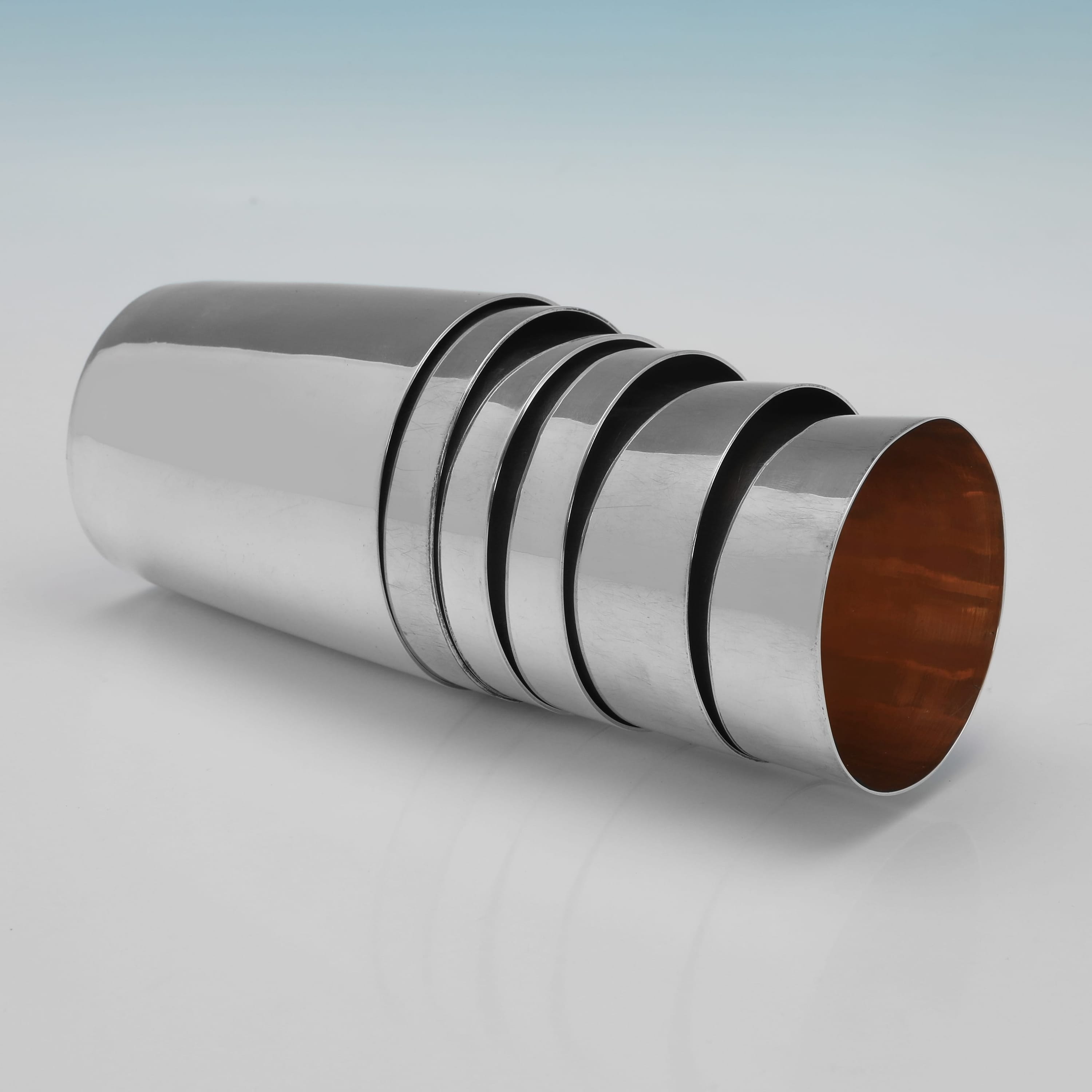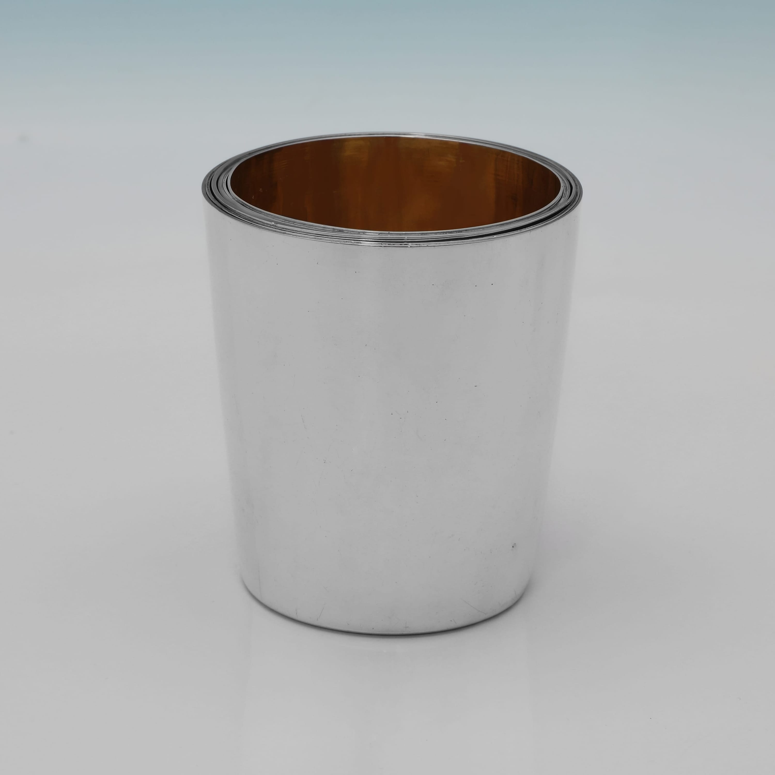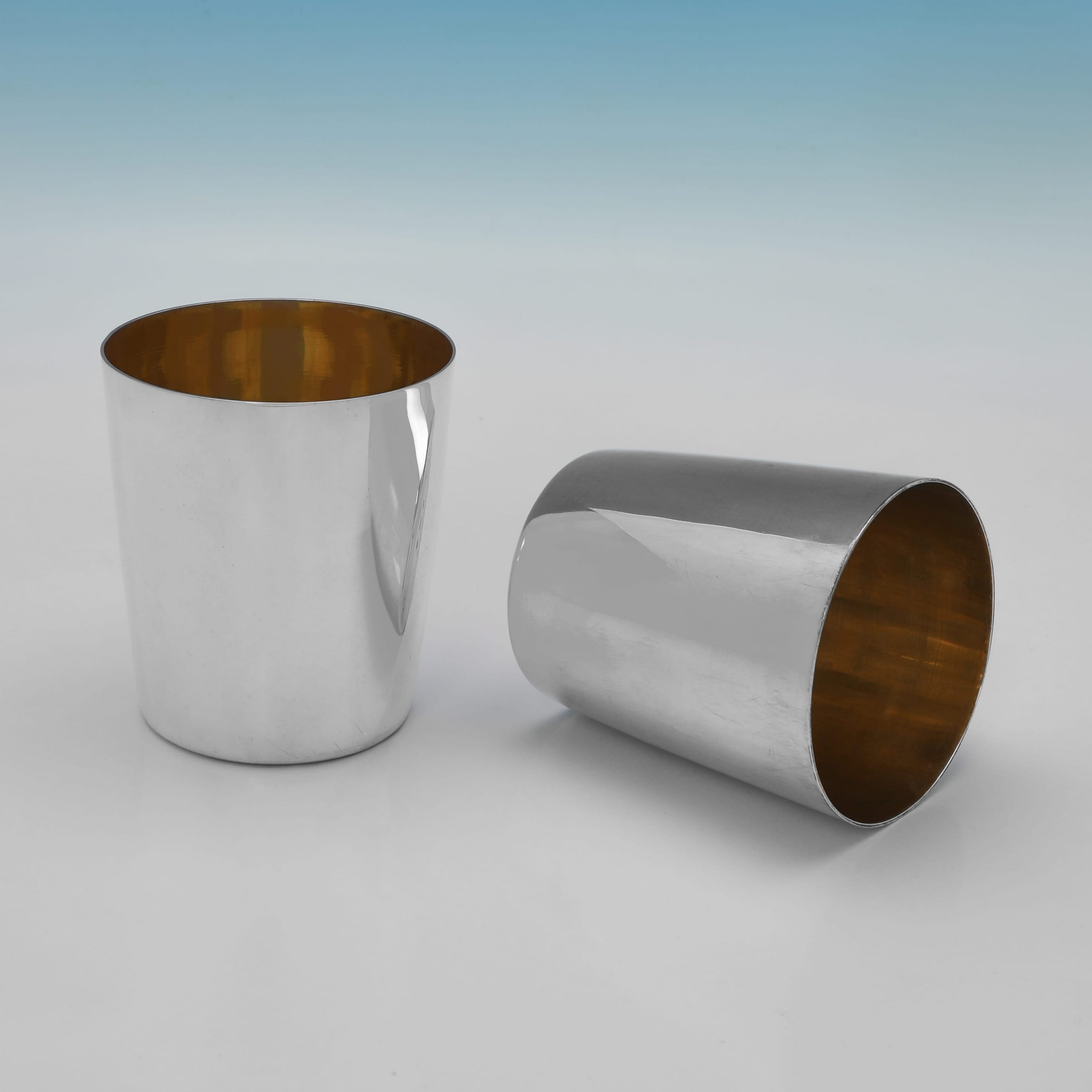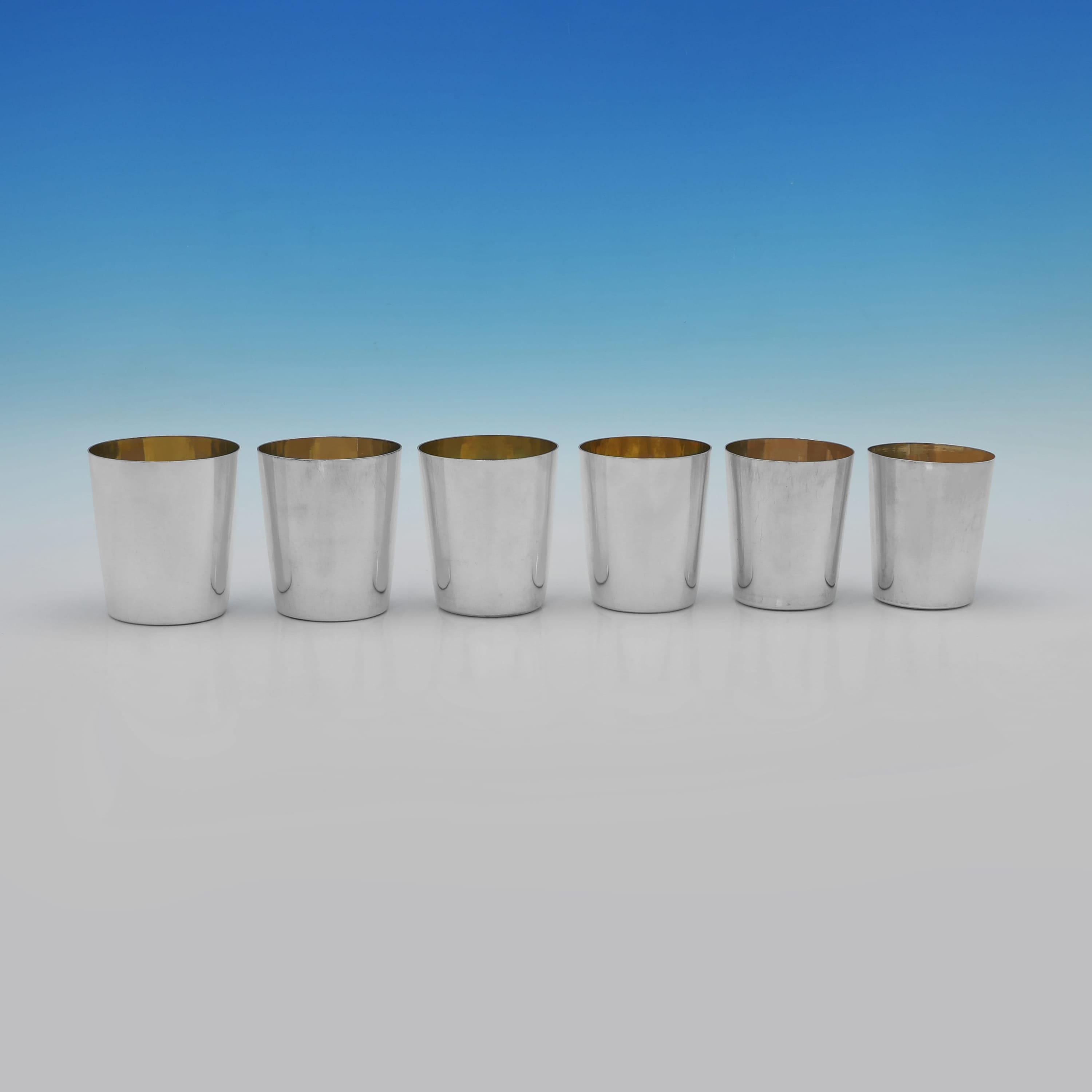 L9165: Hallmarked in London in 1798, 1815, and 1823 by Emes & Barnard this rare George III antique sterling silver set of six graduated beakers is of a plain, tapering cylindrical form designed for nesting. The beakers feature a gilt interior. When stacked together they measure 4"(10cm) tall by 3.5"(9cm) in diameter, and together they weigh 27.75 troy ounces.