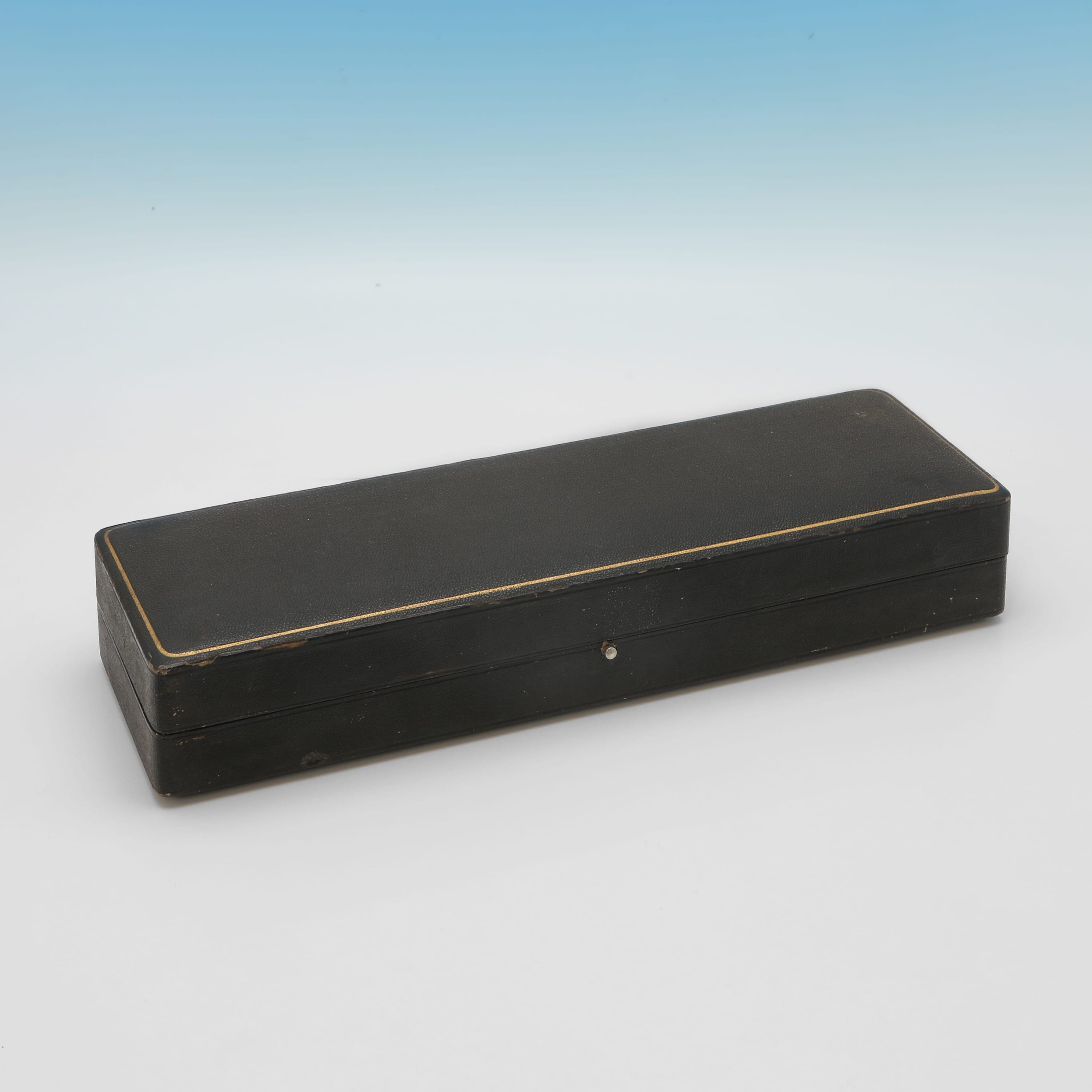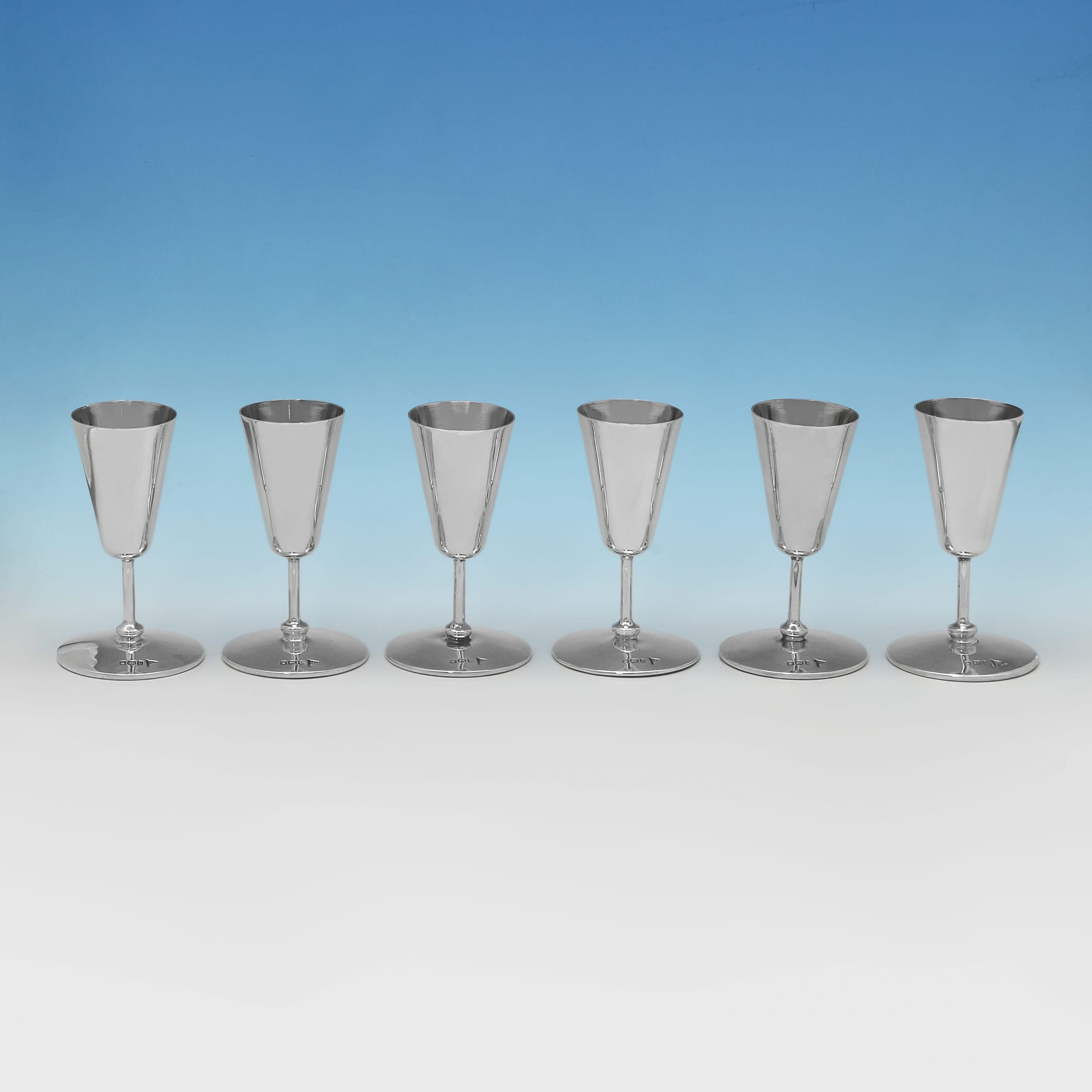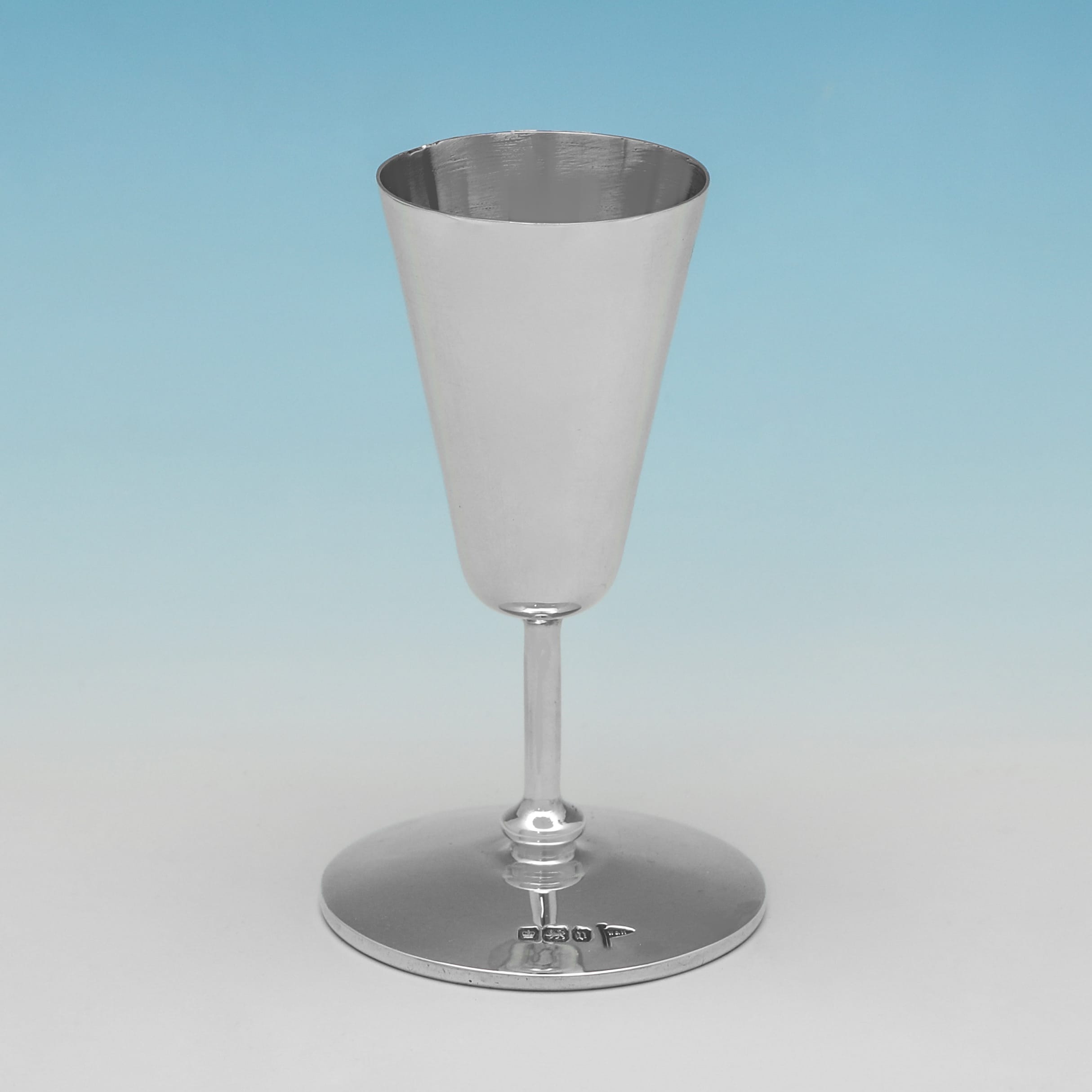L9175: Hallmarked in Sheffield in 1913 by Walker & Hall this elegant George V antique sterling silver cased set of 6 tot cups is of a simple, sleek design with a conical bowl on a slender stem and a circular foot. The cups are presented in their original fitted case, with the maker's name on the silk lining. Each cup measures 3"(7.5cm) tall, by 1.75"(4.5cm) in diameter at the base, and the set has a combined weight of 5.13 troy ounces.