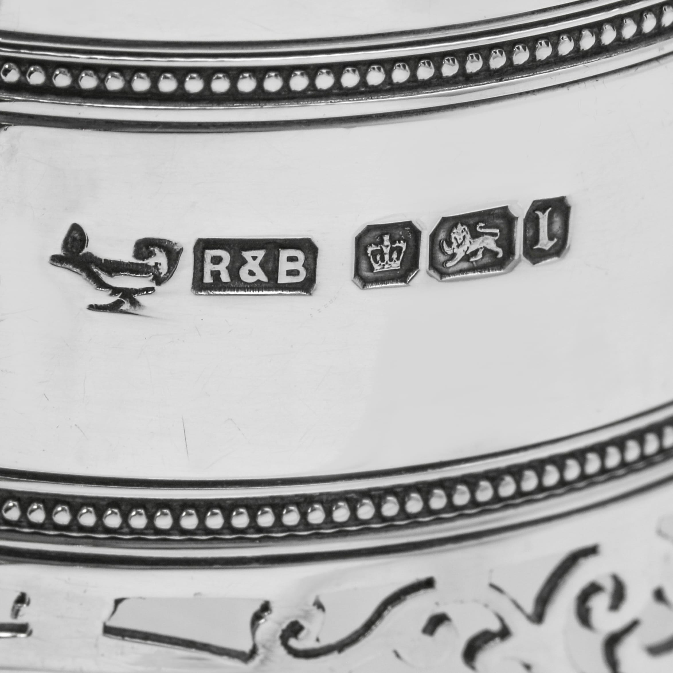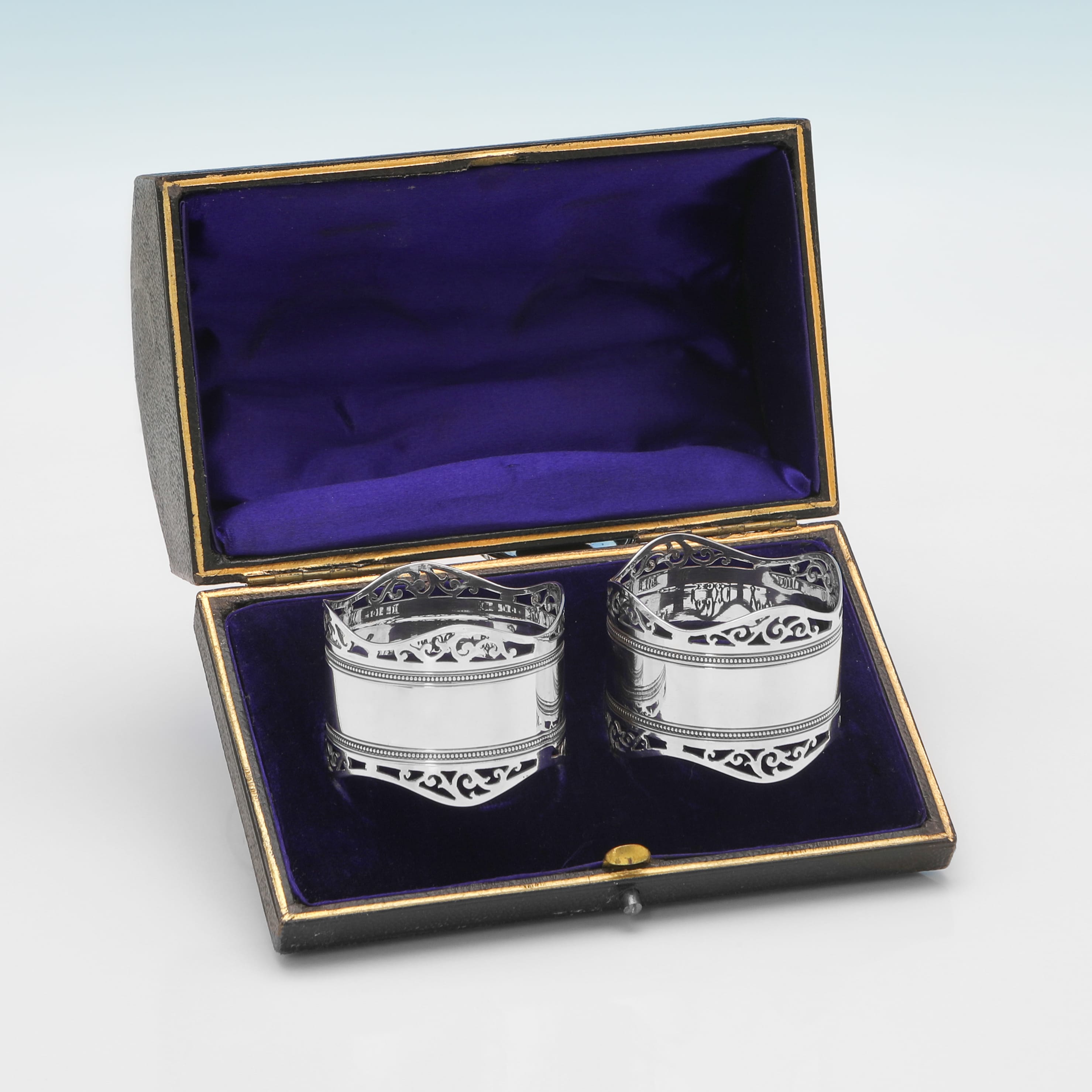 L9192a: Hallmarked in Sheffield in 1903 by Roberts & Belk this decorative Edwardian antique sterling silver pair of napkin rings, presented in a fitted case, is of a cylindrical form with a central polished band flanked by a reed and bead border and a pierced scrolling foliate design. Each napkin ring measures 1.25"(3.5cm) tall, by 1.75"(4.5cm) in diameter, and together they weigh 1.65 troy ounces.