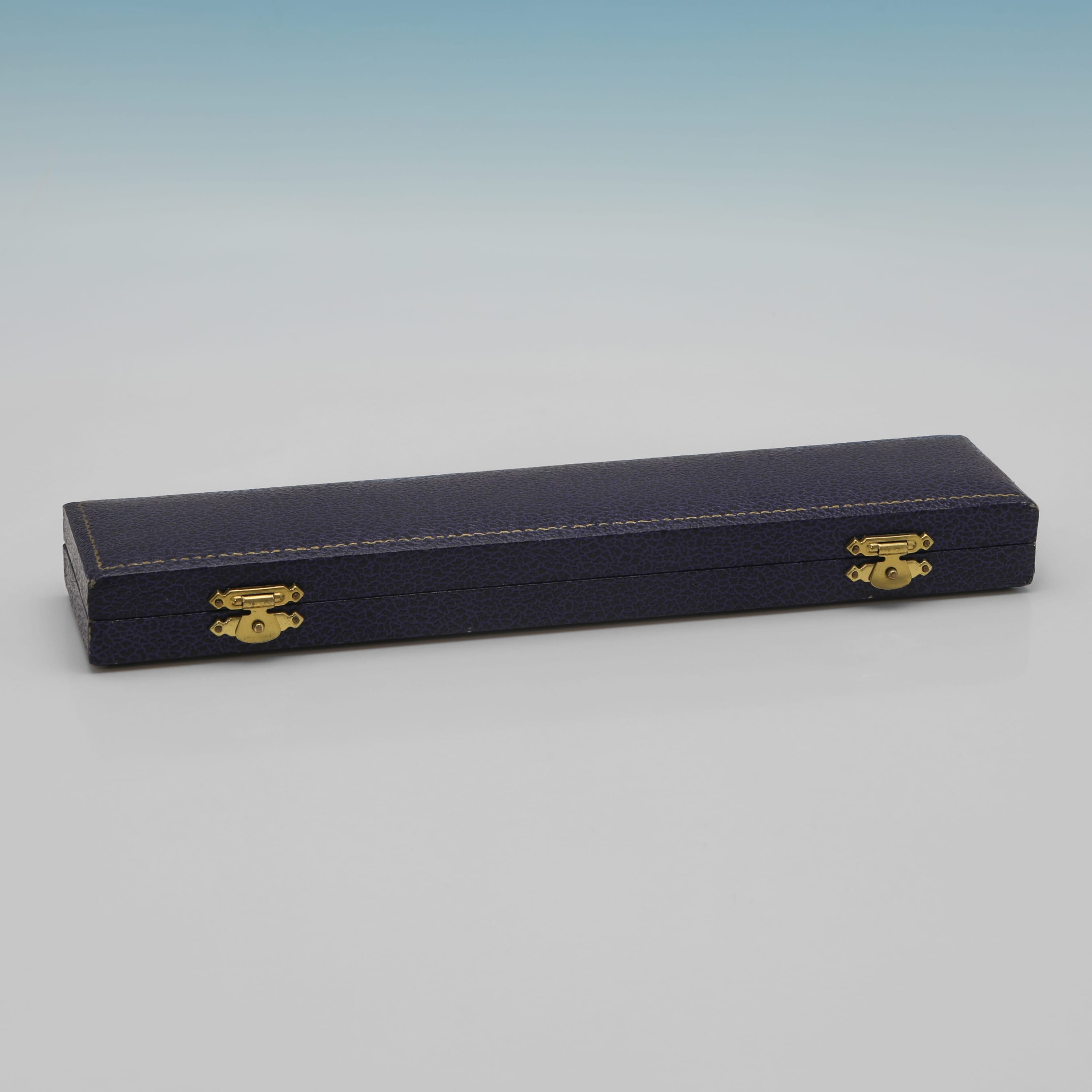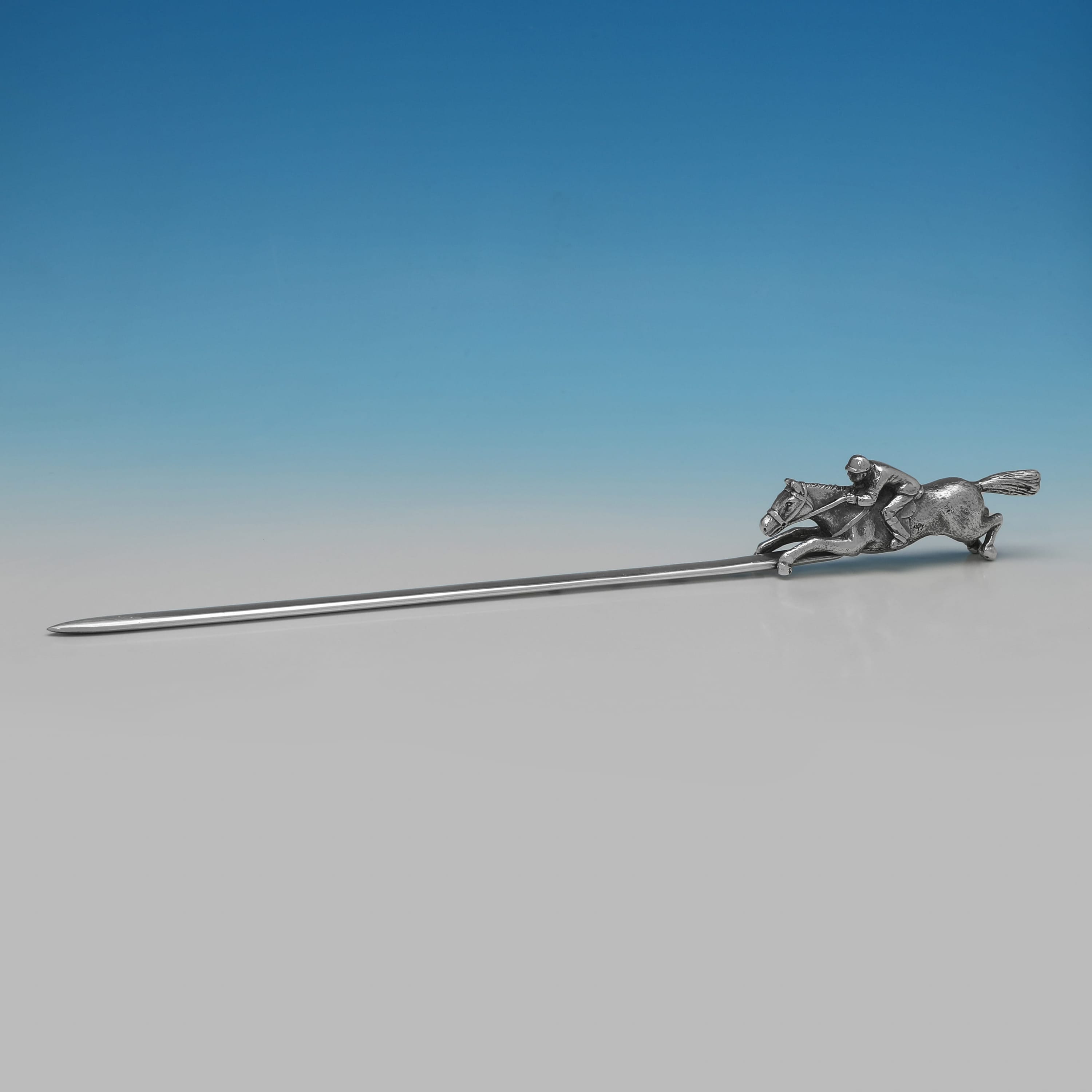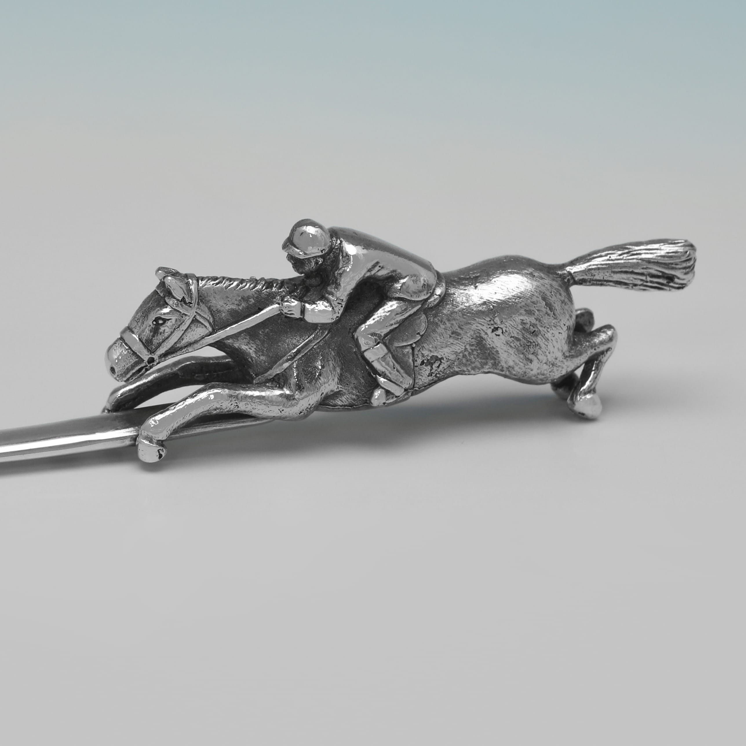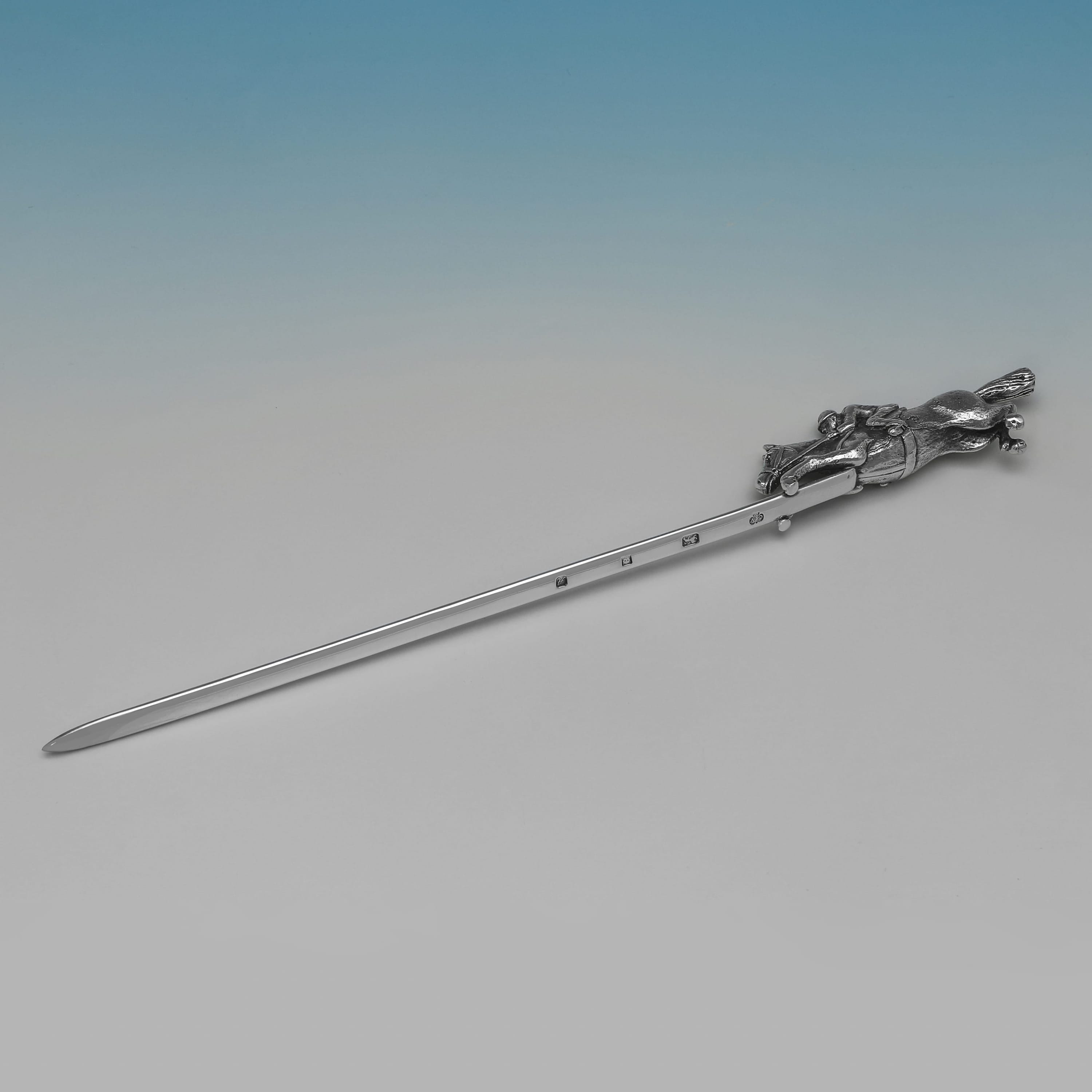 L9233: Hallmarked in London in 1975 by C. J. Vander, this Elizabeth II, sterling silver letter opener features a finely cast horse and jockey to the handle. The letter opener measures 1" (2.5cm) tall and 9" (23cm) long, and weighs 3.12 troy ounces.