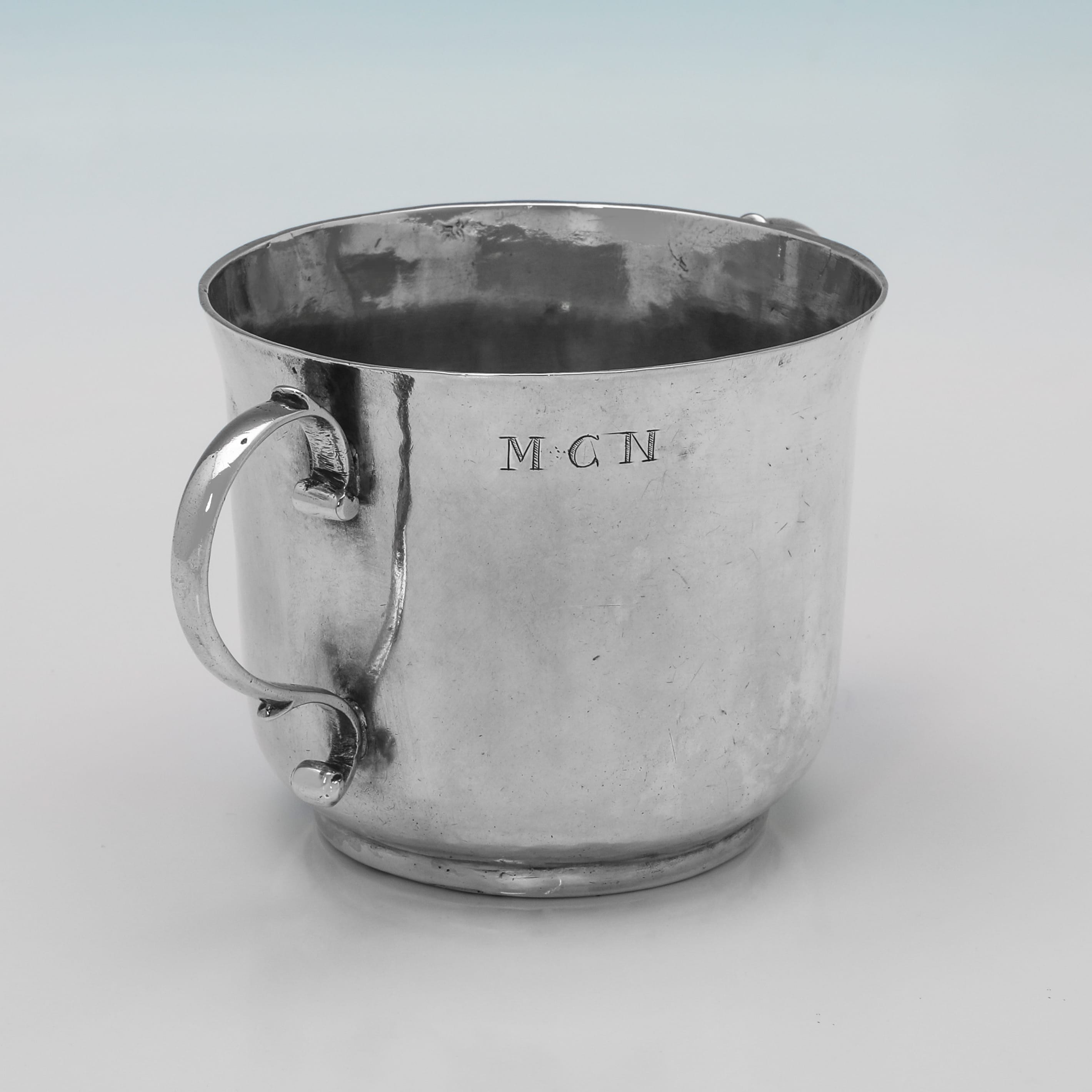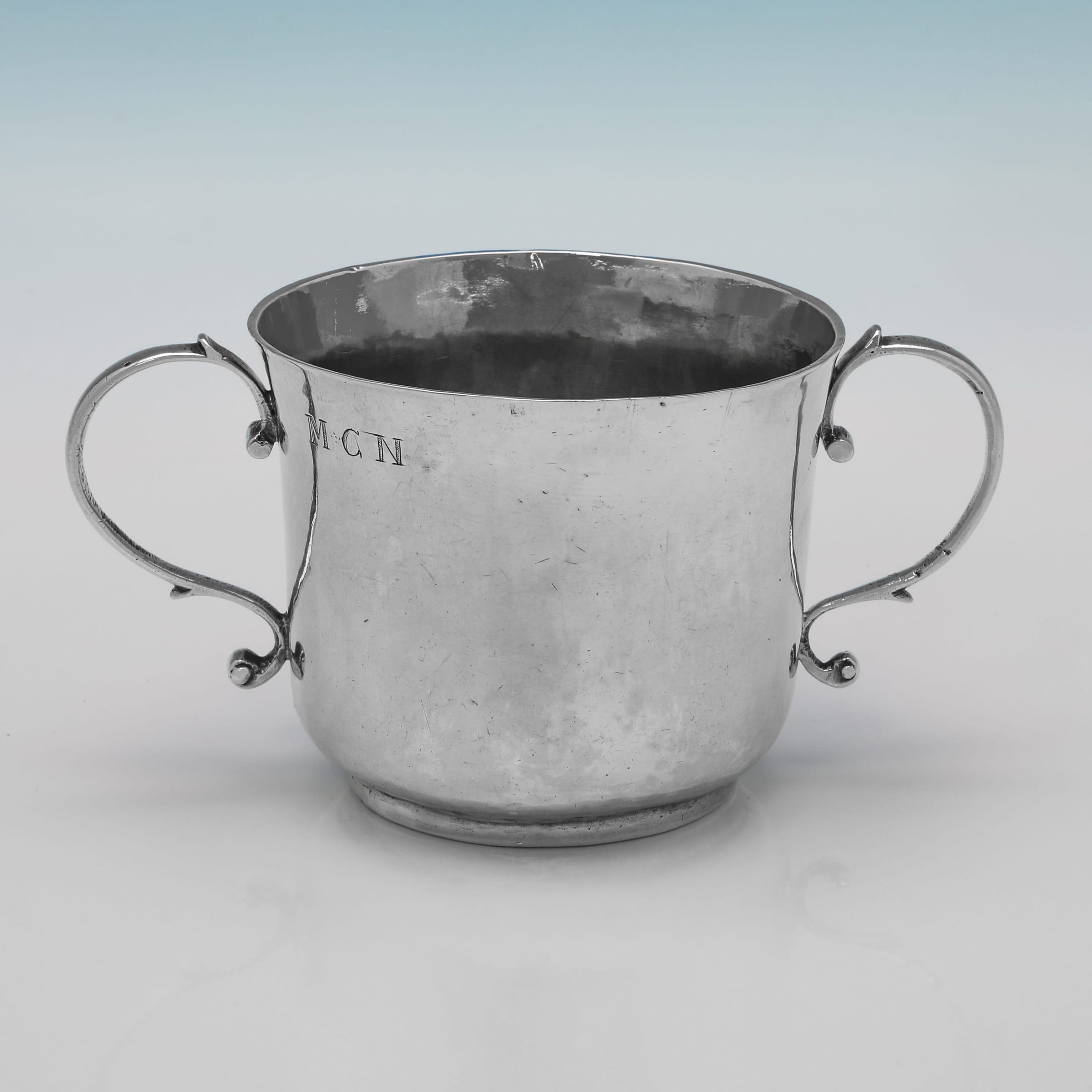 L9259: Hallmarked in London in 1688 this rare James II antique sterling silver porringer is of a classic circular form with a pedestal base and scroll handles. The side and base are both engraved with owners initials. It measures 3"(7.5cm) tall by 6"(15.5cm) over the handles and 3.75"(9.5cm) deep, and weighs 5 troy ounces.