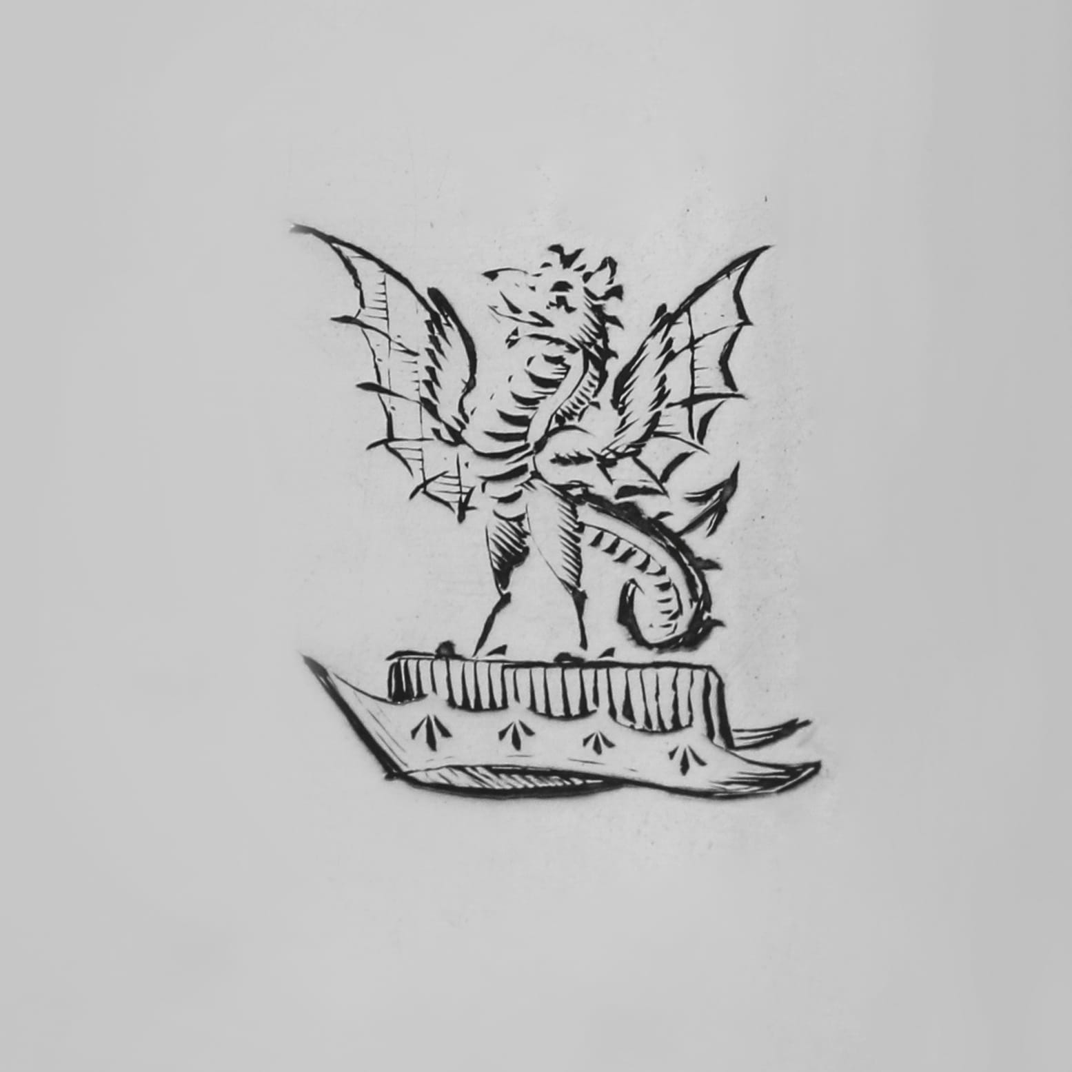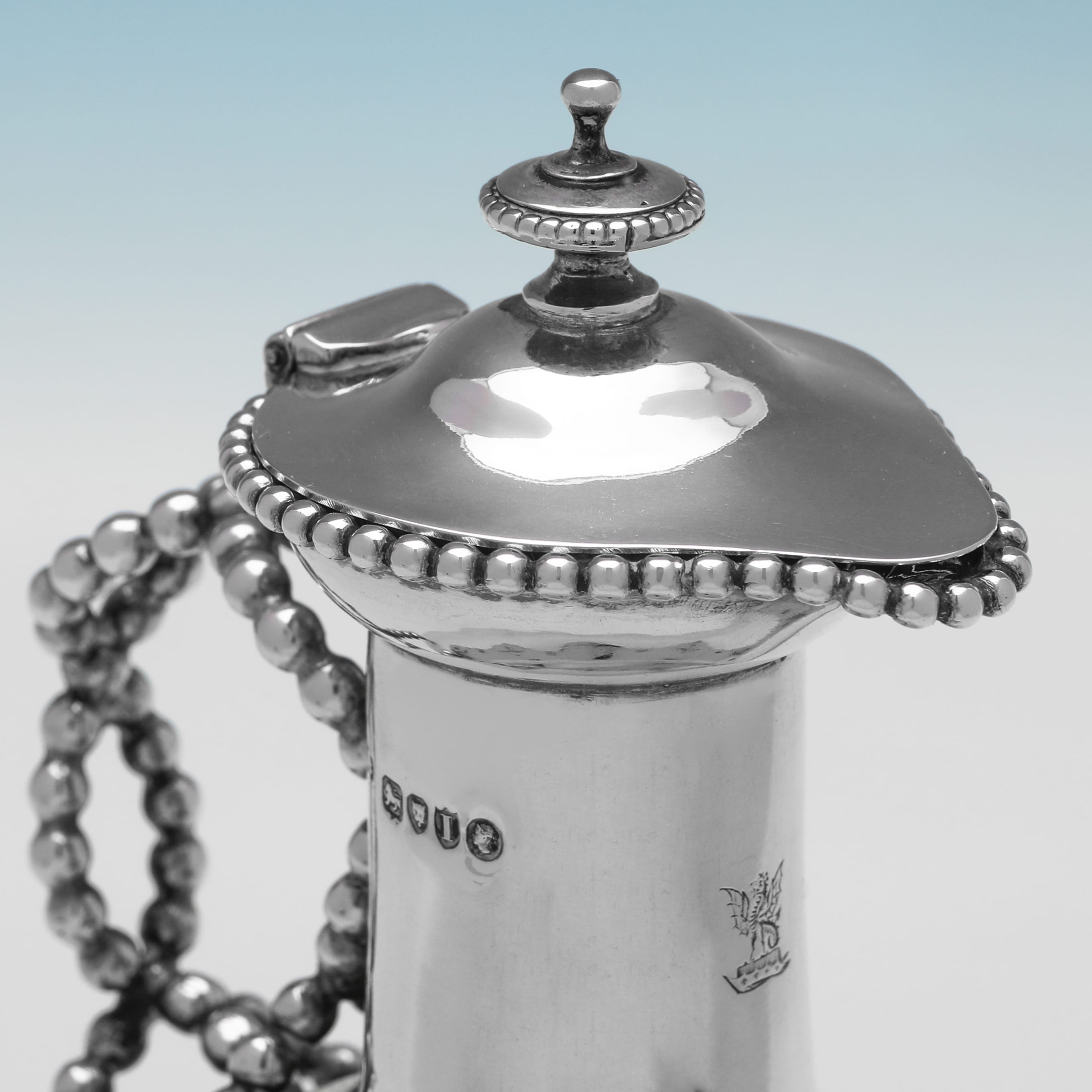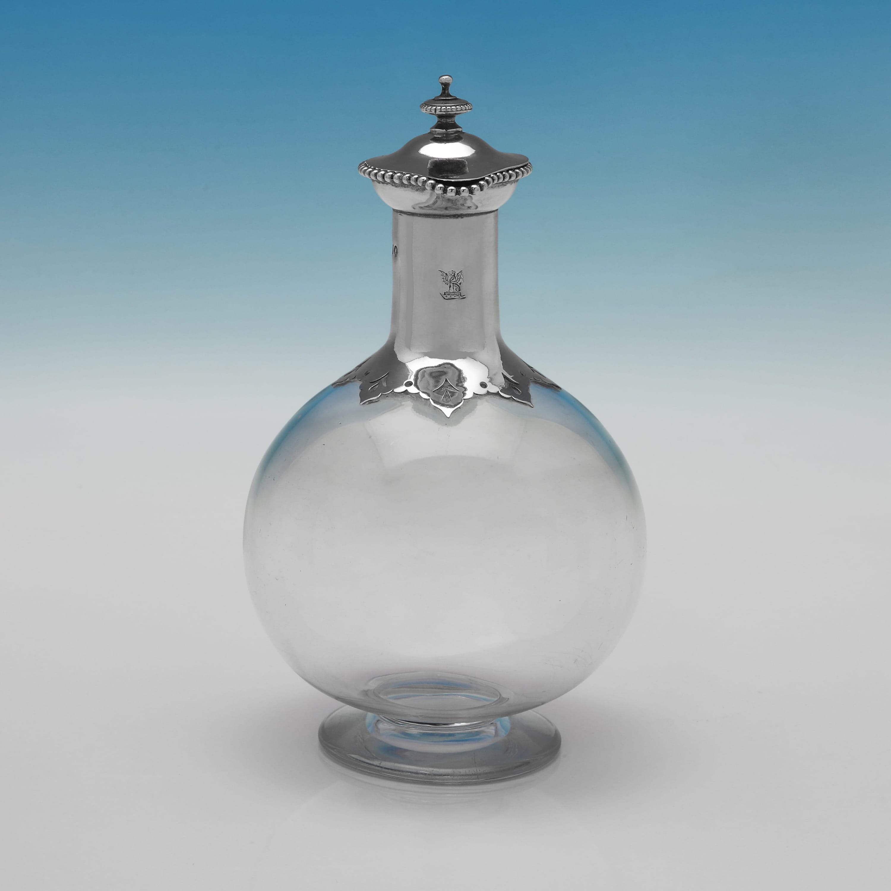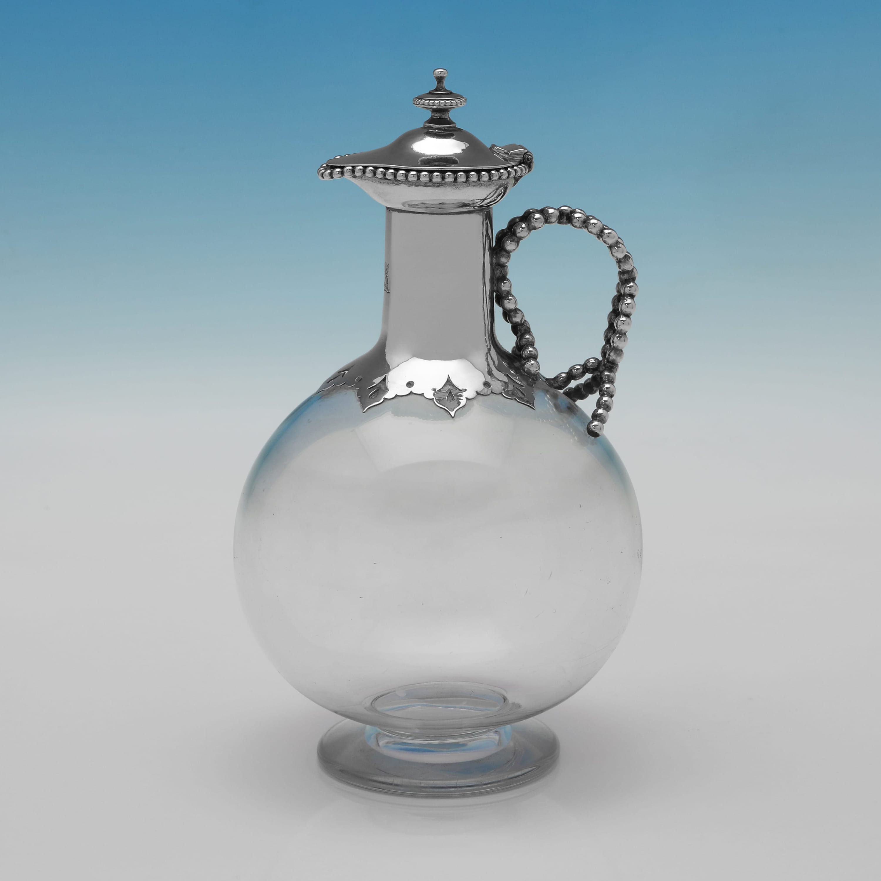 L9393: Hallmarked in London in 1884 by John Septimus Beresford this elegant Victorian antique sterling silver and glass pair of claret jugs is of a globular form standing on a pedestal foot. The jugs feature a silver neck and hinged lid with a bead border and a striking beaded handle. Each neck is engraved with a wyvern on a chapeau crest, and the interior of the lids are gilt-washed. Each jug measures 8.75"(22cm) tall by 5"(13cm) in diameter.