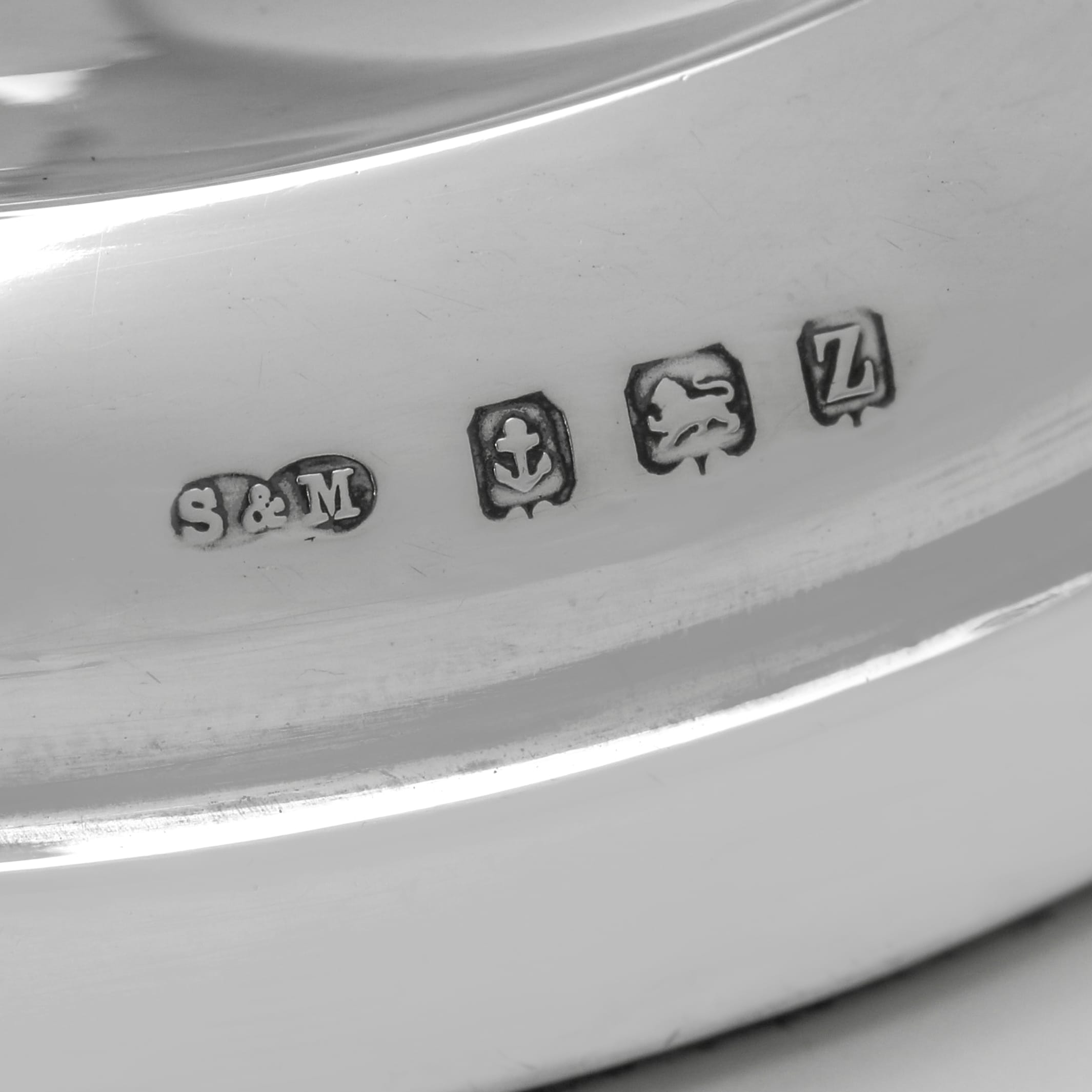 L9412: Hallmarked in Birmingham in 1924 by Saunders & Mckenzie this elegant George V antique sterling silver pair of candlesticks is of a classic design with a circular stepped foot and a shallow drip pan, featuring a distinctive barley-twist stem. Each candlestick measures 7.5"(19cm) tall, by 3.5"(9cm) in diameter, and the pair is weighted for balance.
